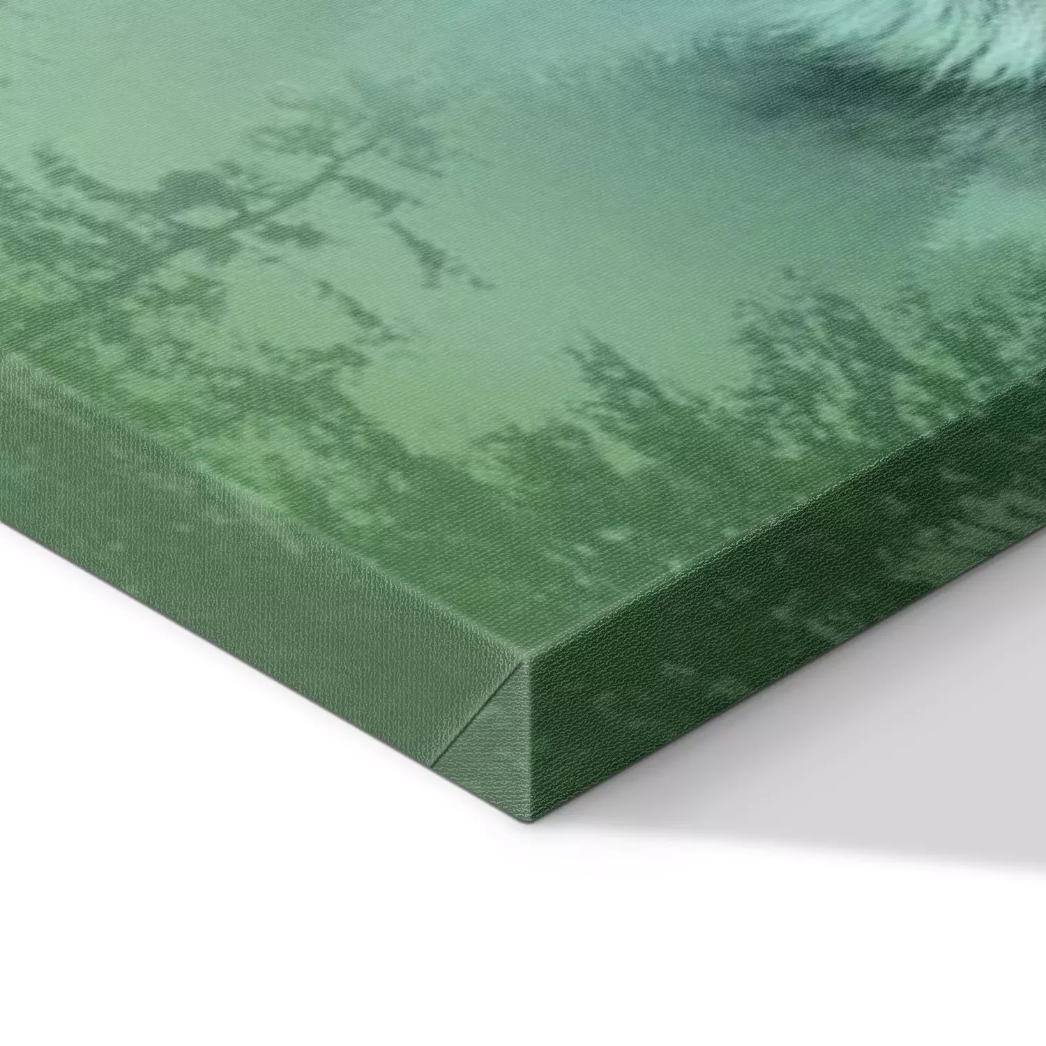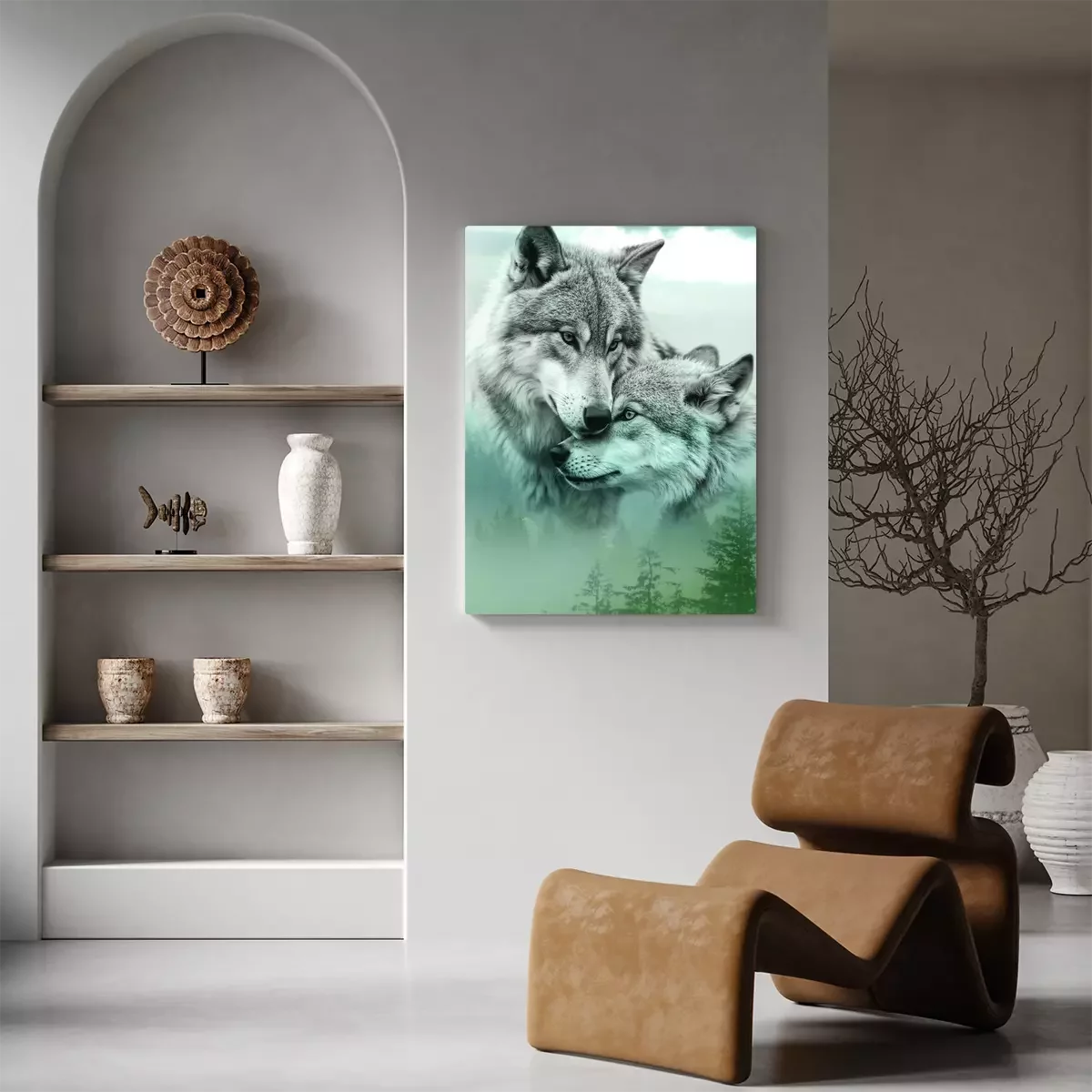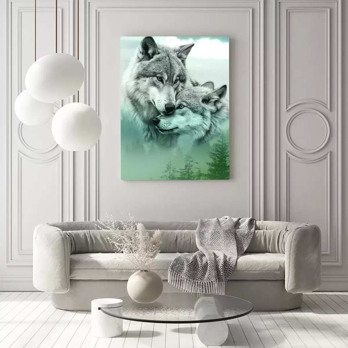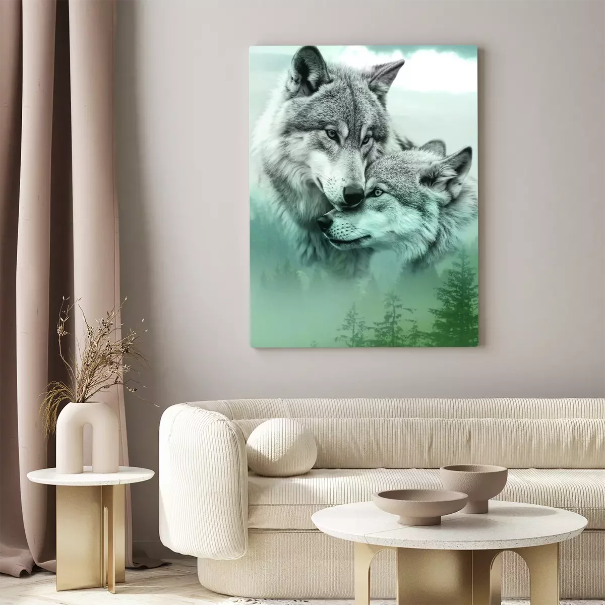 Geheimnisvolle wölfe im nebel eines dichten nadelwaldes