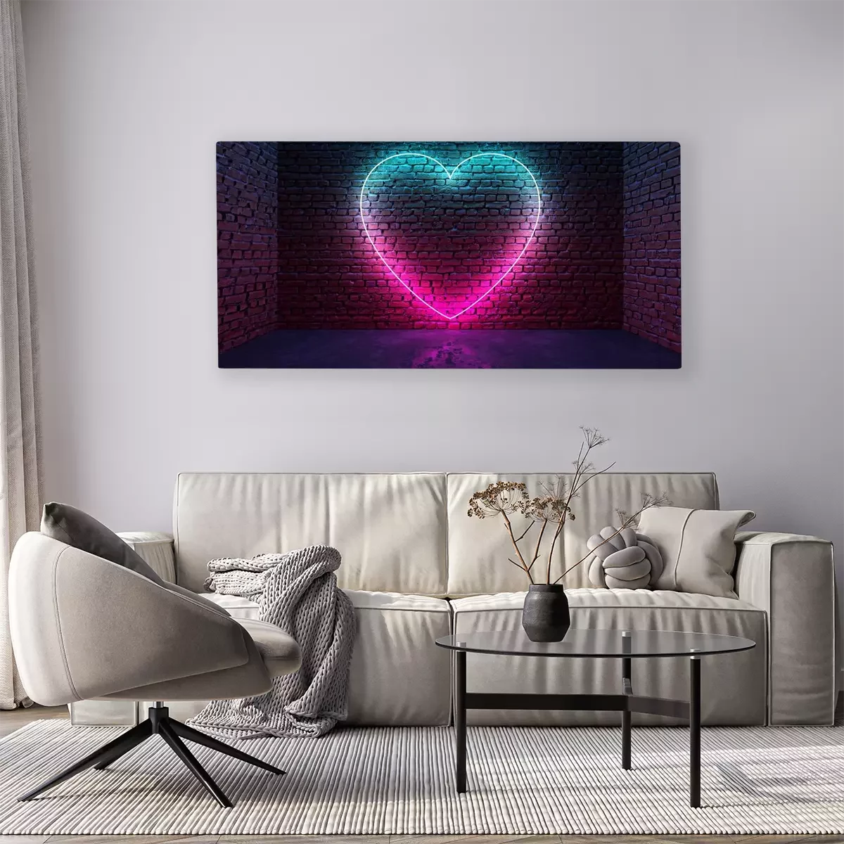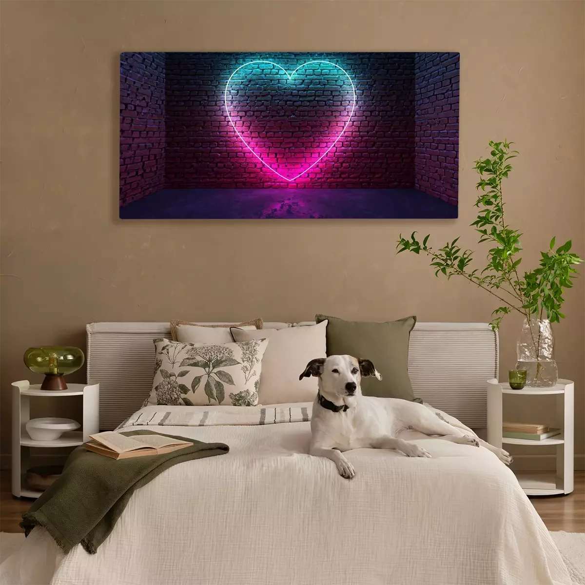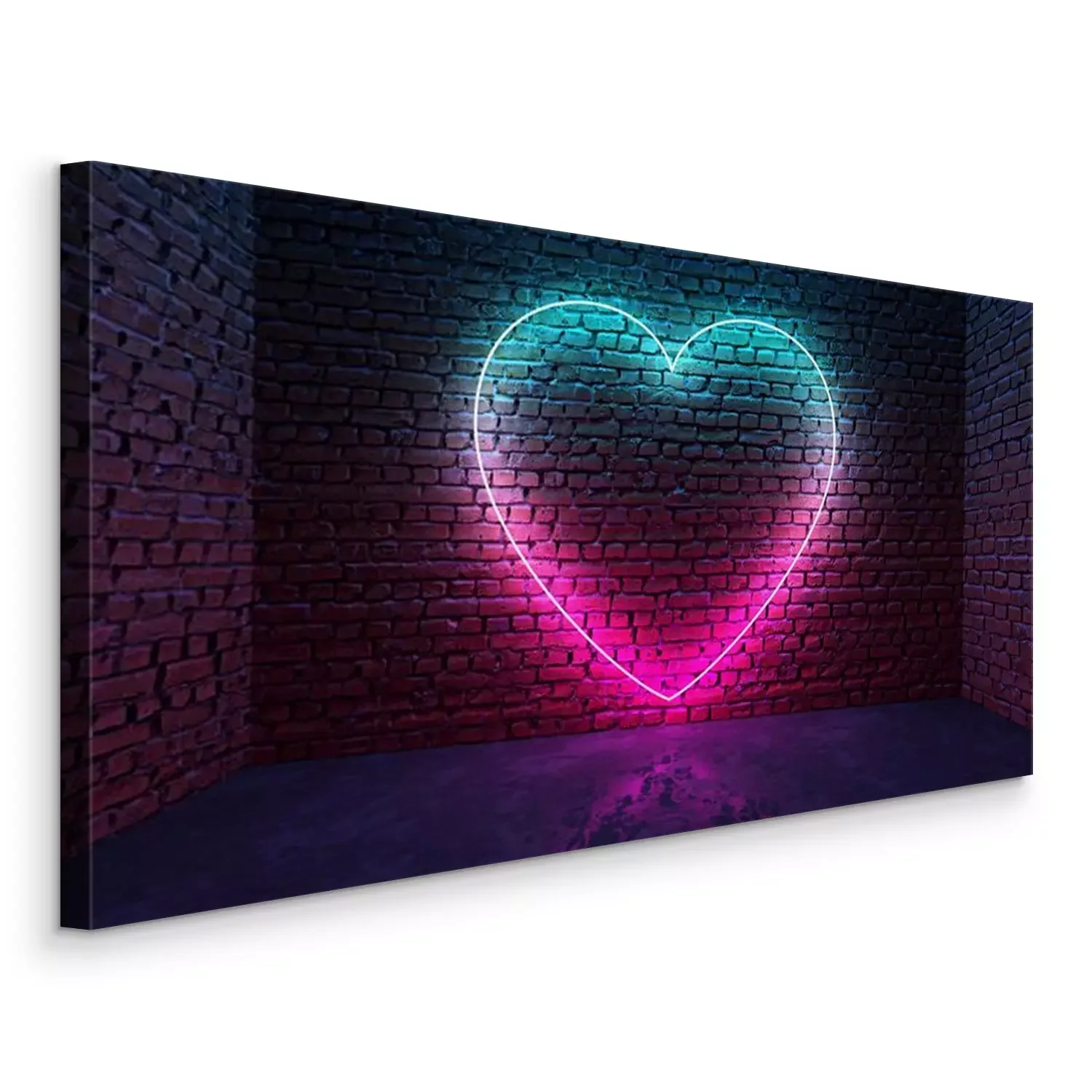 Bild: Glowing neon heart shaped like icon on brick wall in dark room