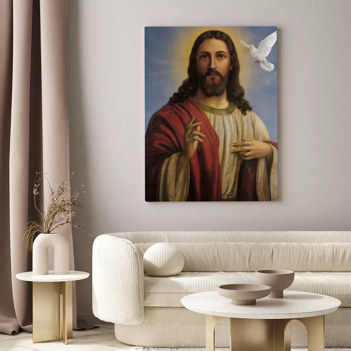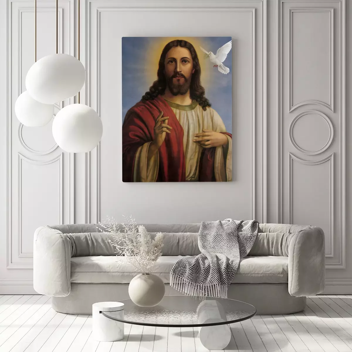 Göttlicher erlöser mit einem weißen vogel
