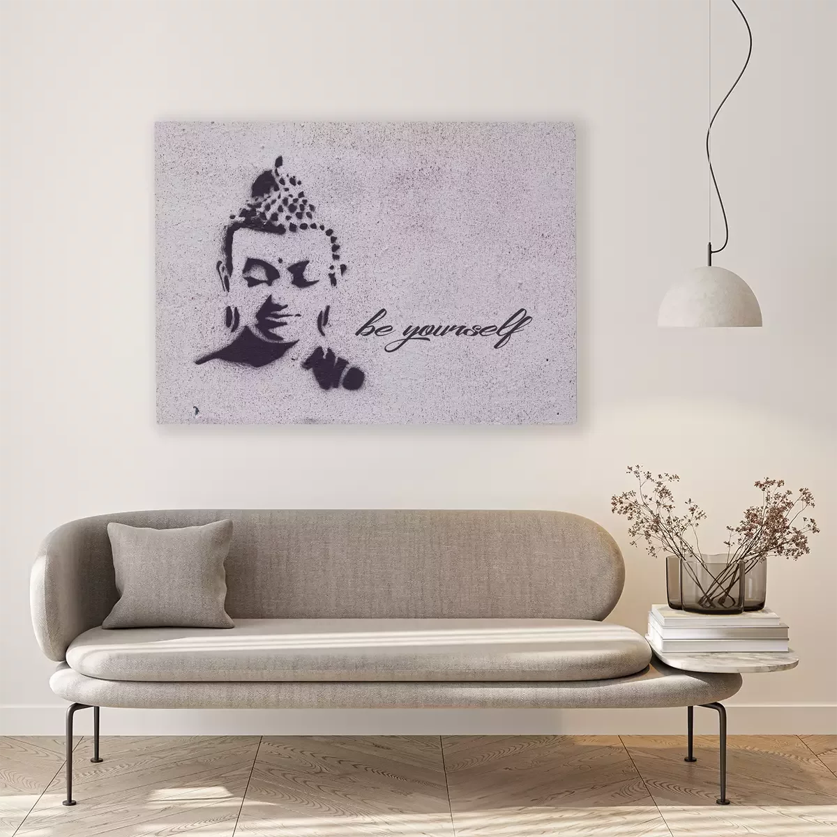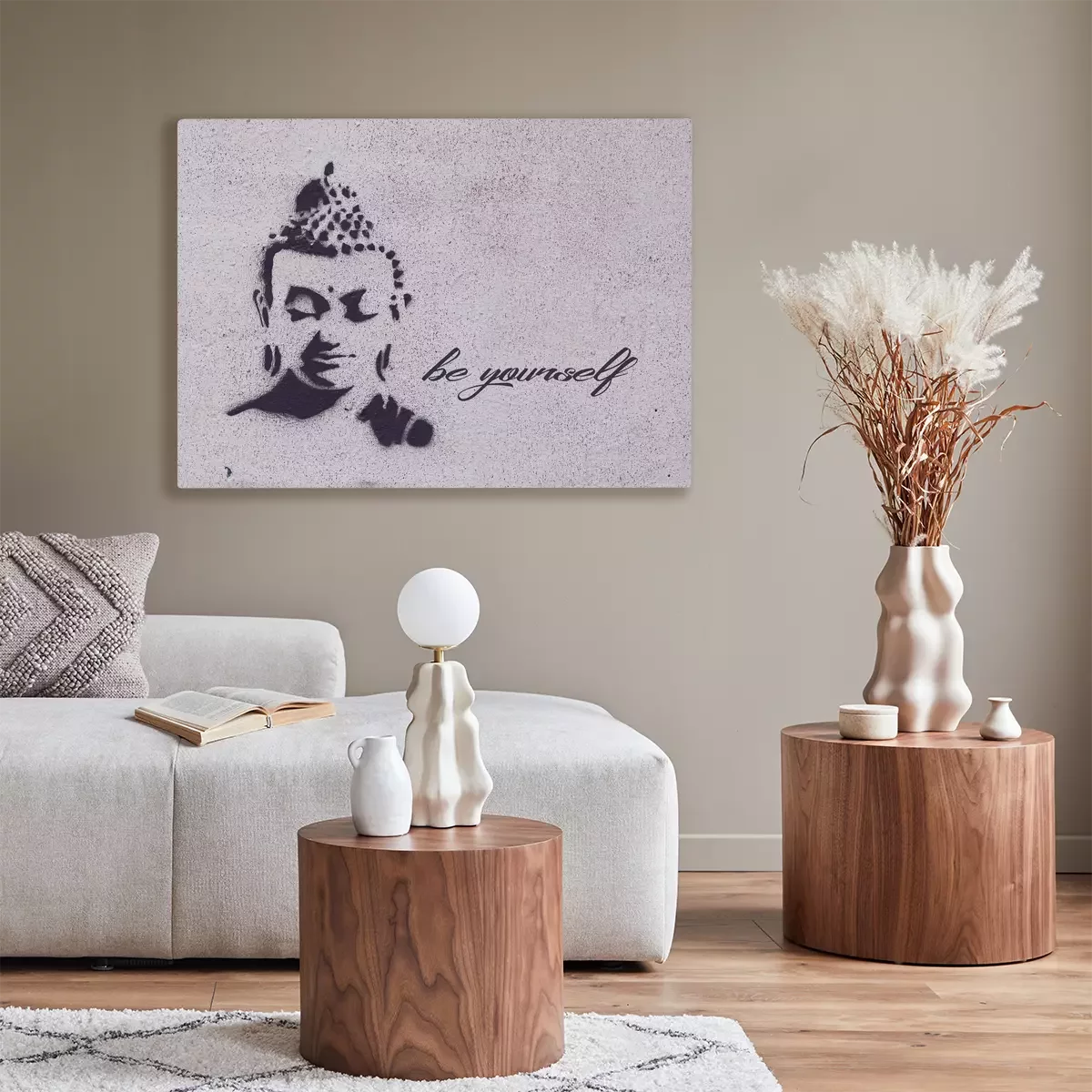 Graffiti eines buddha-gesichts mit dem text "sei du selbst"