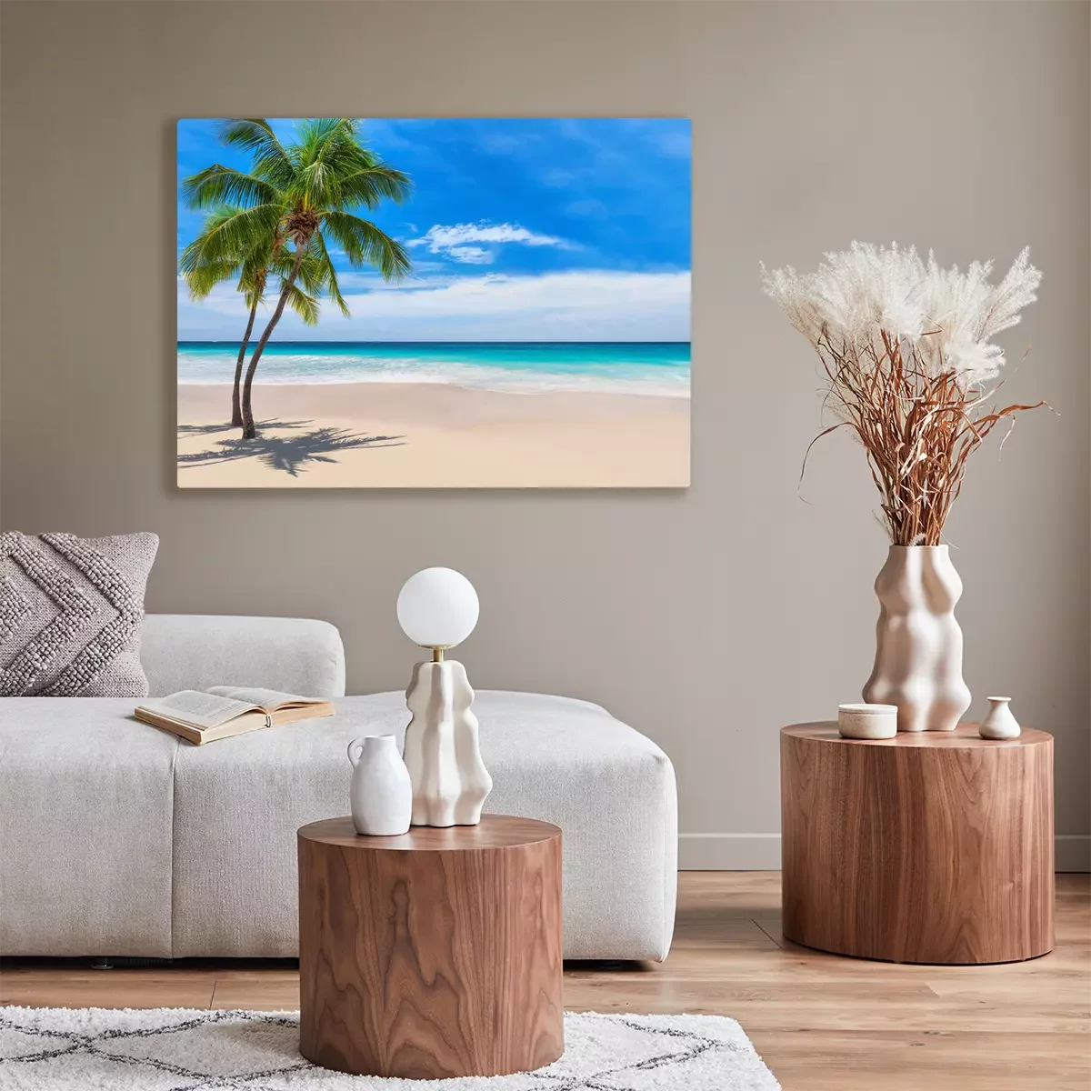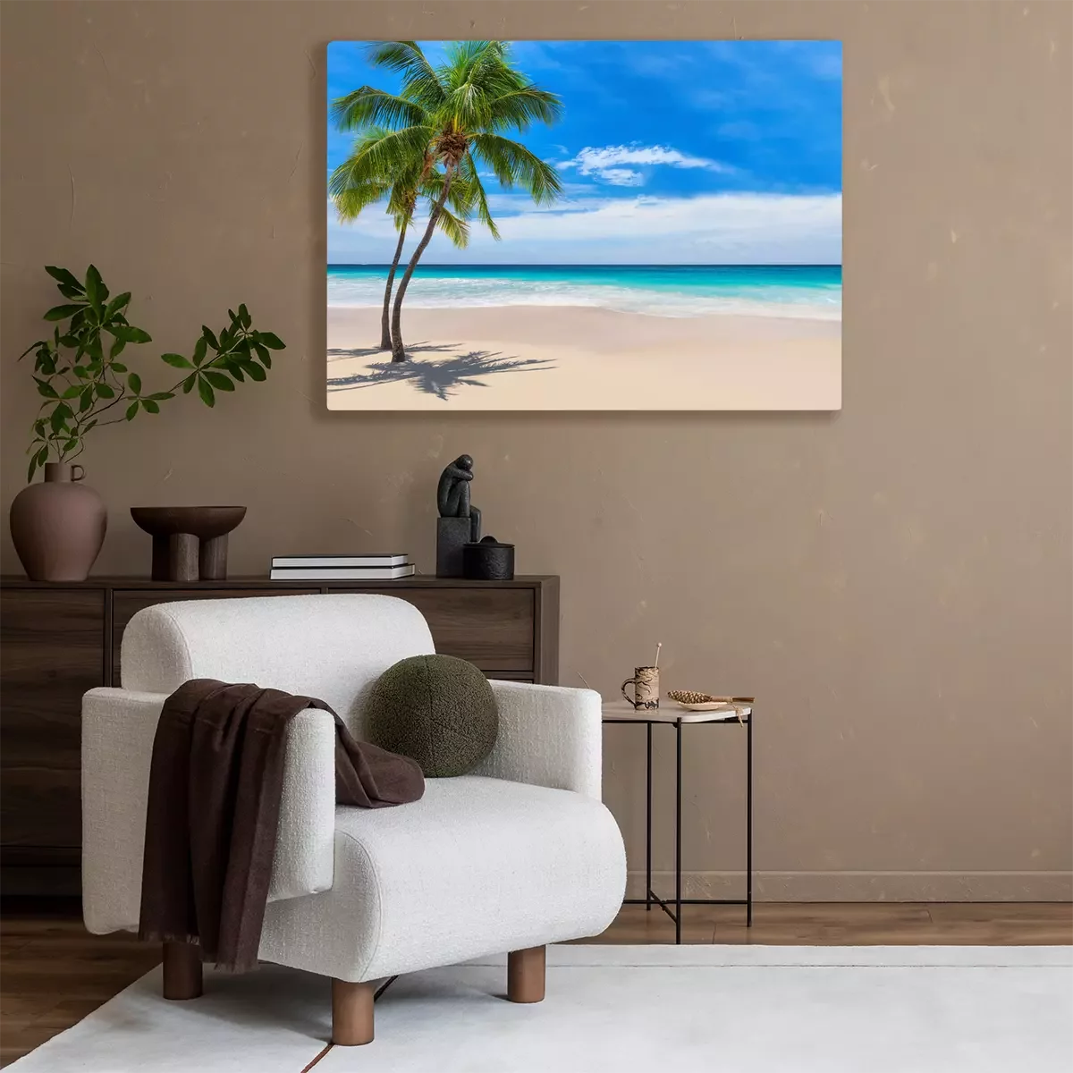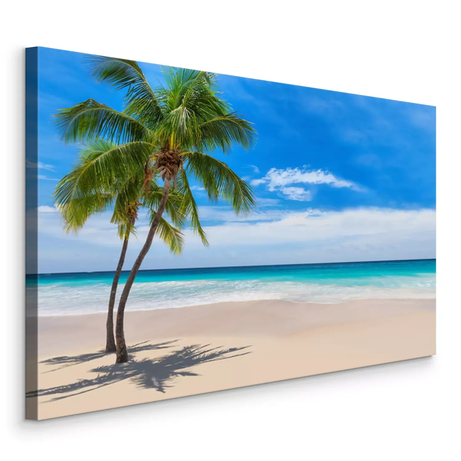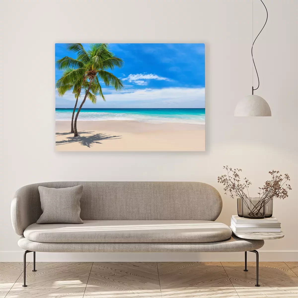 Tropical white sand beach with coco palms and the turquoise sea on Caribbean island.