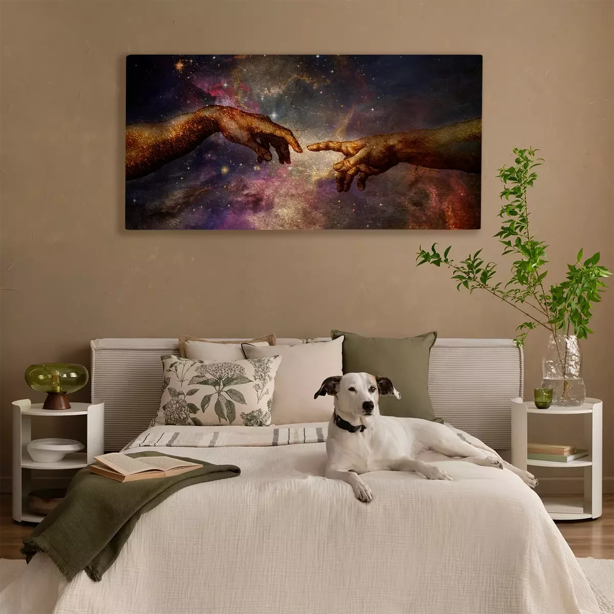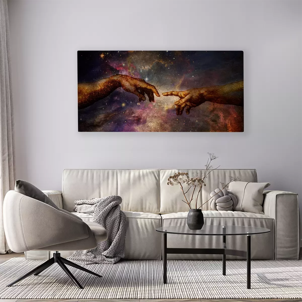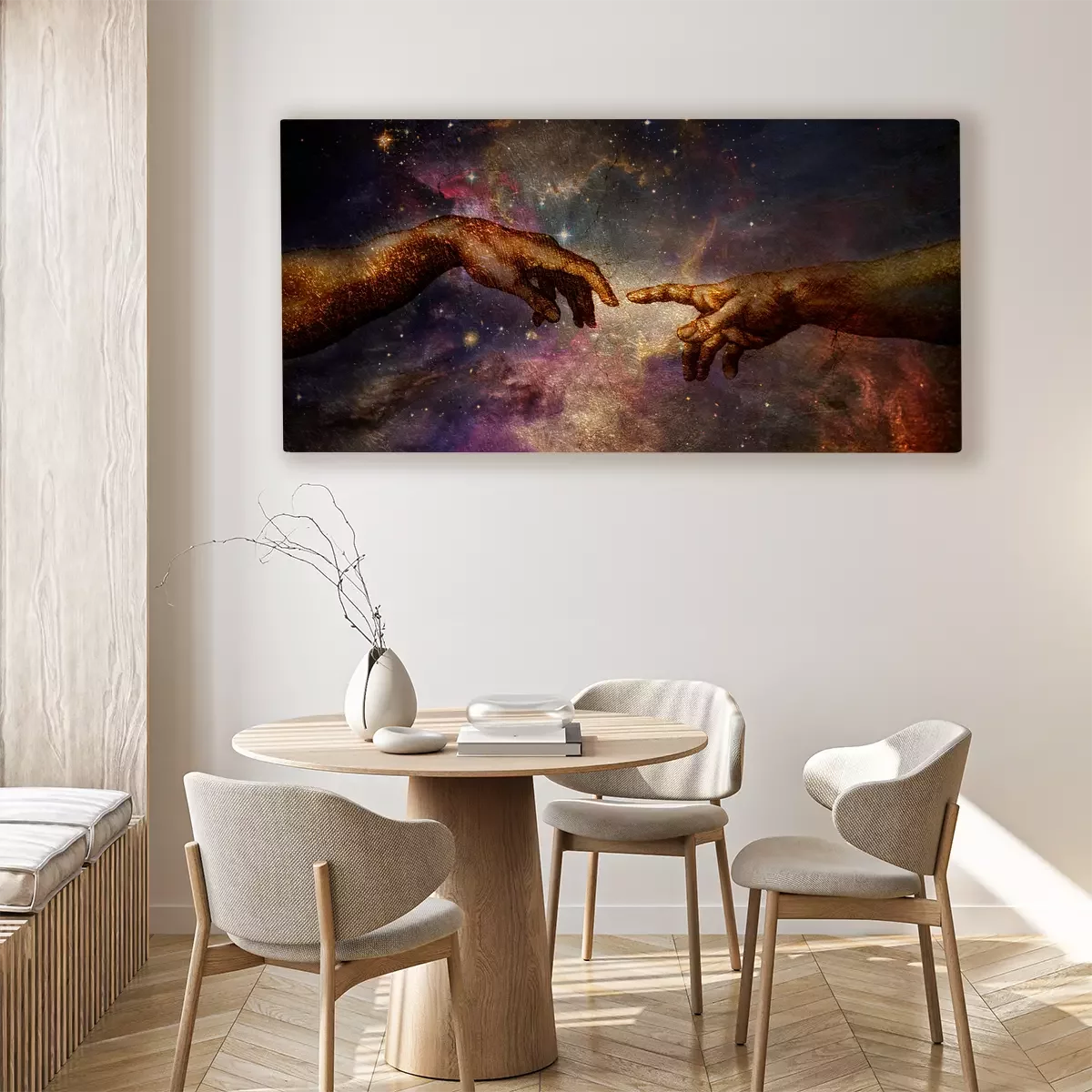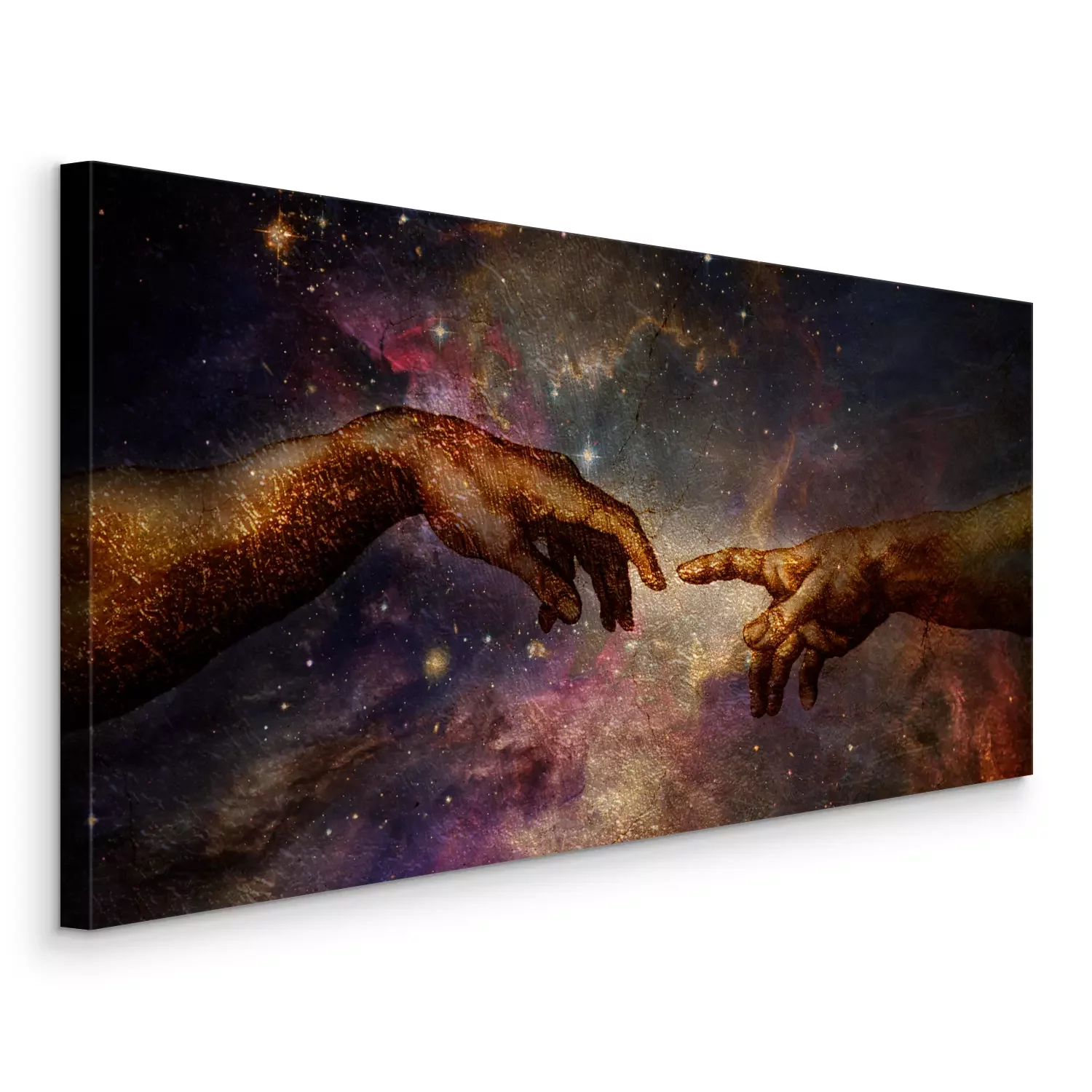 Hände aus der erschaffung adams vor einem kosmischen hintergrund