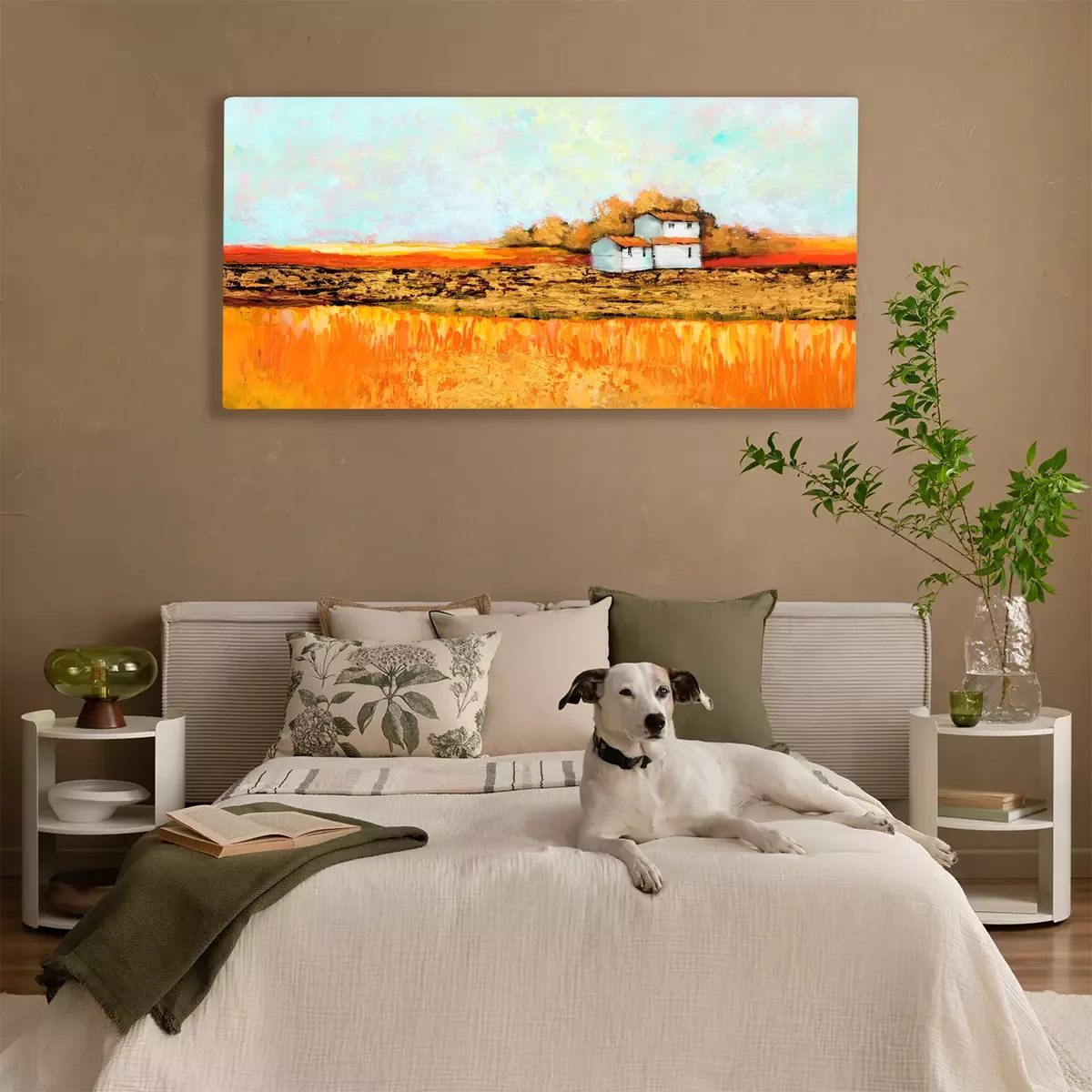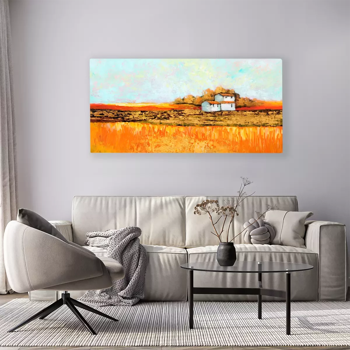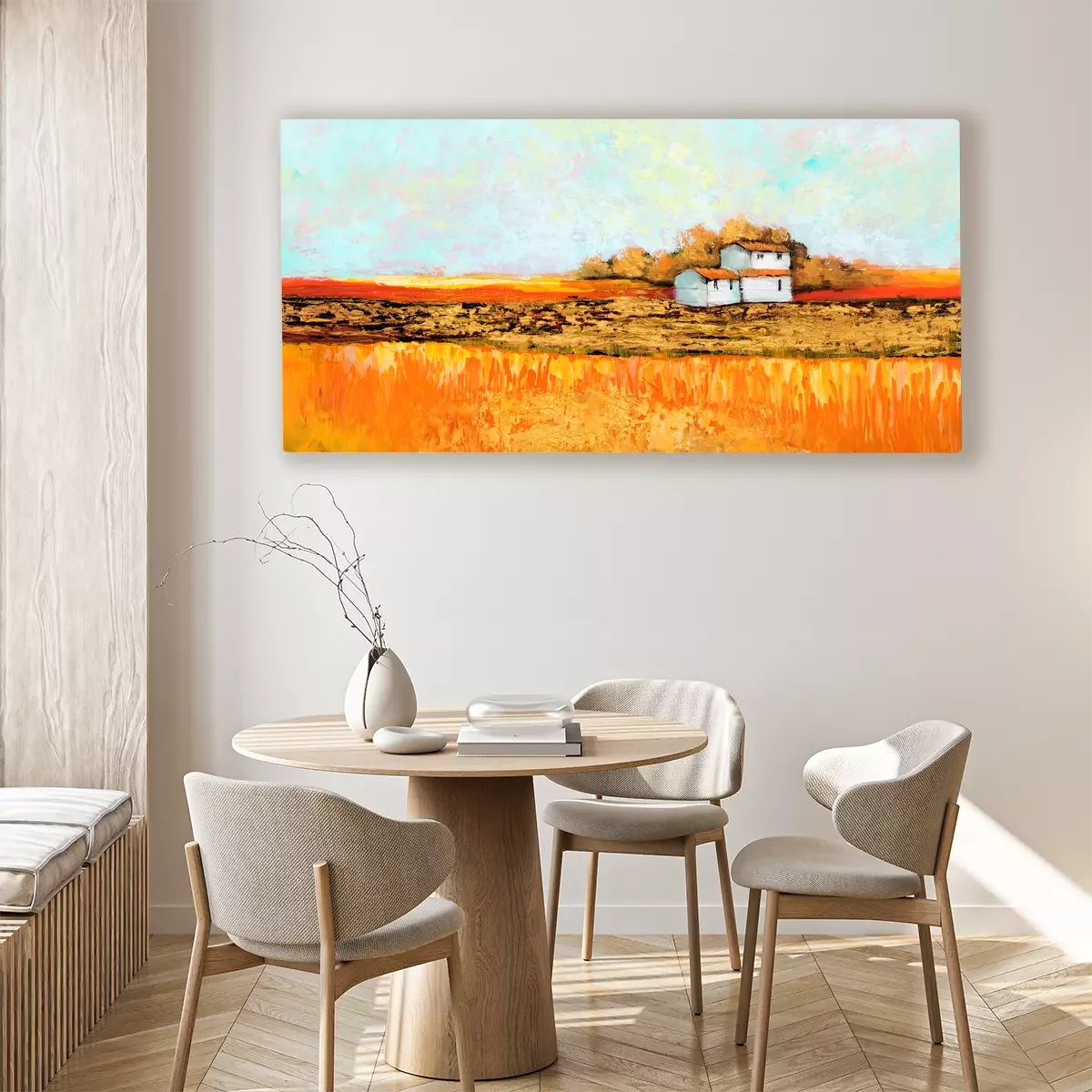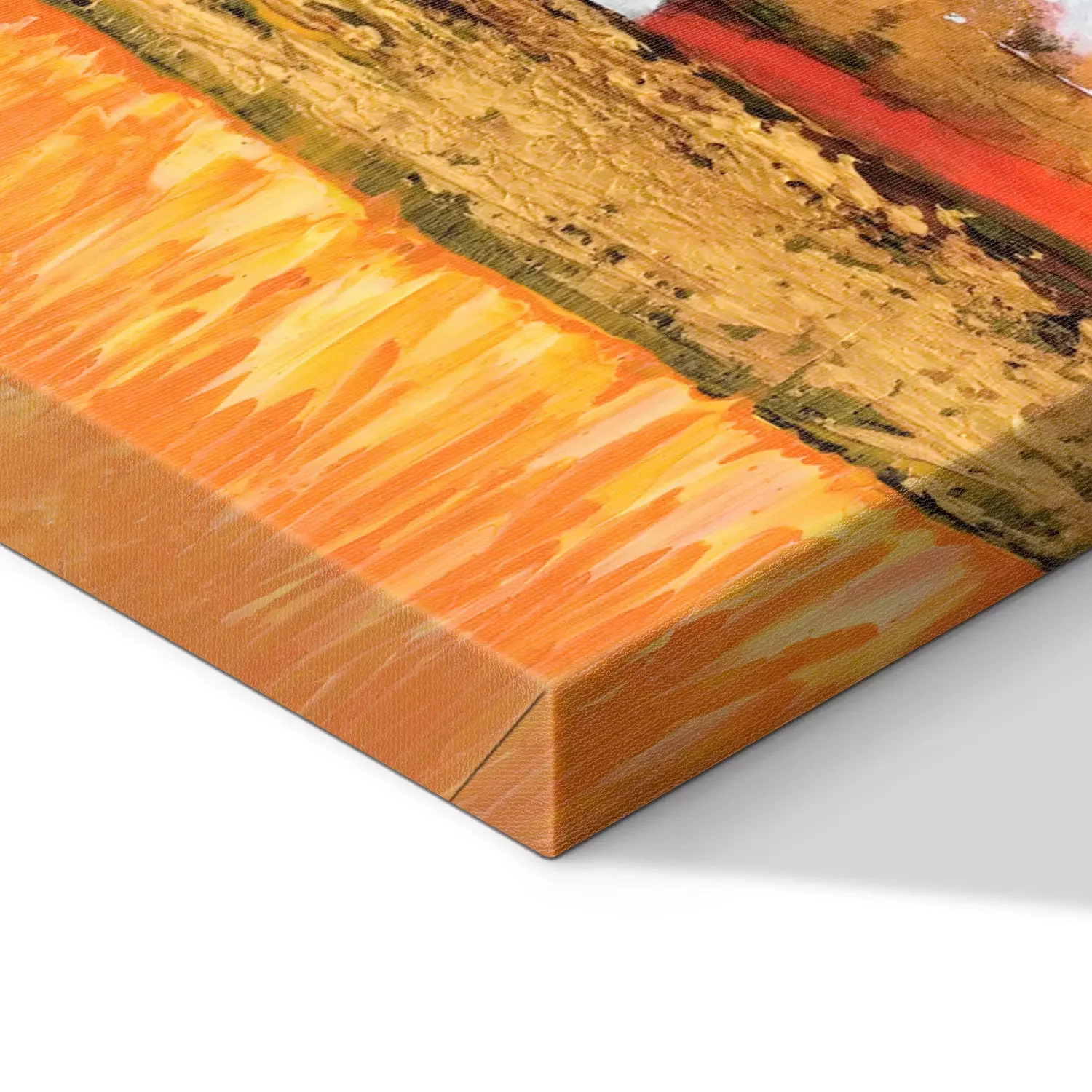 Häuser vor dem hintergrund goldener und orangefarbener felder