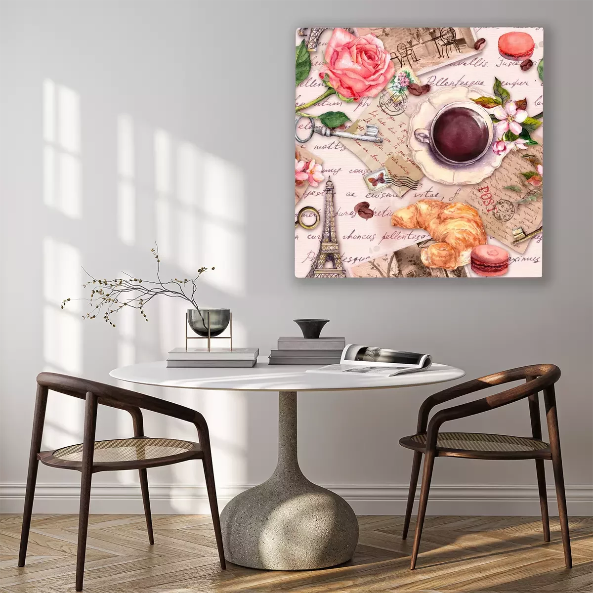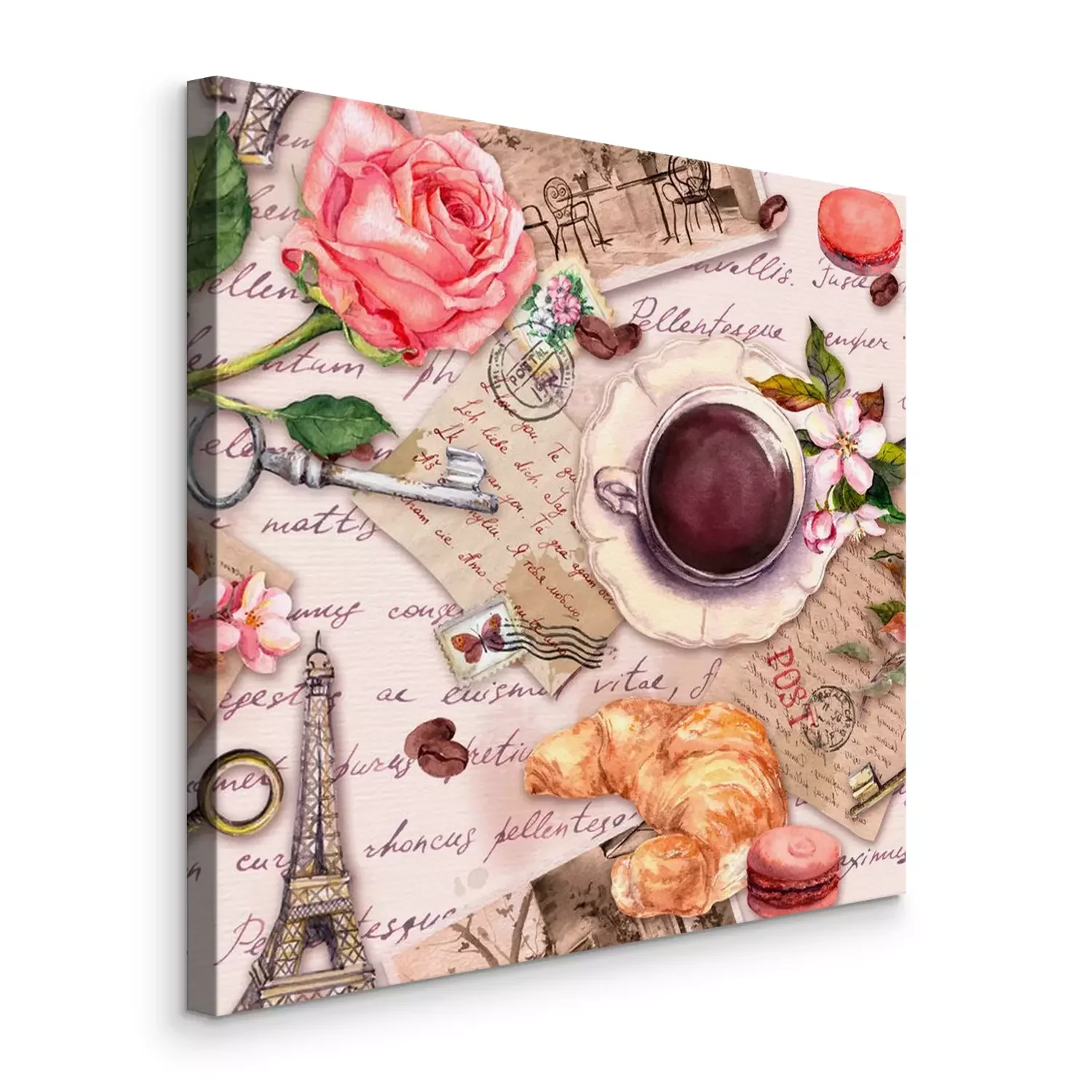 Bild Hand written letters, Eiffel Tower, coffee or tea cup, macaroon cakes, rose flowers, stamps and keys. Vintage seamless pattern