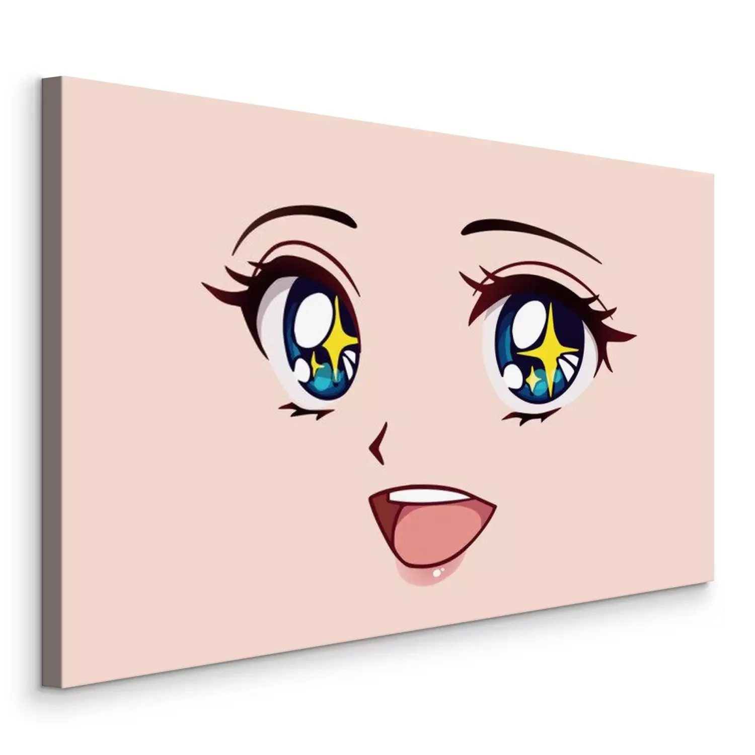 Bild Happy anime face. Manga style big blue eyes, little nose and big kawaii mouth. Yellow sparkles in her eyes.
