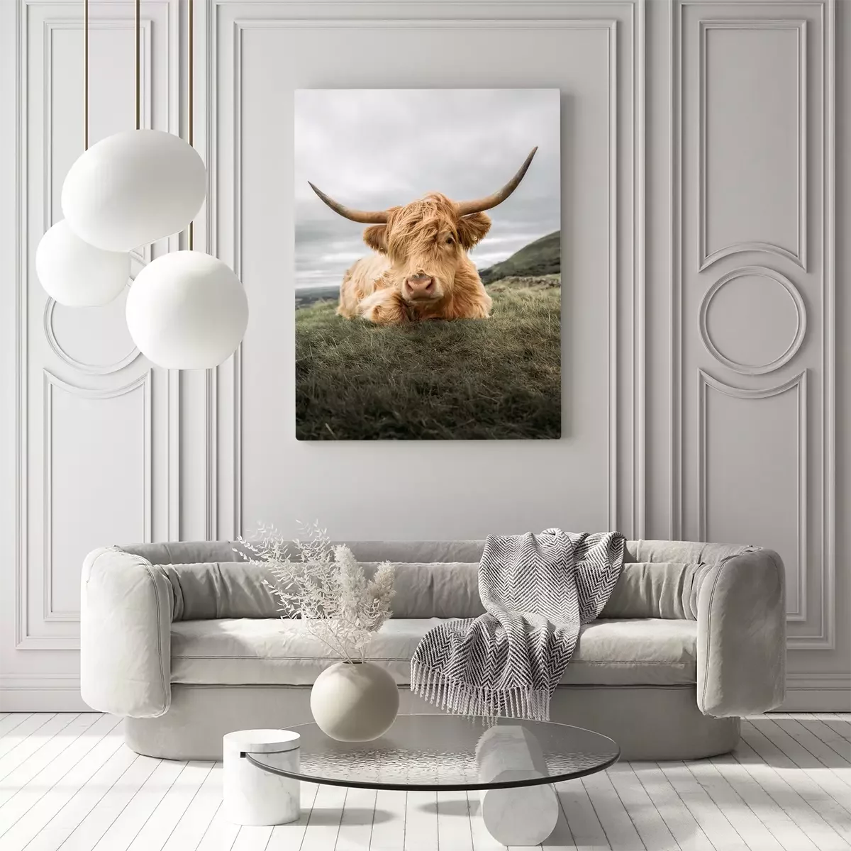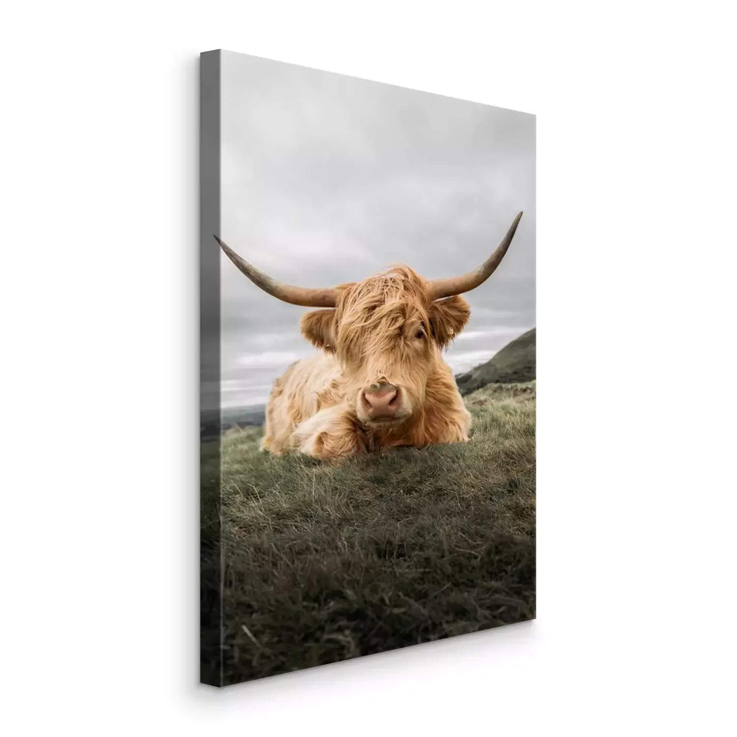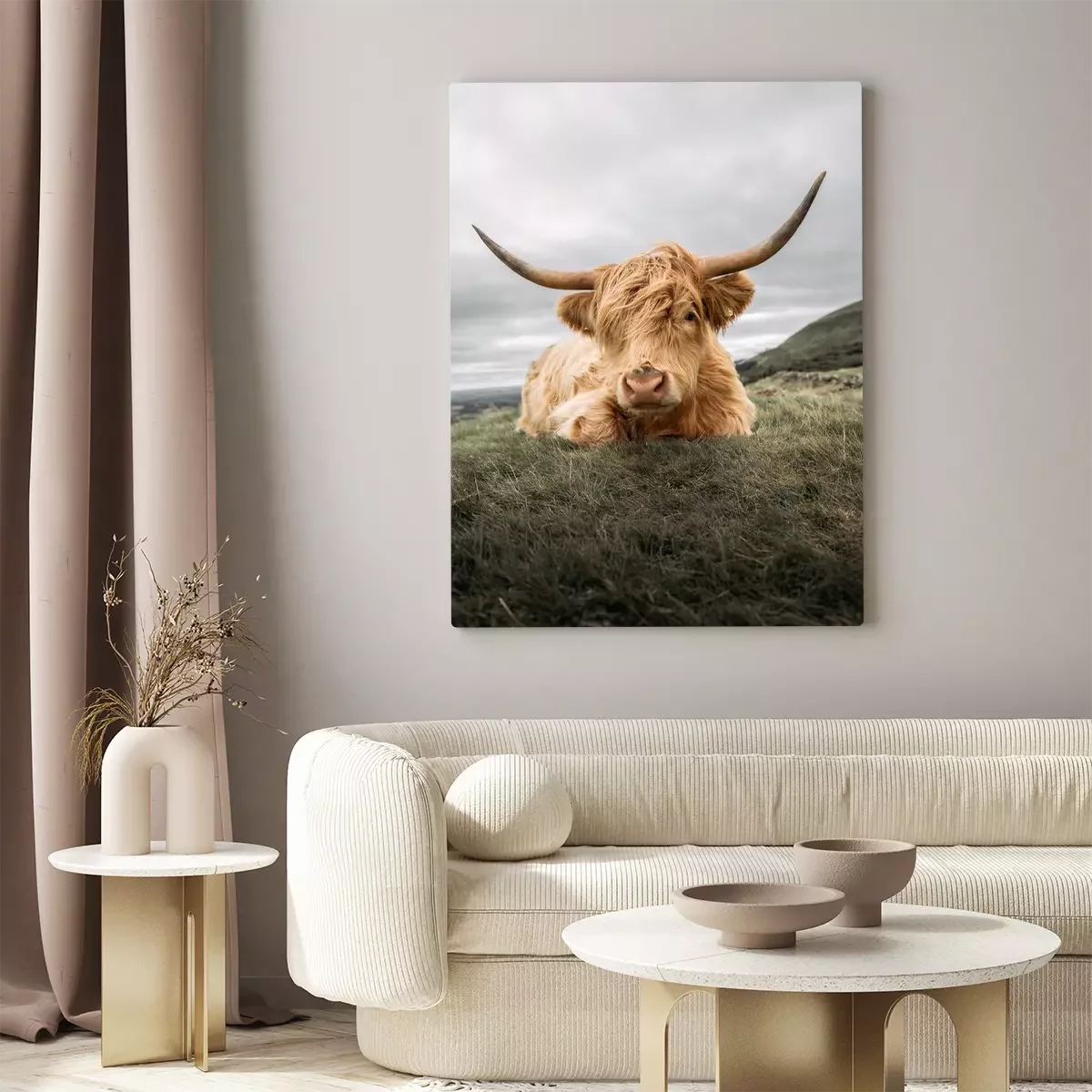 Bild: Hochlandkuh auf einem Hügel ruhend