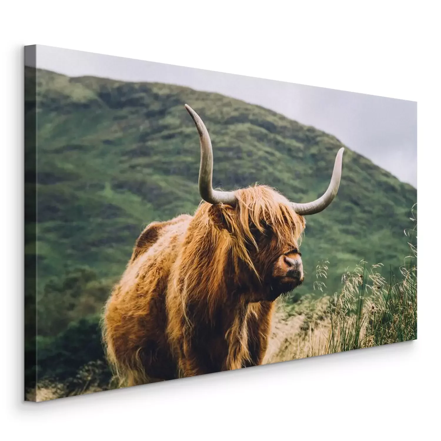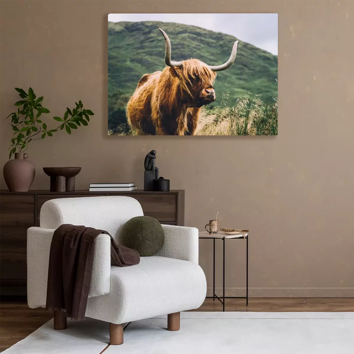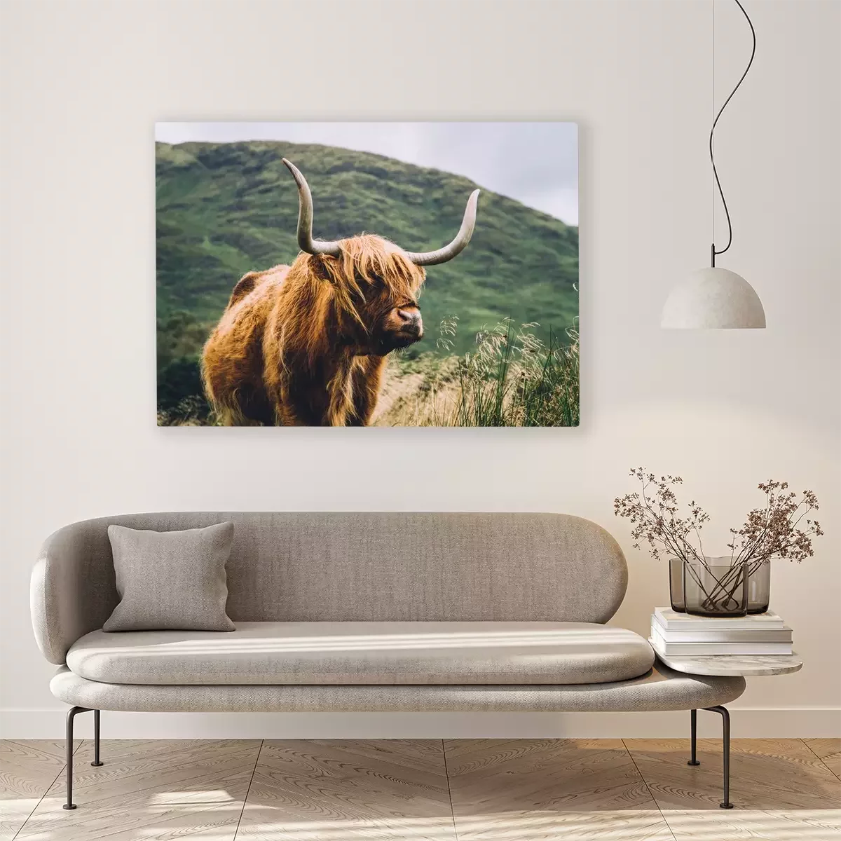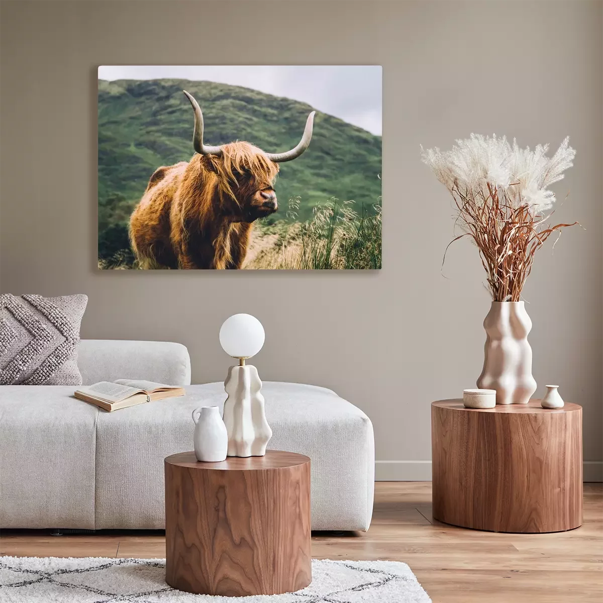 Bild: Hochlandkuh vor dem Hintergrund eines grünen Hügels
