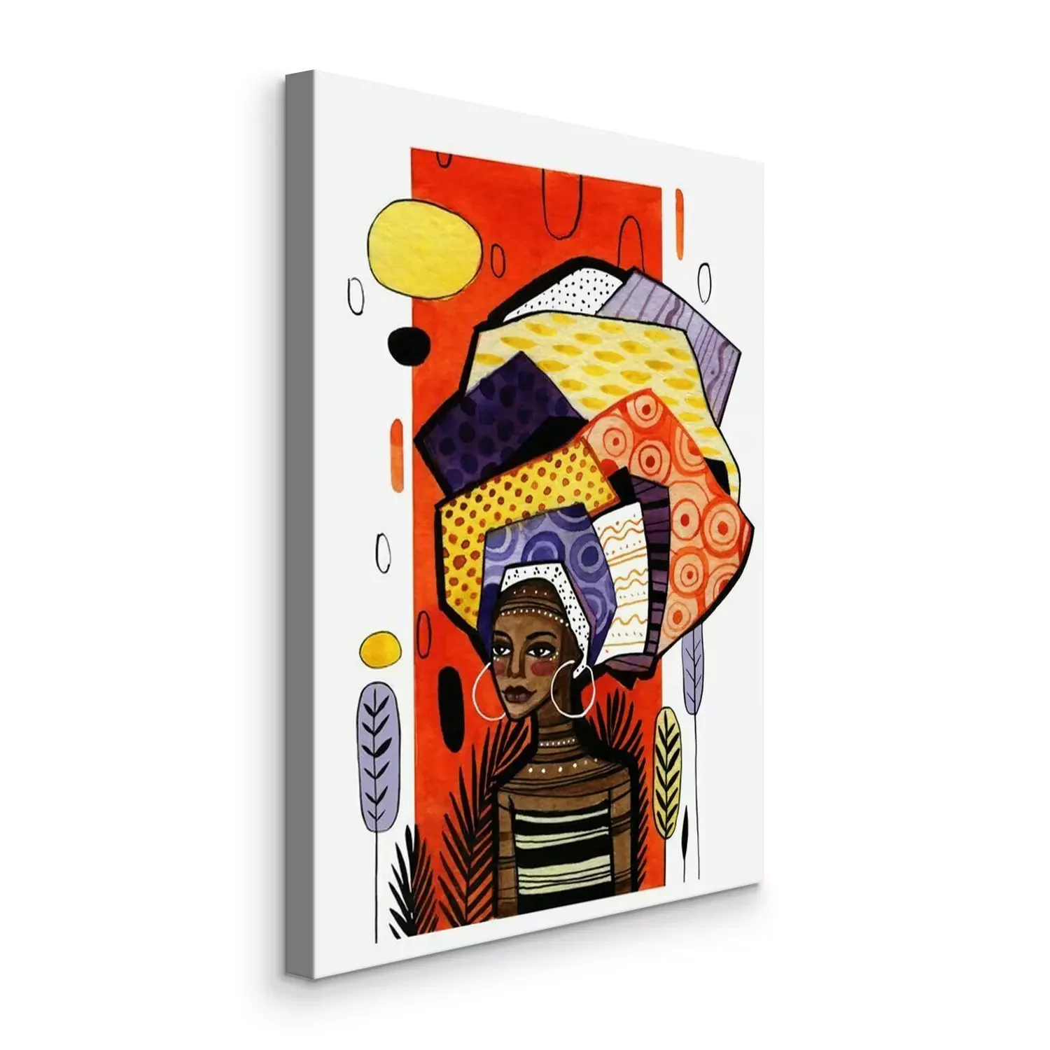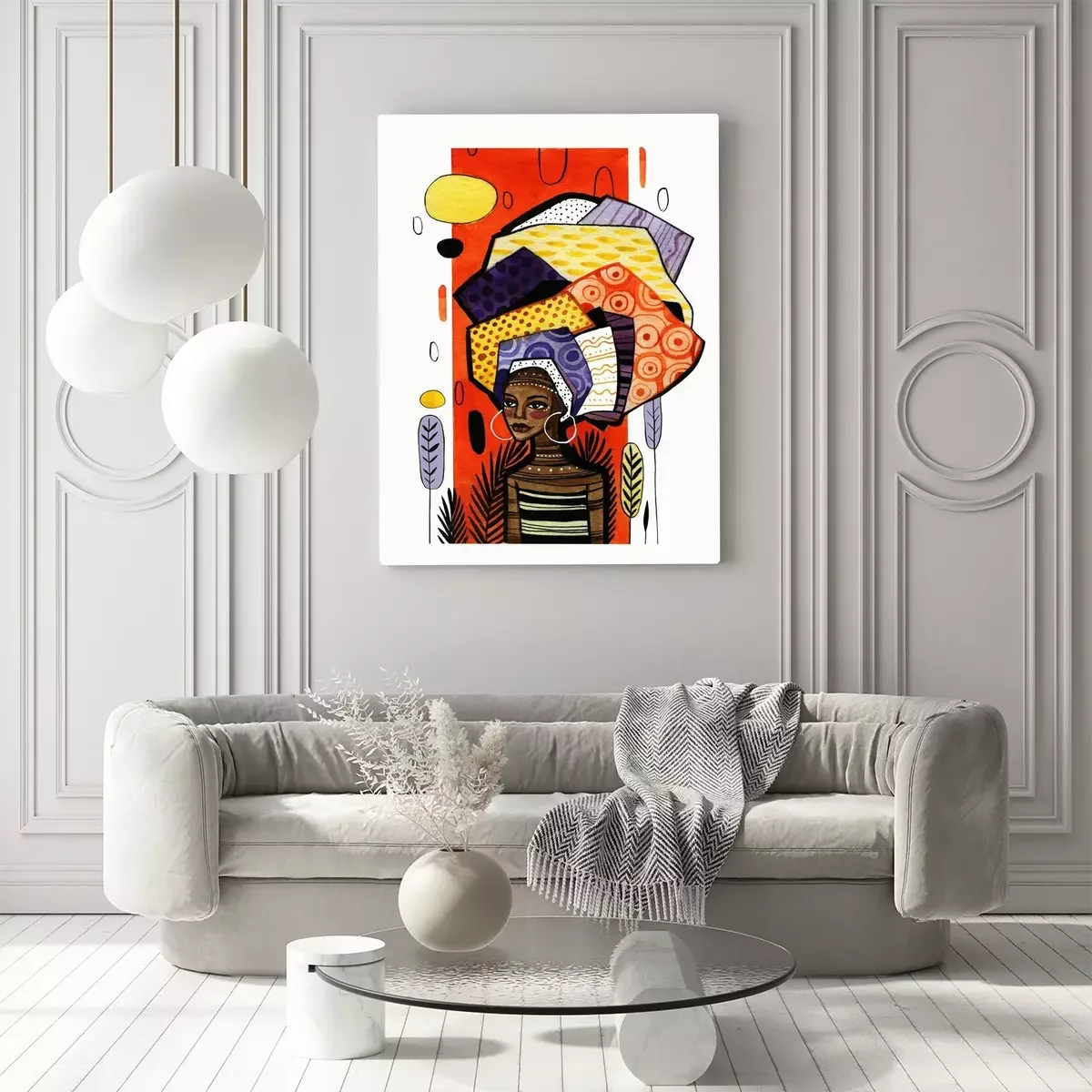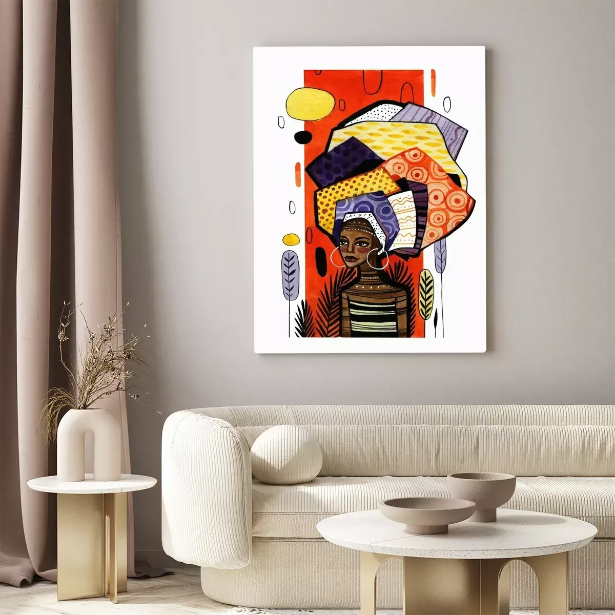 Bild: Illustration of an african american girl on a background of orange vertical stripe. Watercolor work with graphic elements is done in warm colors.