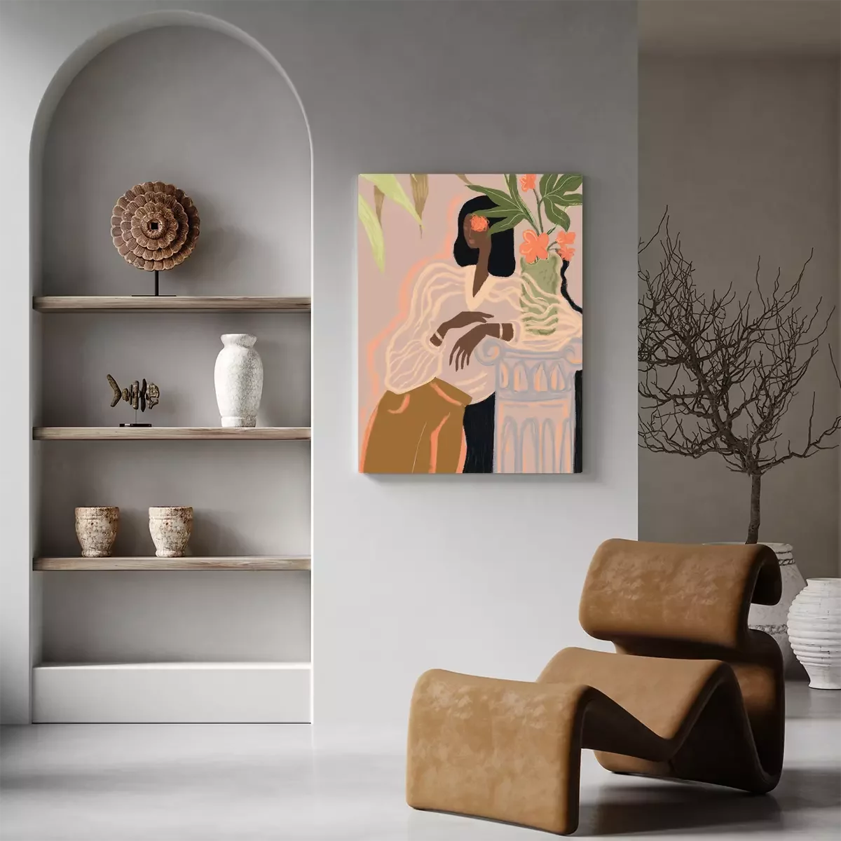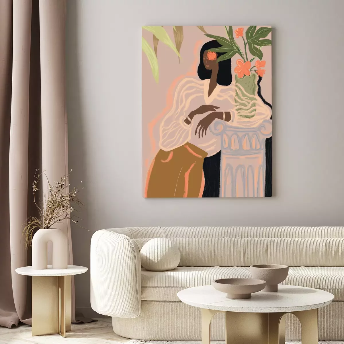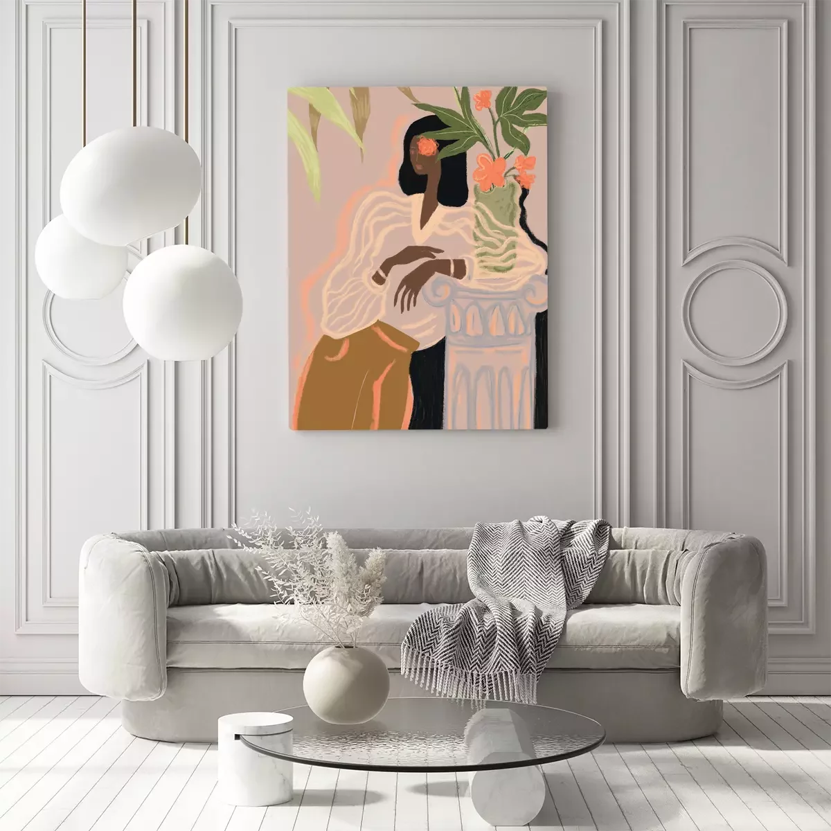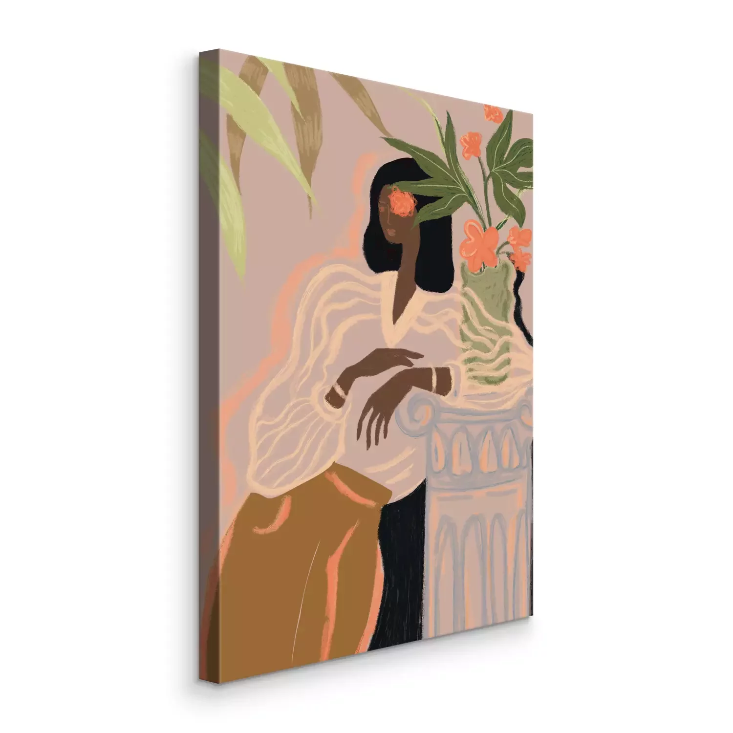 Illustriertes porträt einer frau, die sich an eine säule lehnt.