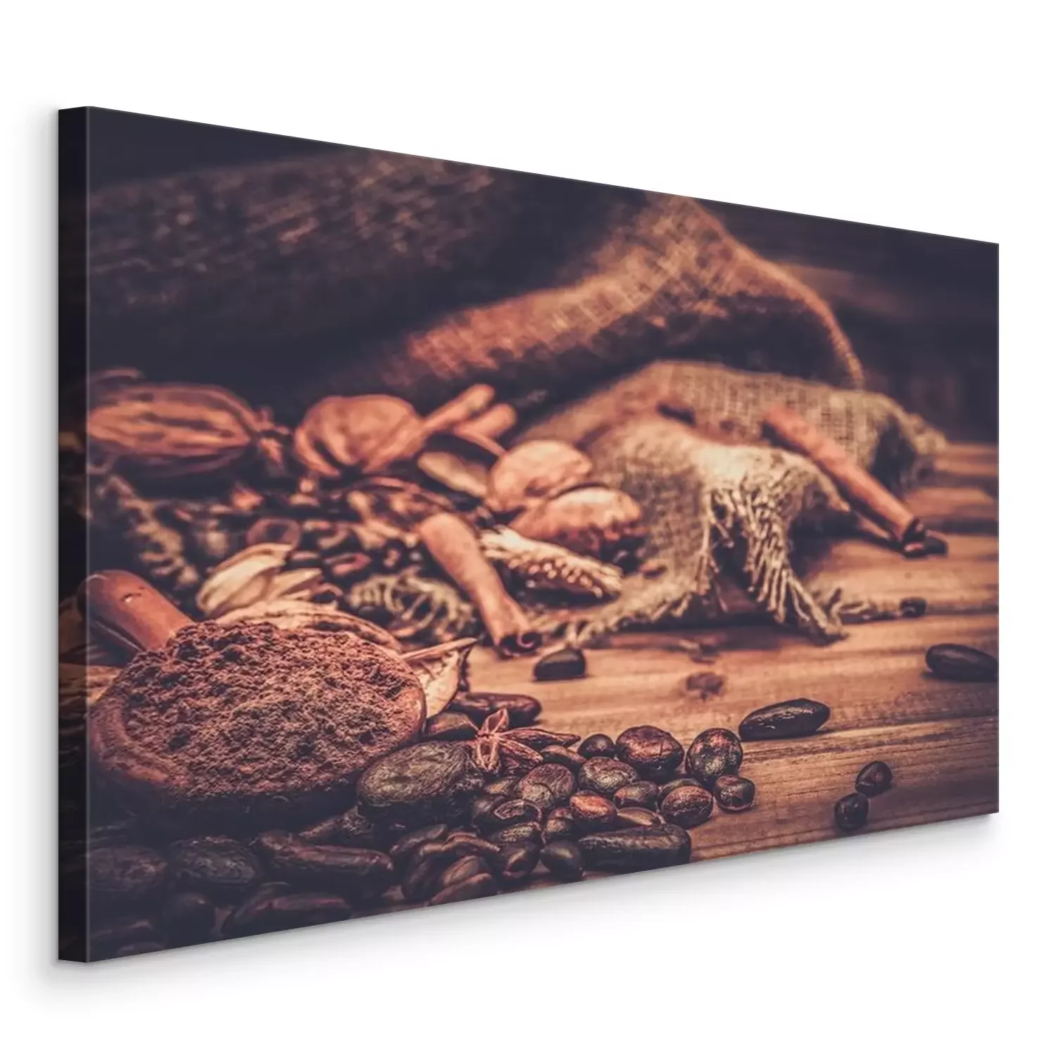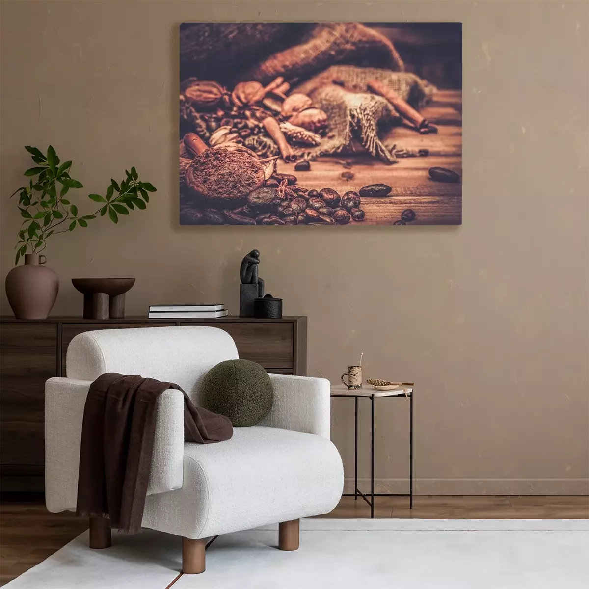 Kaffeebohnen inmitten von Zimt und Nüssen