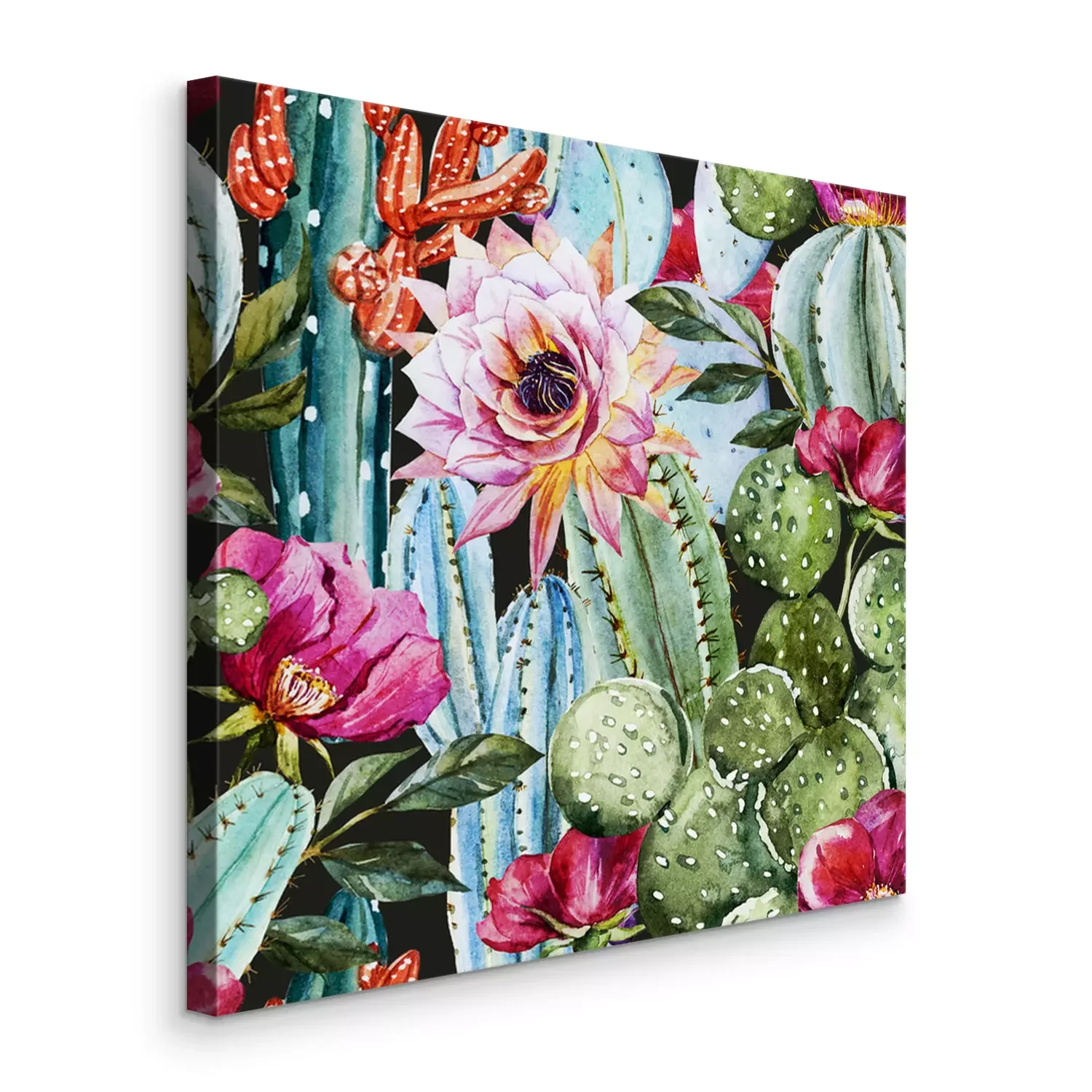 Bild: Kakteen inmitten von bunten Blumen mit Aquarellfarben gemalt