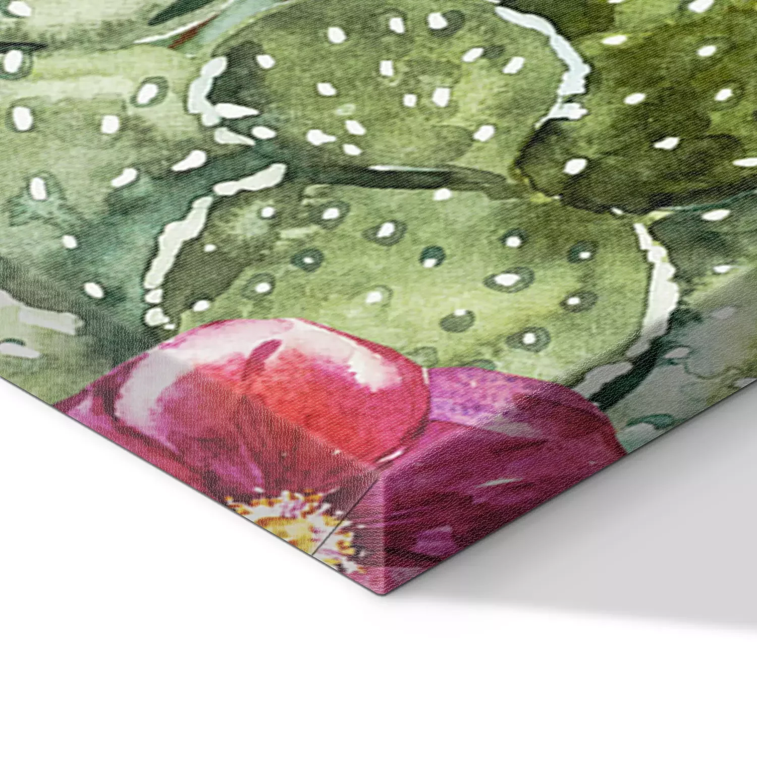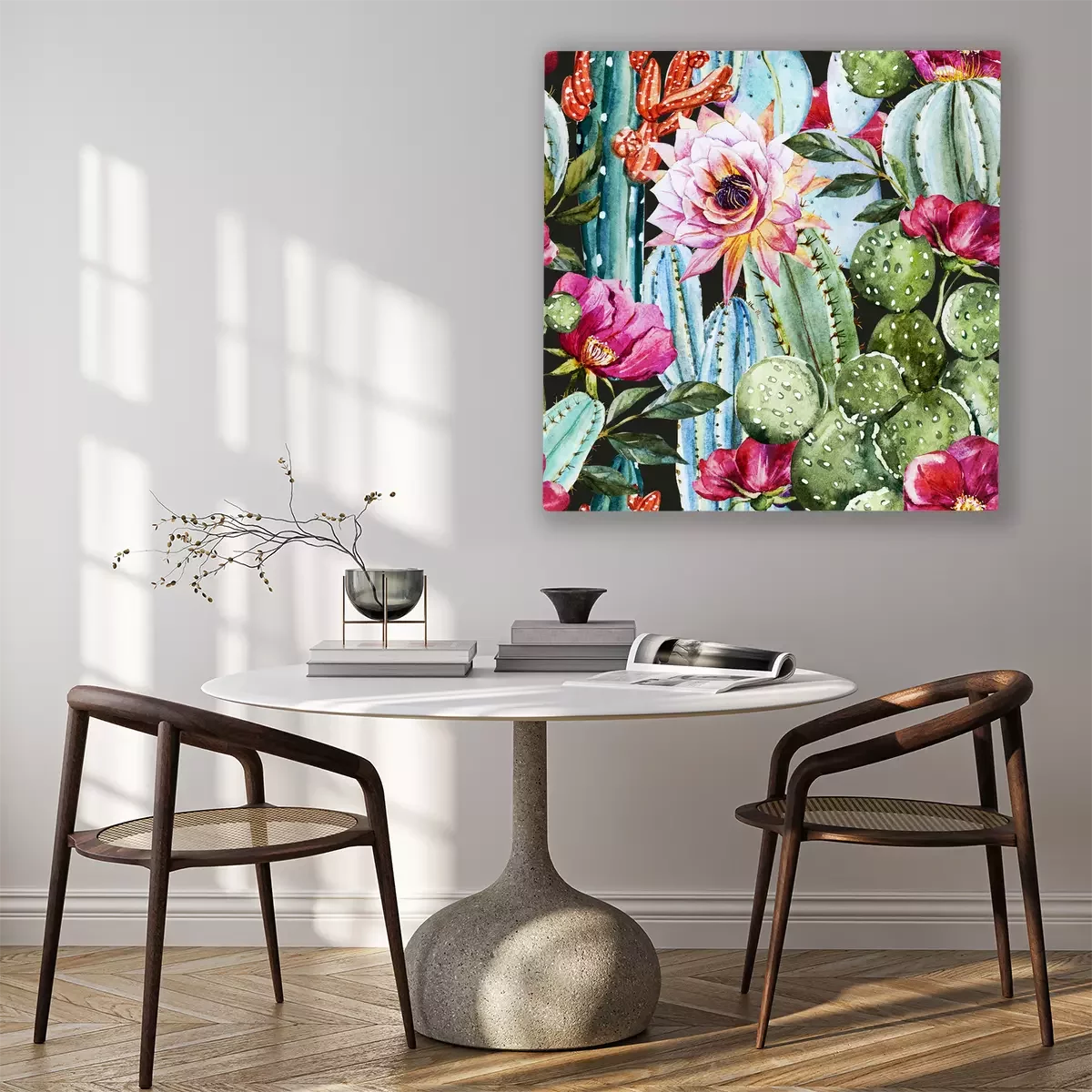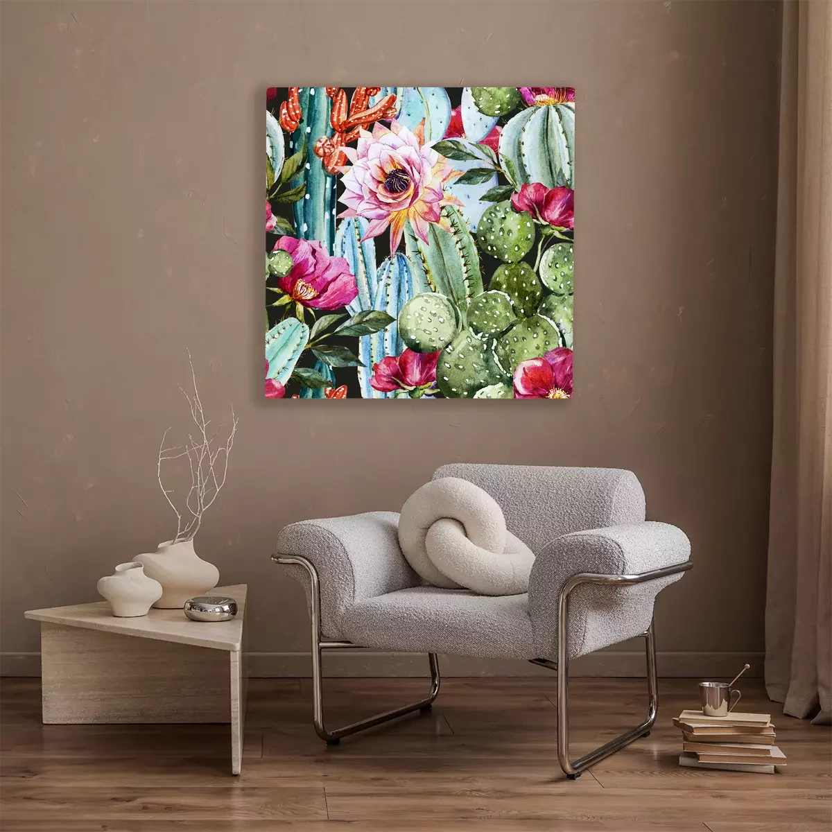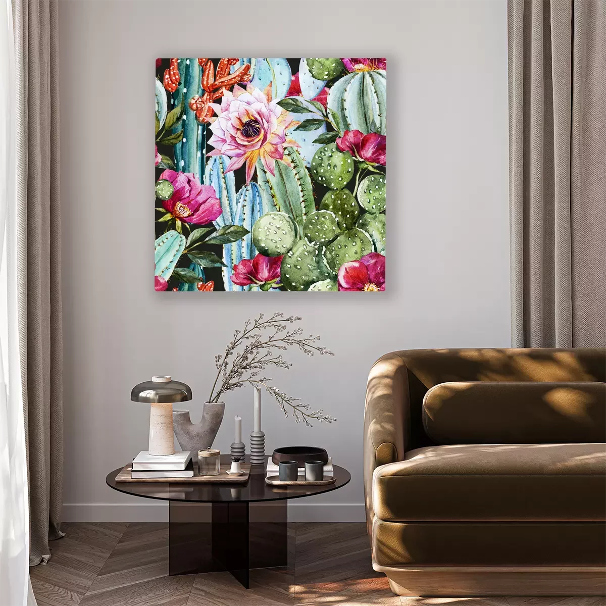 Bild Kakteen inmitten von bunten Blumen mit Aquarellfarben gemalt