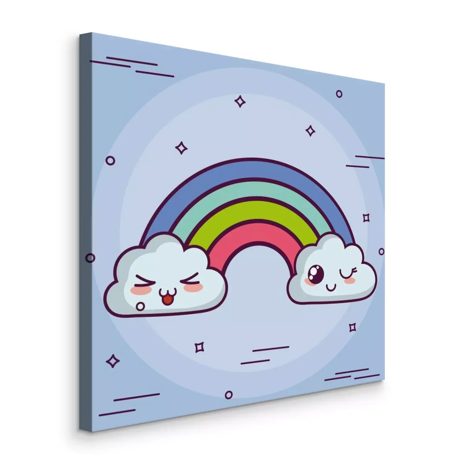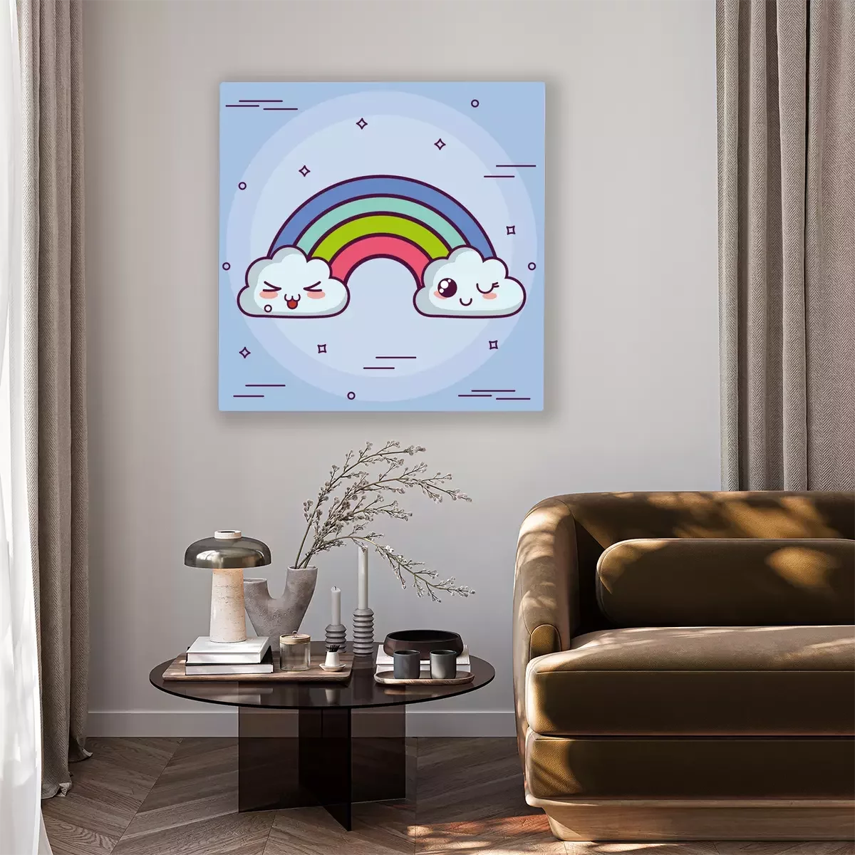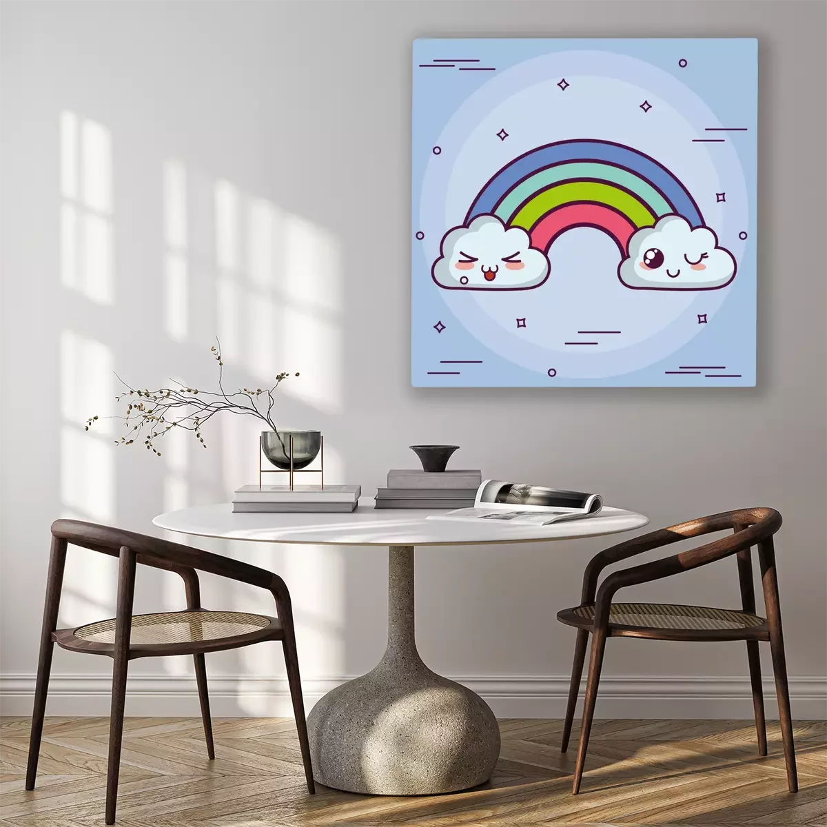 Bild: Kawaii Wolke mit einem Regenbogen-Symbol über lila Hintergrund. Buntes Design. Vektor-Illustration