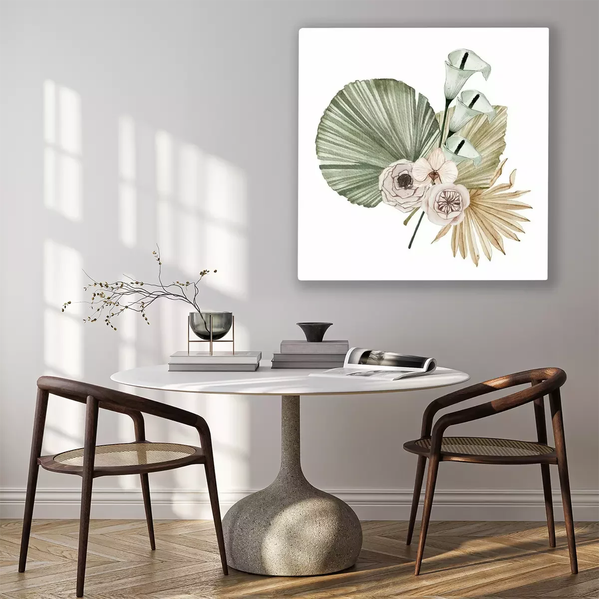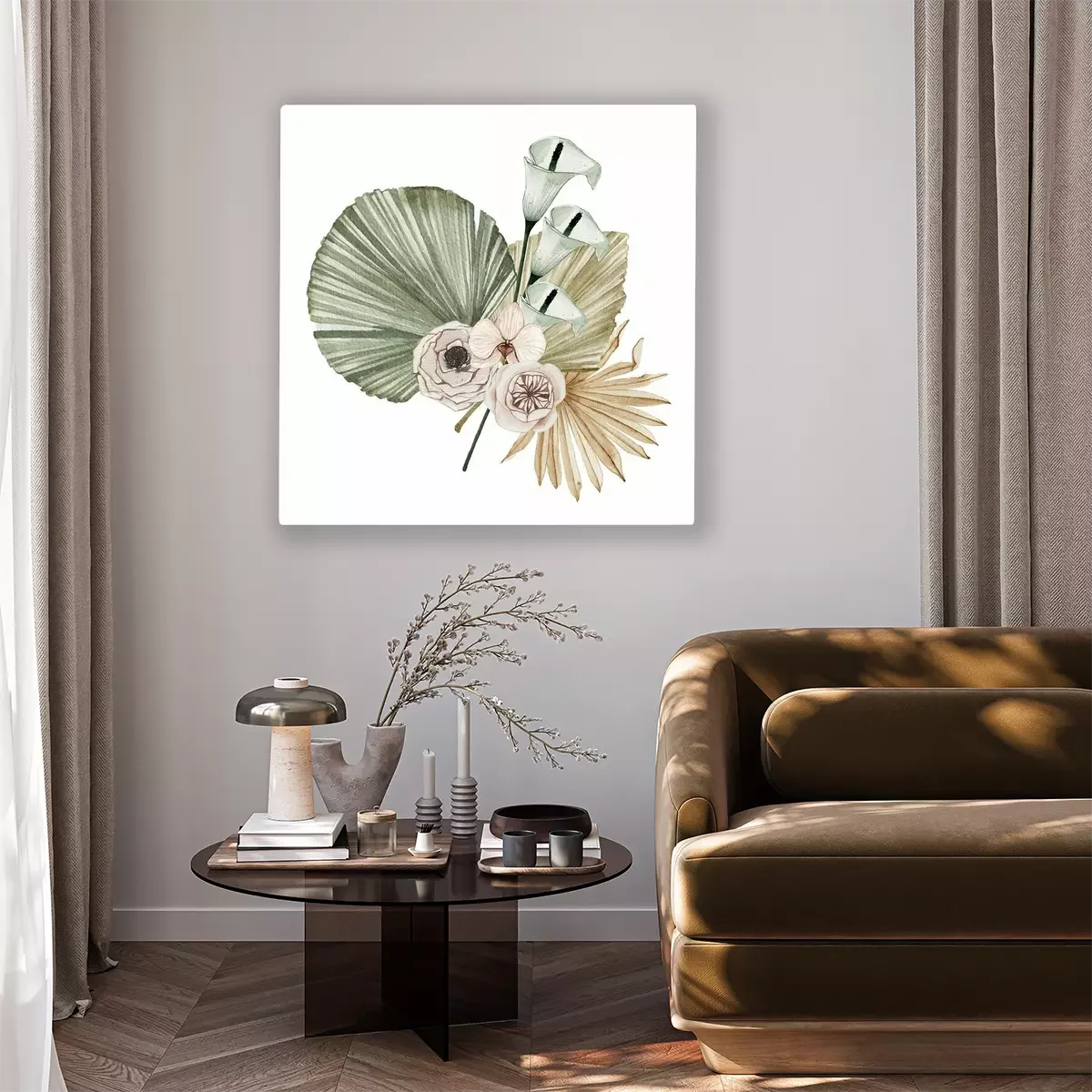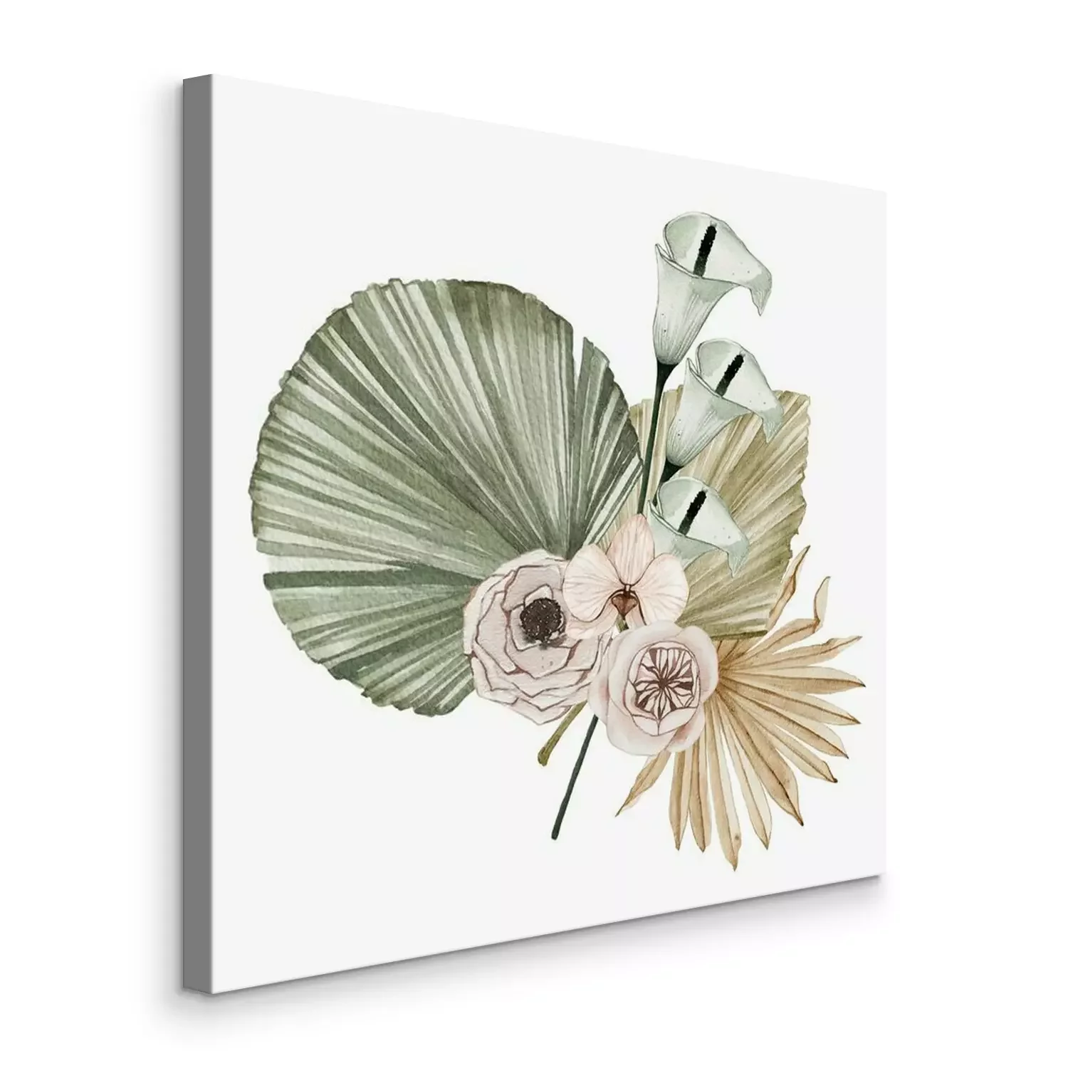 Bild Komposition aus Kalla-Blüten und getrockneten Palmblättern