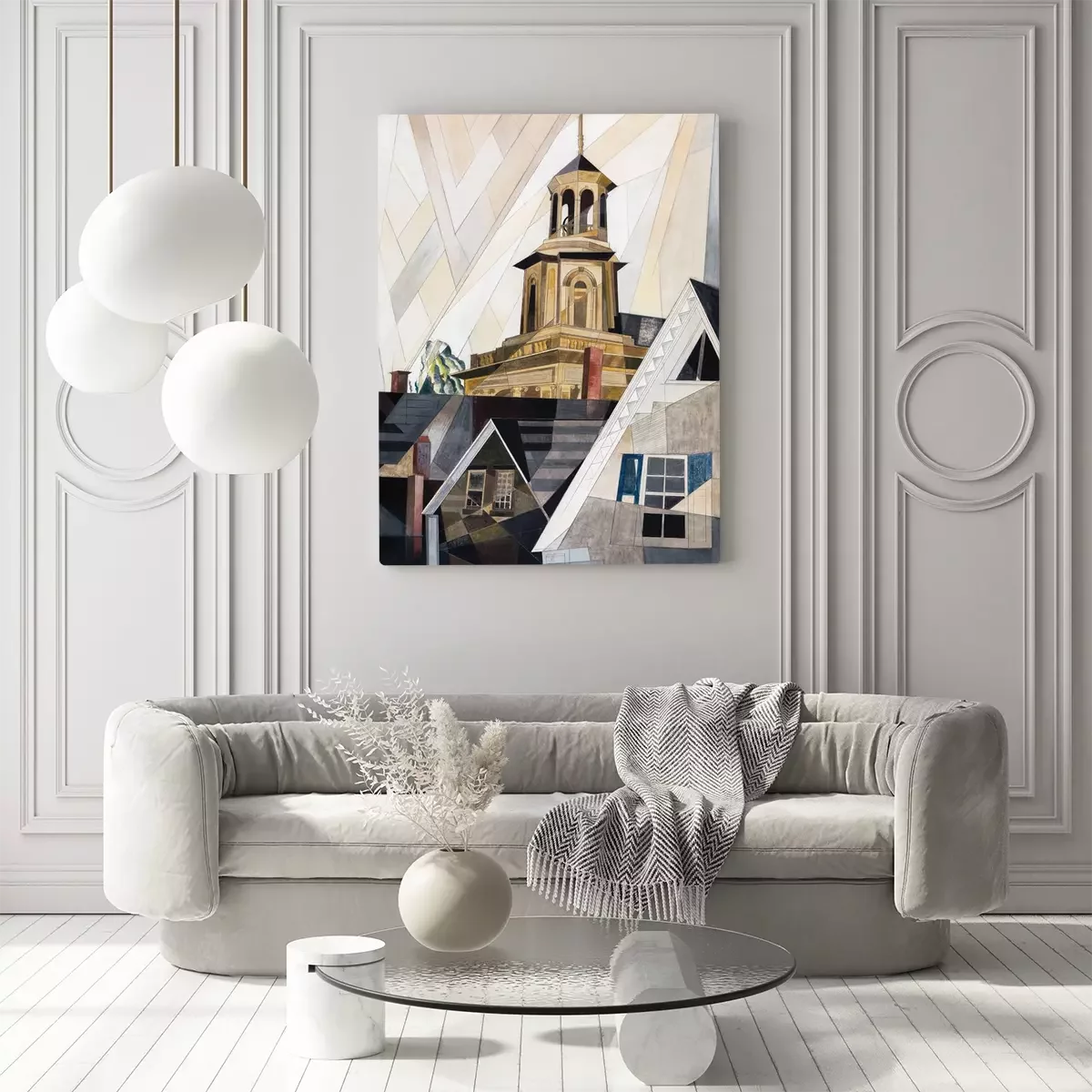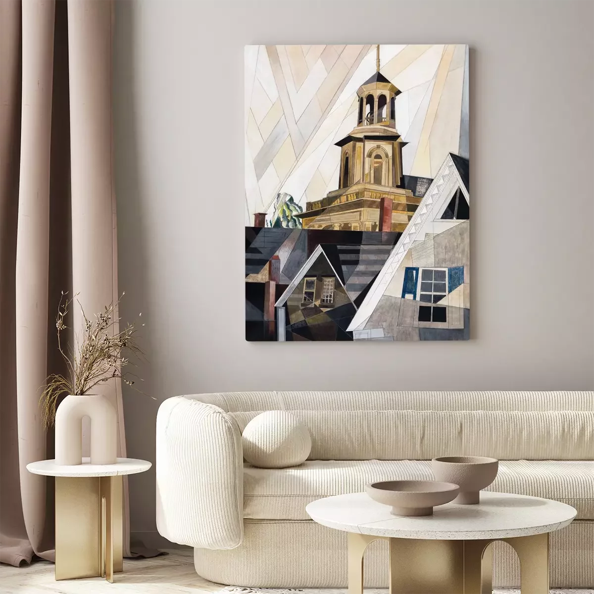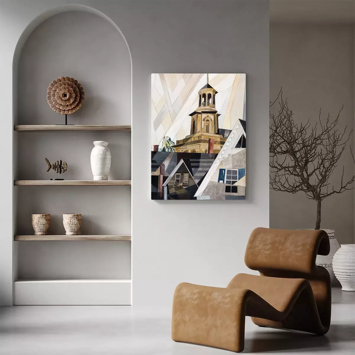Kubistische gebäude mit einem turm vor hellem himmel