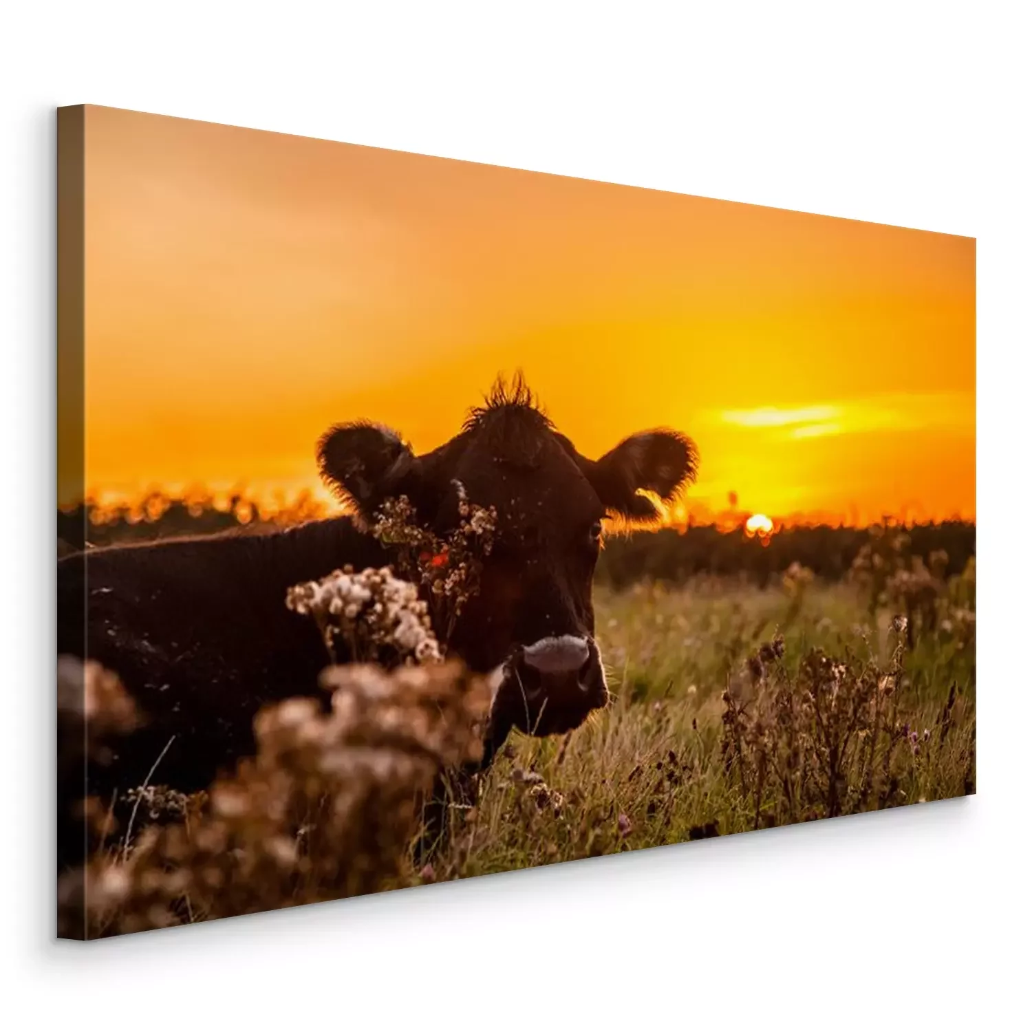 Bild Kuh auf einer Wiese mit einem schönen Sonnenuntergang im Hintergrund