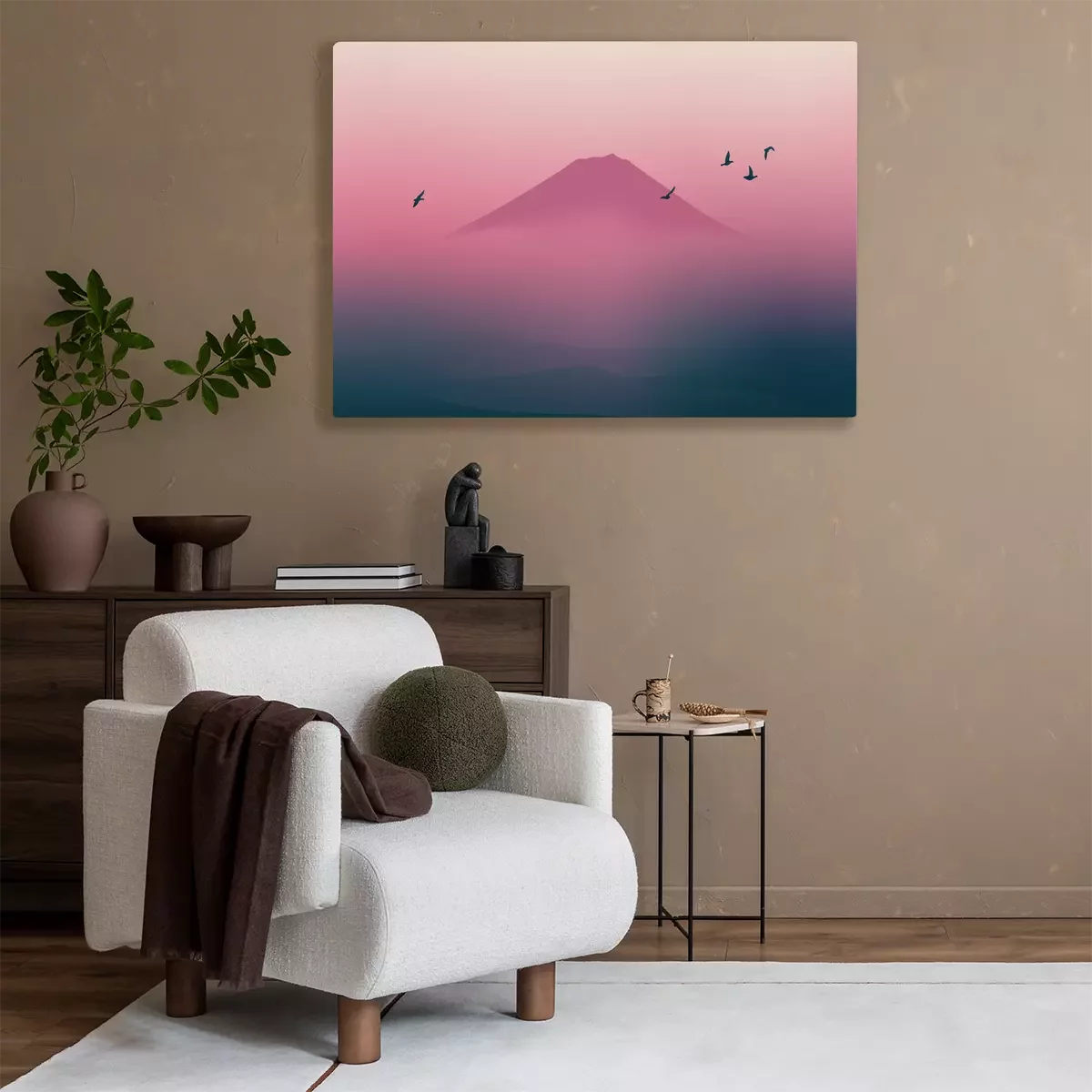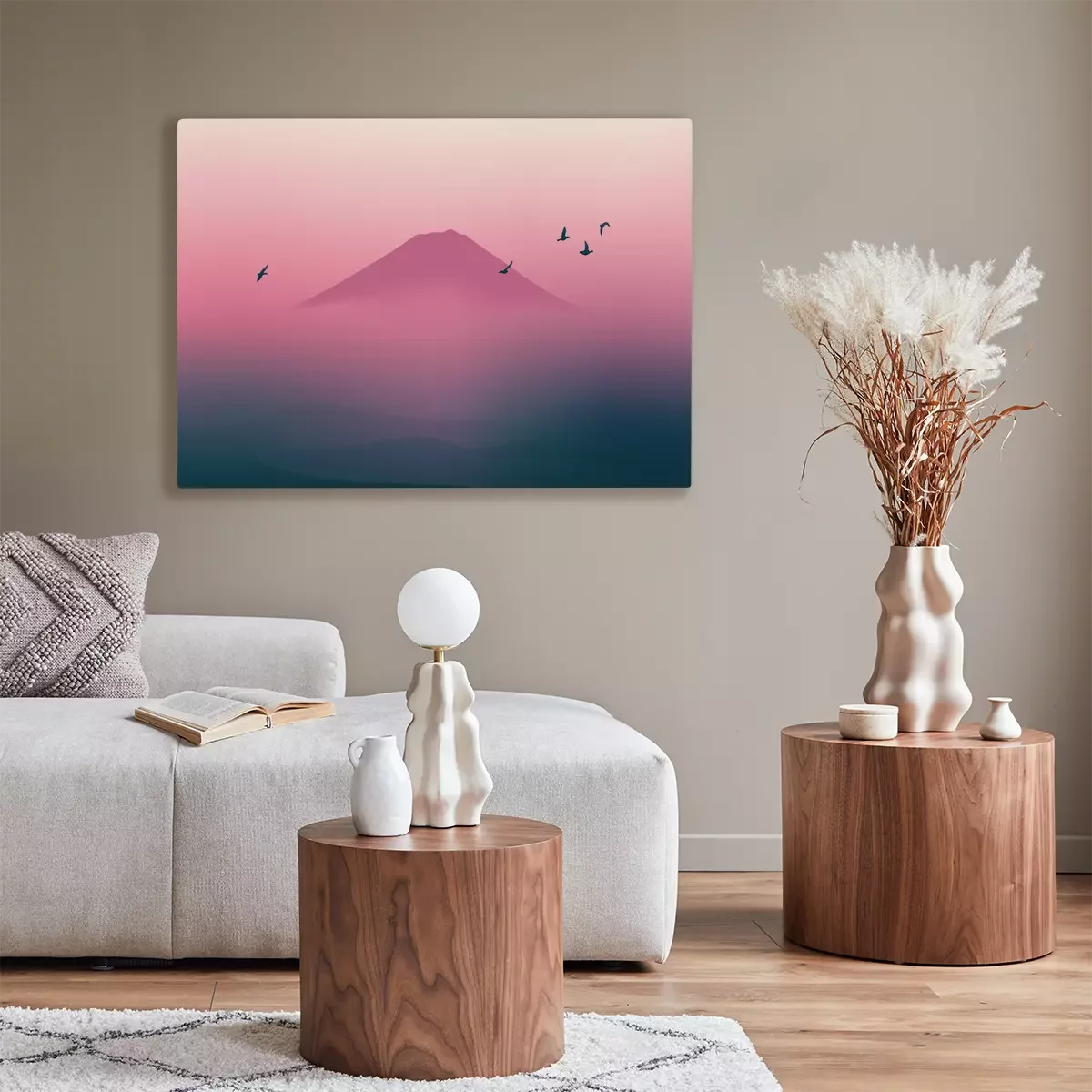 Landschaft mit einem berg und vögeln im rosa nebel