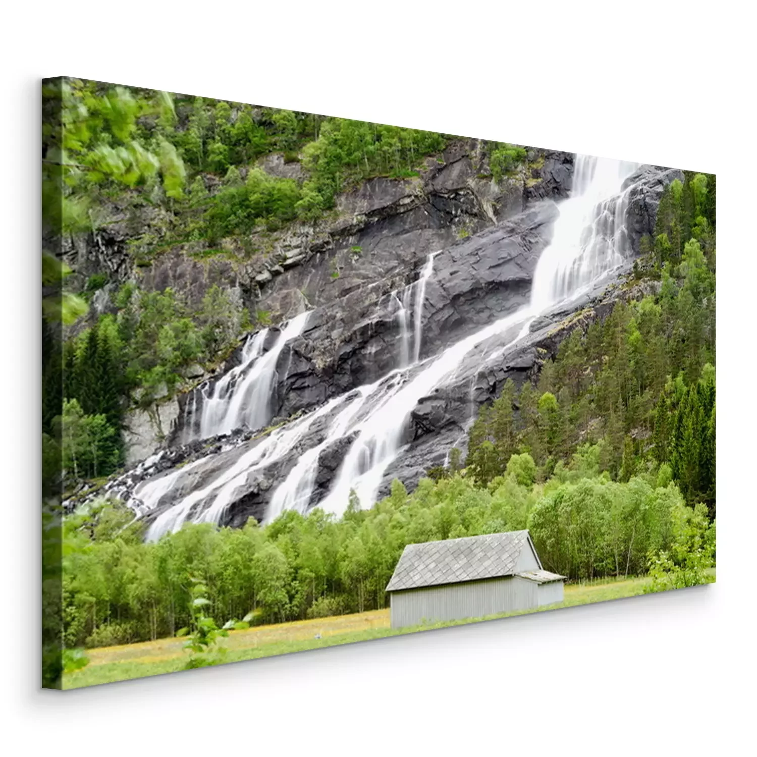 Bild Landschaft mit Wasserfall und Hütte