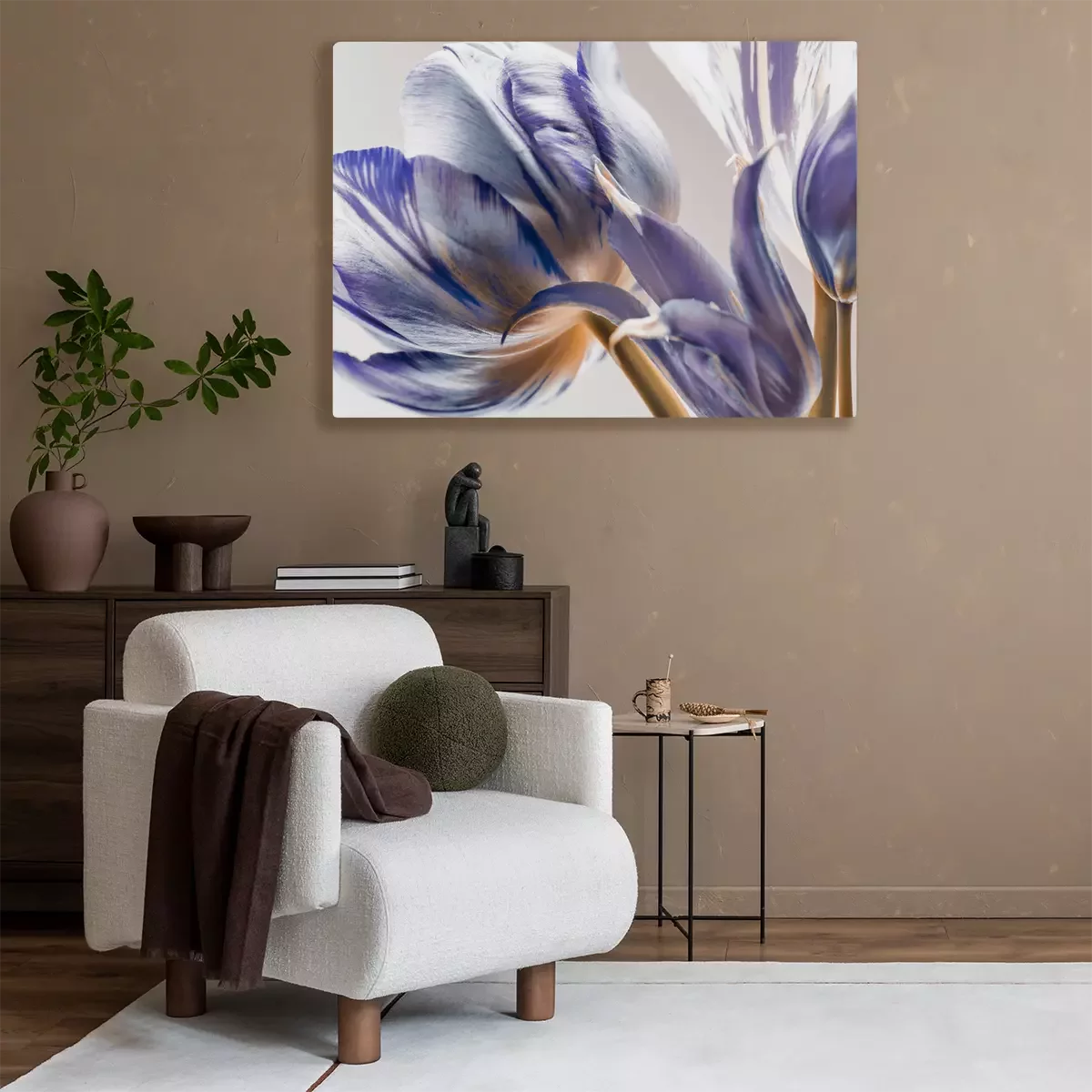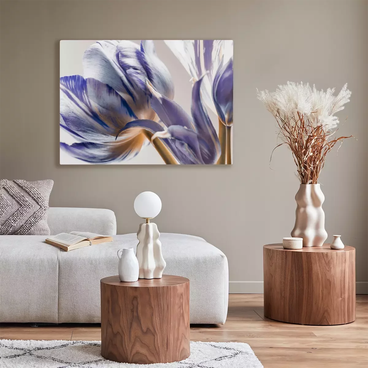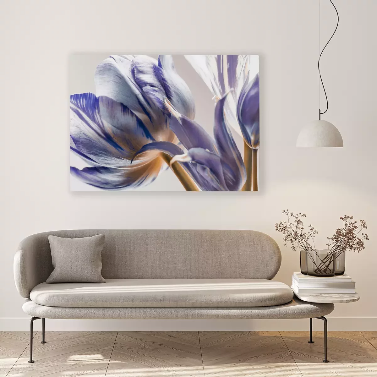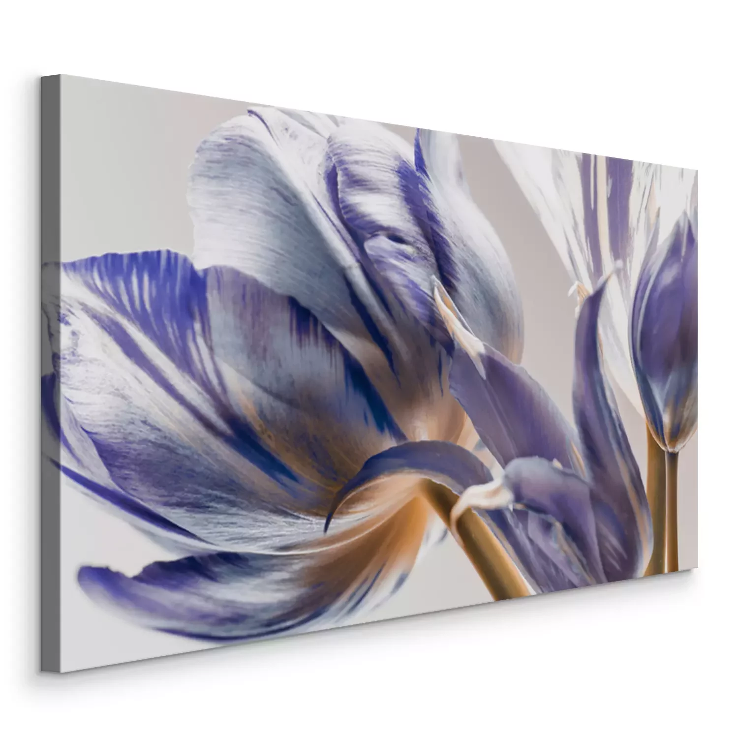 Florale Muster sind ein bewährtes Motiv für die Dekoration der eigenen vier Wände. Wenn du nach einem originellen Akzent suchst, greife nach dem von uns ausgewählten Bild. Tulpen zeichnen sich nicht nur durch ihre außergewöhnliche Farbgebung aus, als wären die weißen Blütenblätter mit violetter Farbe bemalt worden, sondern auch durch ihre interessante Darstellung. Es handelt sich um einen Ausschnitt, der die Blumen in Nahaufnahme und aus einem besonderen Blickwinkel zeigt, ohne die ganze Pflanze zu enthüllen. Gerade das macht ein solches künstlerisches Bild zu einem Highlight, das zu einem markanten Dekorationselement wird. Violett hat den Vorteil, dass es sich mit vielen Farben kombinieren lässt, wodurch sich das hier präsentierte Motiv in viele verschiedene Einrichtungsstile integrieren lässt. Ein Bild Tulpen in dieser Farbe kommt in einem in Beige-, Creme-, Grau- oder Grüntönen eingerichteten Raum wunderschön zur Geltung. Zudem passt es nicht nur zu einem traditionellen Interieur, sondern auch dank der Ästhetik, in der dieses Muster gehalten ist, zu modernen Räumen. So einzigartig ist dieses Bild. Abstraktes Design ist vielleicht das erste, was man bei diesem Motiv wahrnimmt. Das liegt an dem bereits erwähnten Bildausschnitt. Ein großformatiges Motiv an der Wand erinnert an zeitgenössische Malerei, und erst nach einer genaueren Betrachtung erkennt man ein florales Bild. Abstraktes Design, ebenso wie florale Motive, ist zeitlos und universell, weshalb ein Muster dieser Art eine hervorragende Wahl ist. In welchem Raum wirkt eine solche Dekoration am besten? Dies ist bestimmt eine tolle Lösung für das Wohn- und Schlafzimmer, denn dort schaffen florale Motive eine elegante und zugleich gemütliche Atmosphäre. Da unsere Dekorationen feuchtigkeitsbeständig sind, kann ein solches Motiv auch im Badezimmer aufgehängt werden. Ein Bild Tulpen in violetten Tönen sieht sowohl in modernen, in Grautönen gehaltenen Interieurs als auch in provenzalisch eingerichteten Räumen, in denen helle Möbel und violette Accessoires dominieren, hervorragend aus. Da das Motiv auch an den Seiten der Leinwand aufgebracht ist, braucht das Bild keinen Rahmen, um elegant zu wirken.