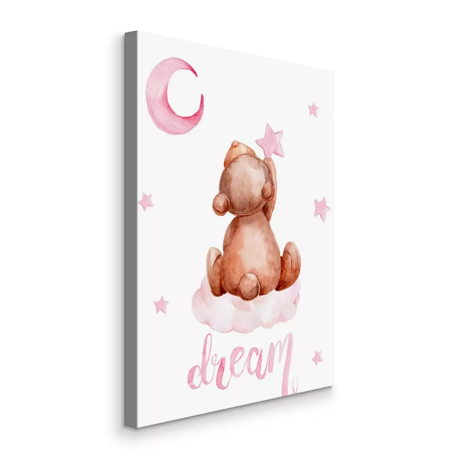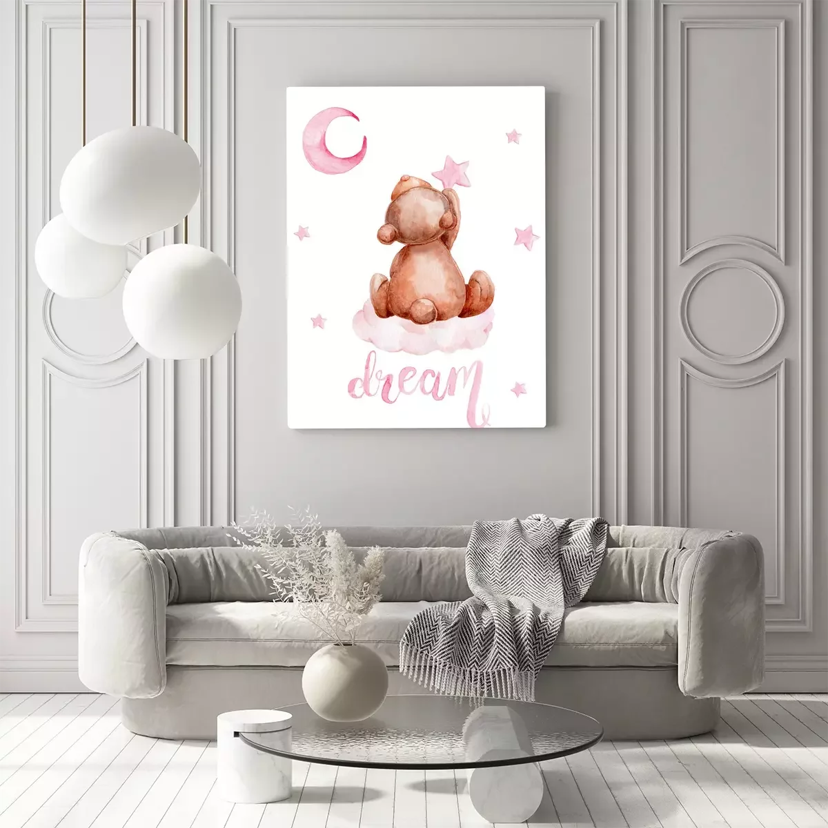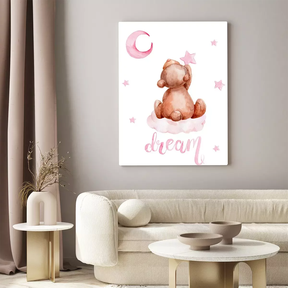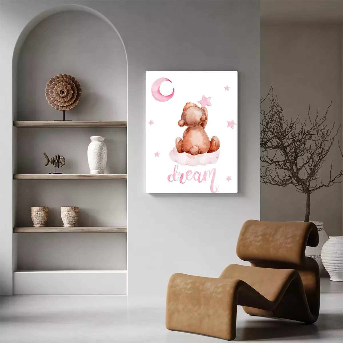 Bild Little brown teddy bear sitting on a cloud and moon and stars; watercolor hand draw illustration; with white isolated background