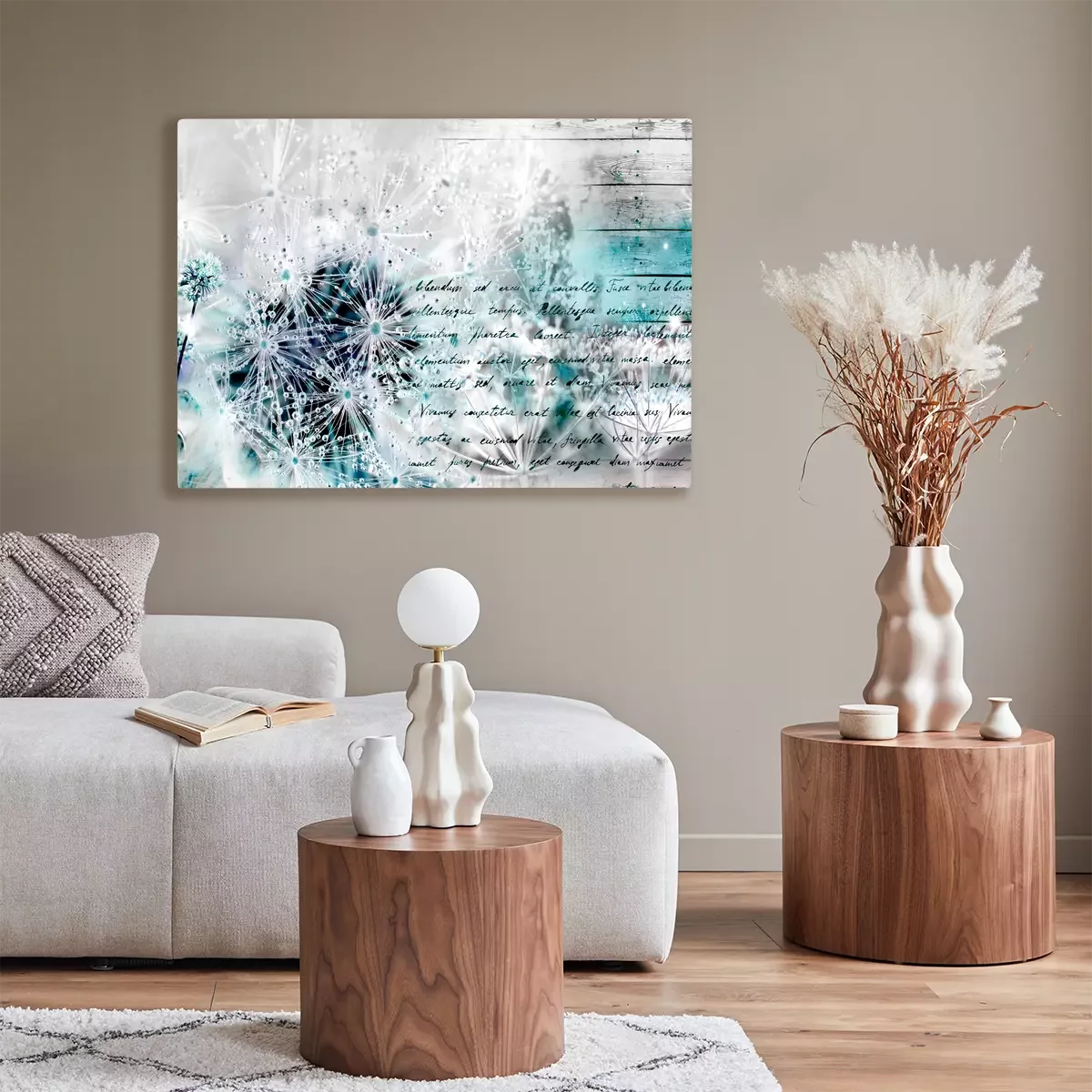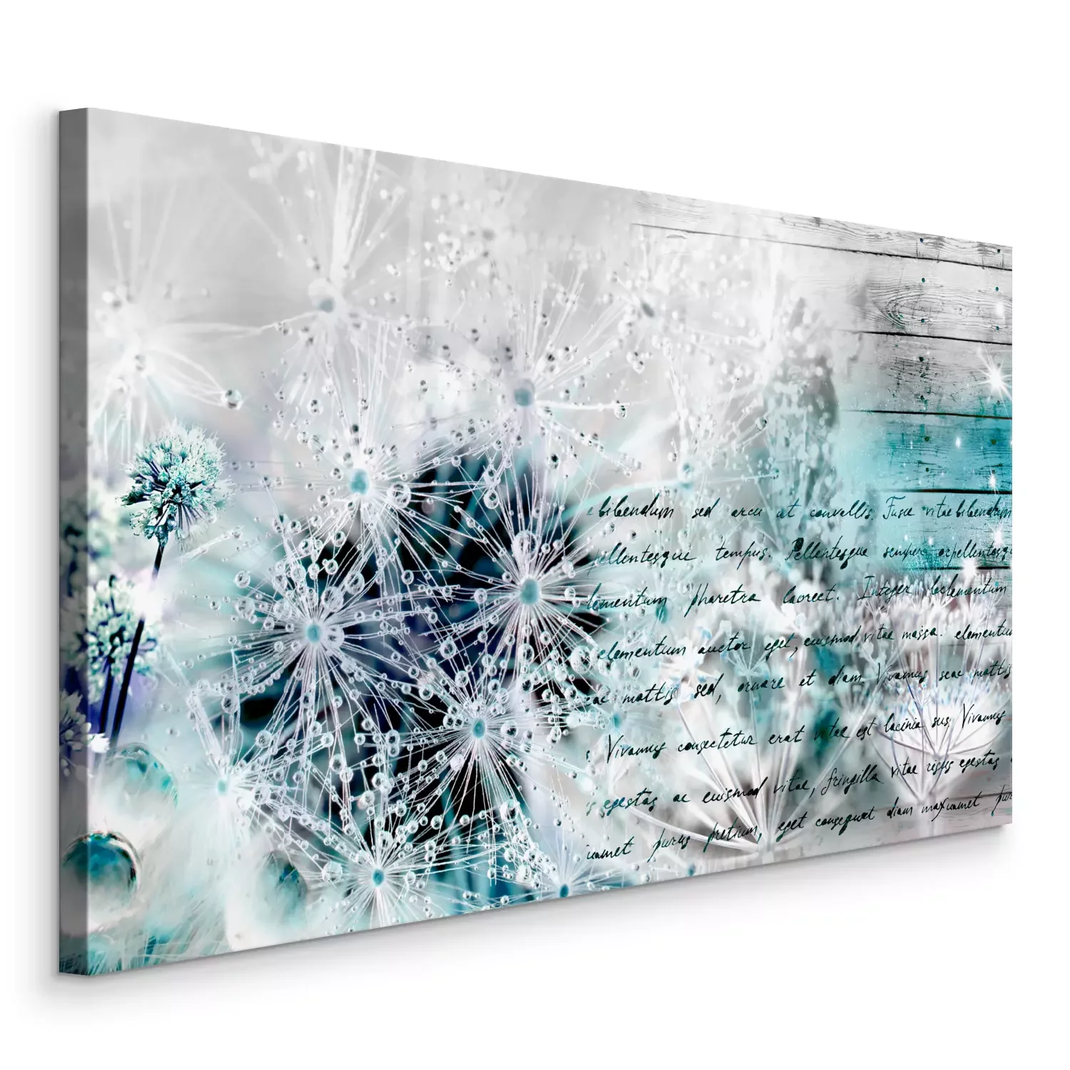 Löwenzahnblüten mit tau auf kühlfarbigem holzgrund