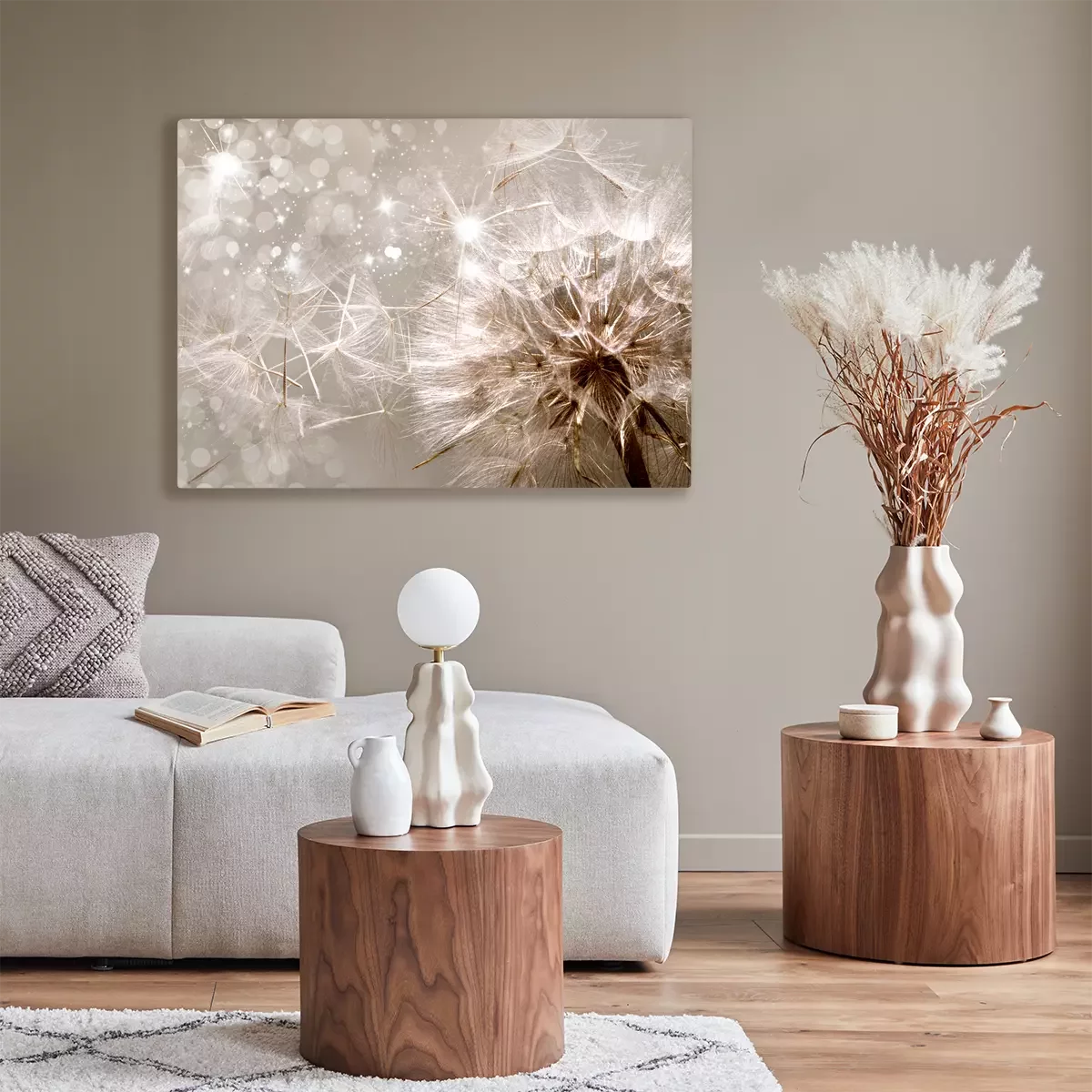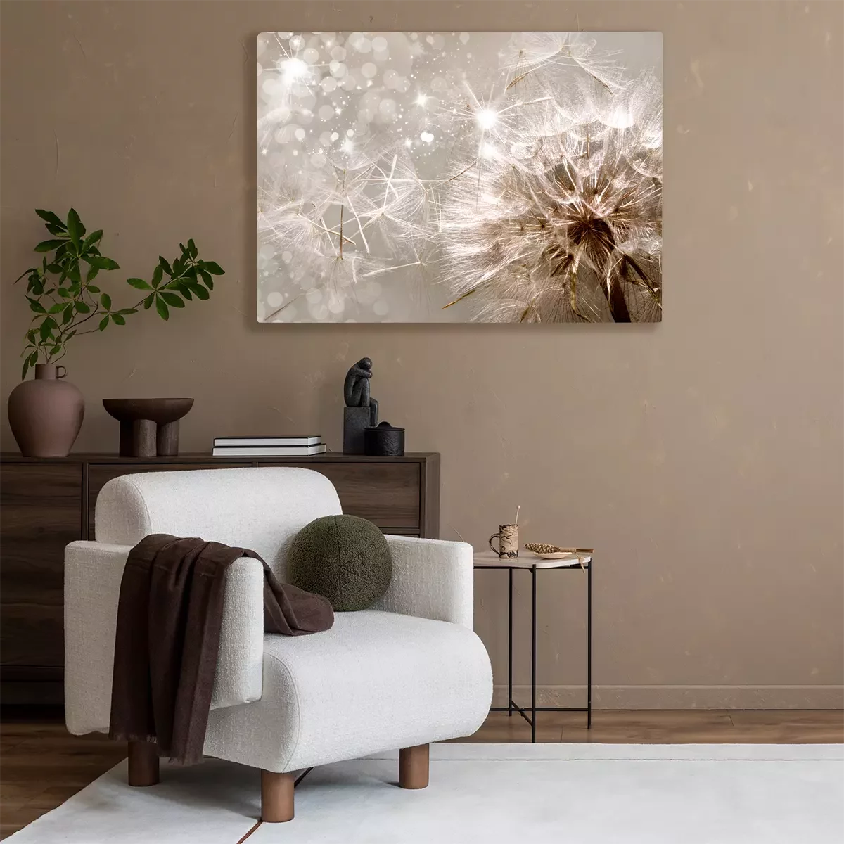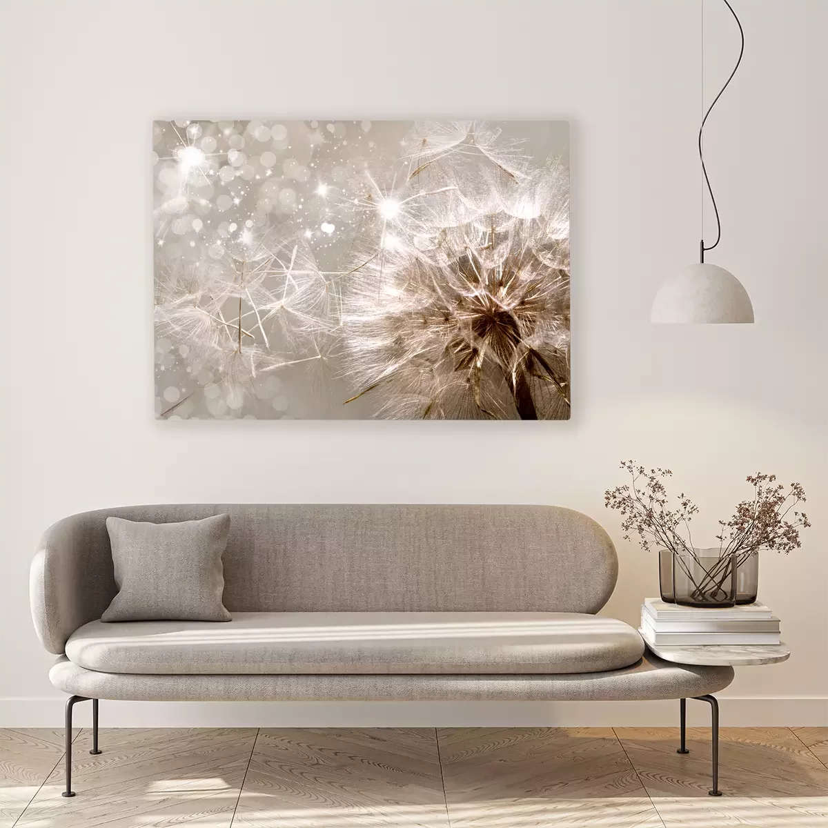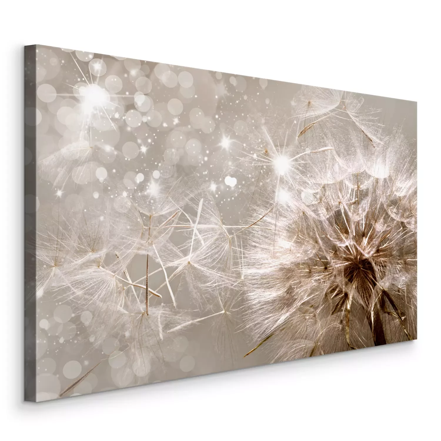 Löwenzahnsamen fliegen im schein und licht davon.