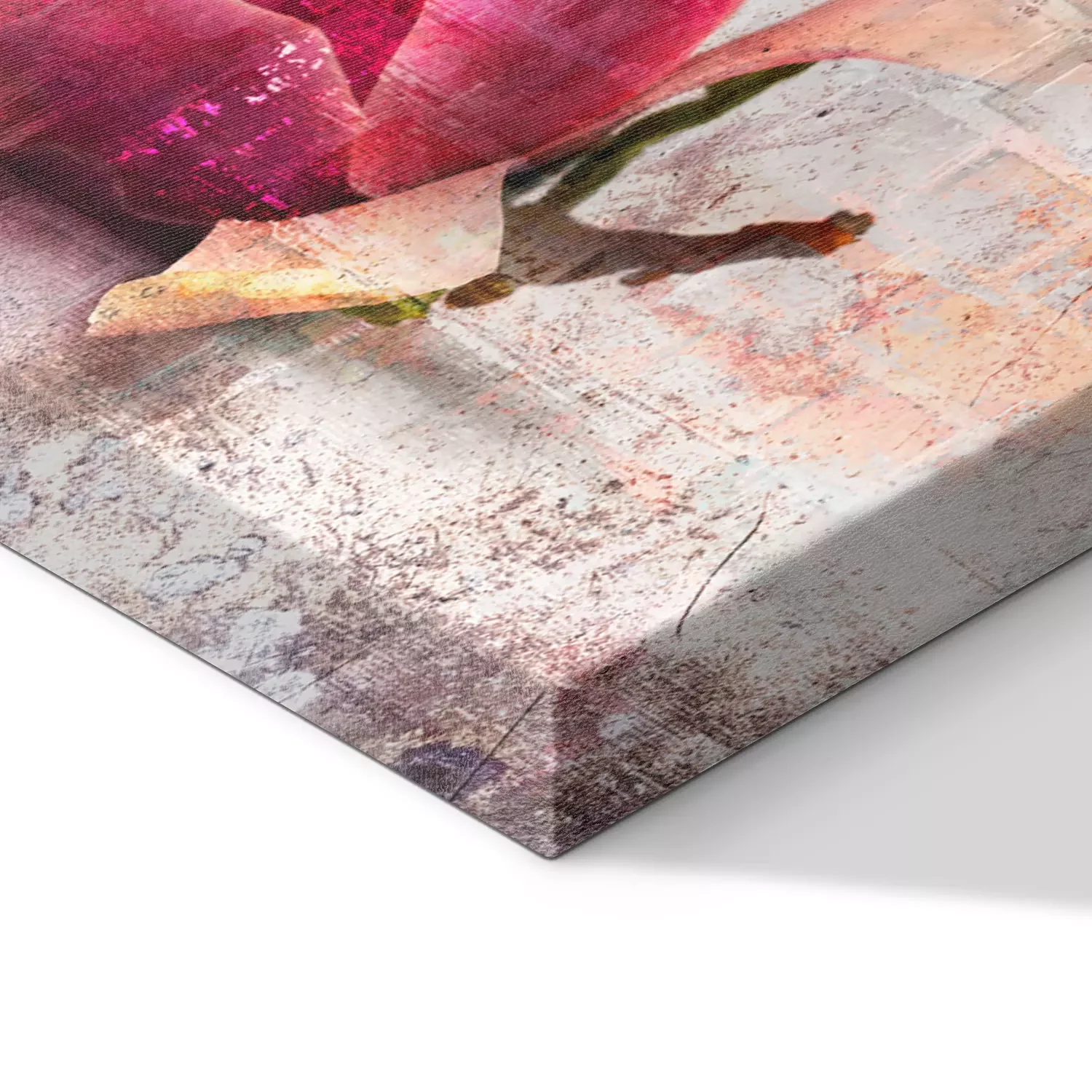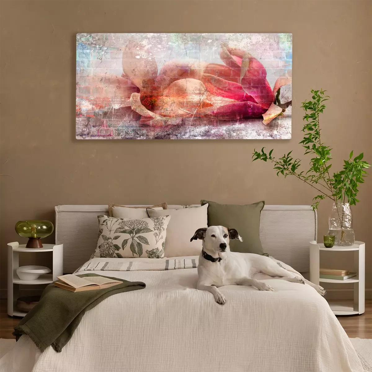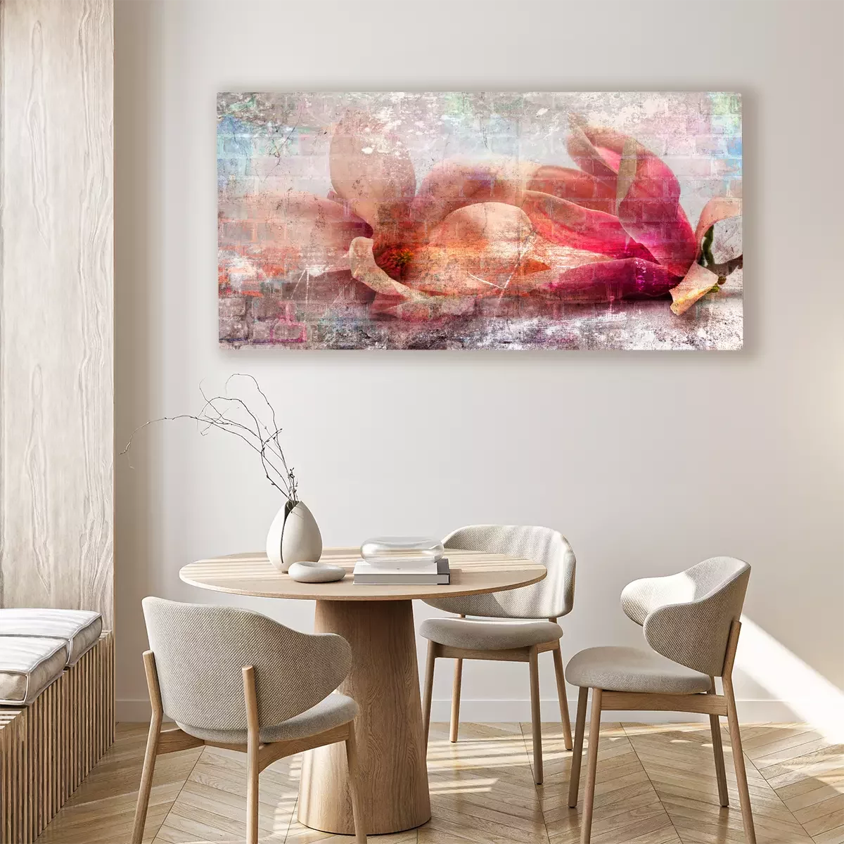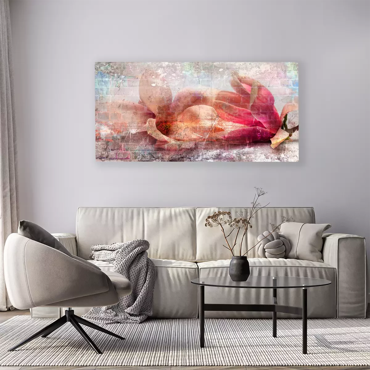 Magnolienblüten in einer pastellfarbenen komposition mit ziegelsteinen