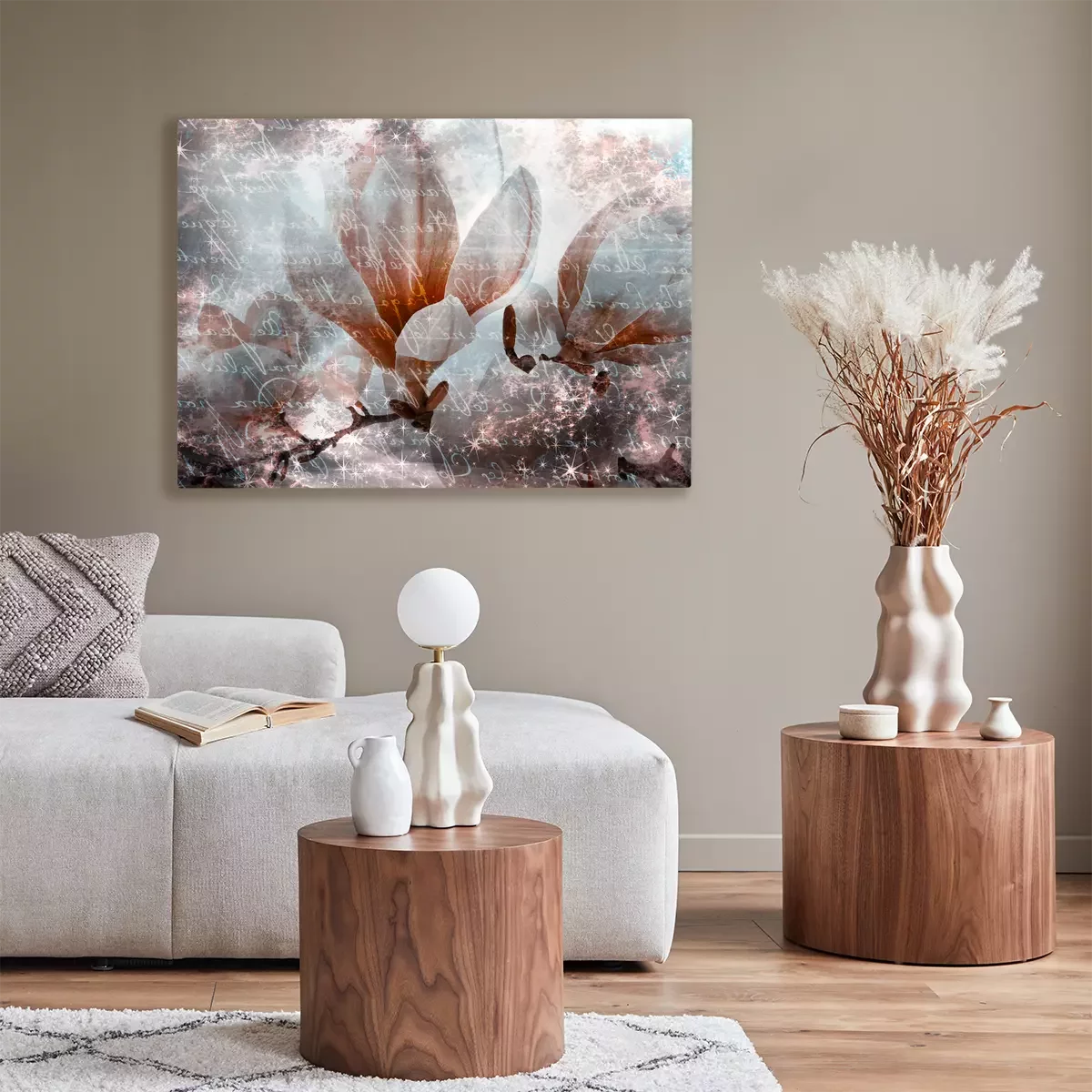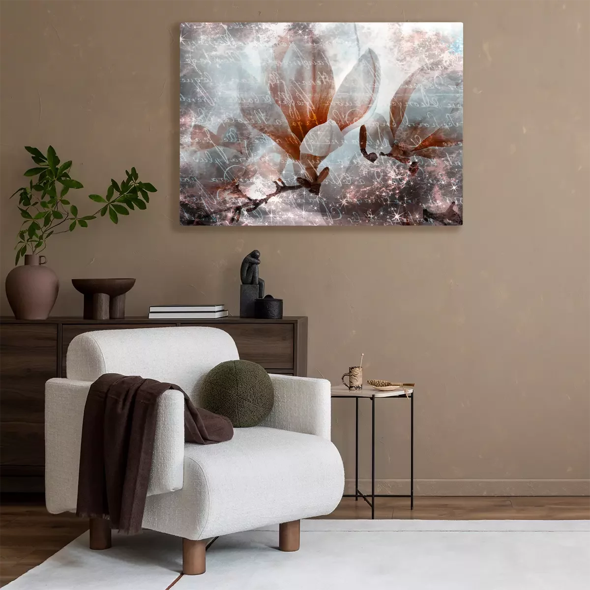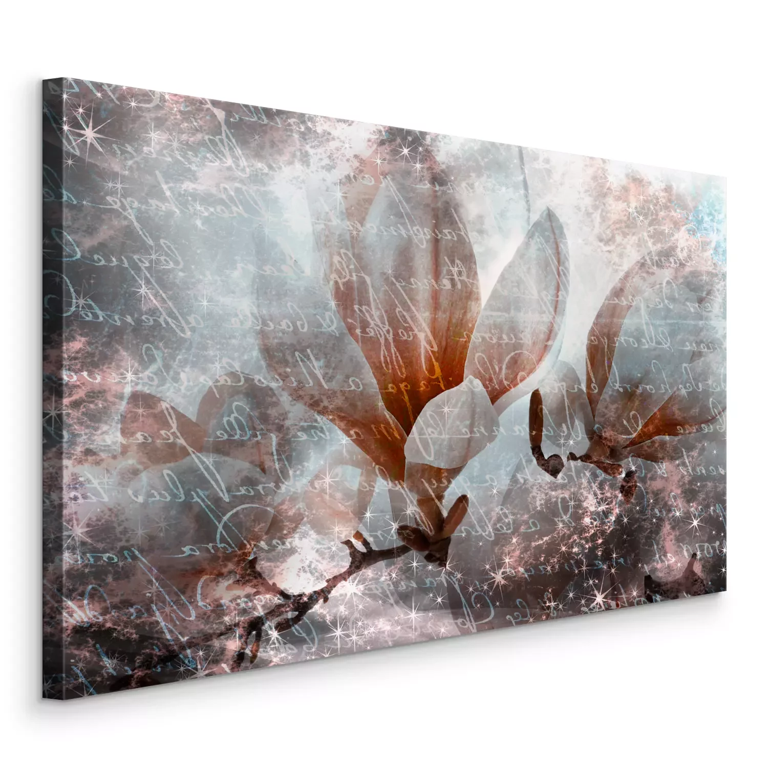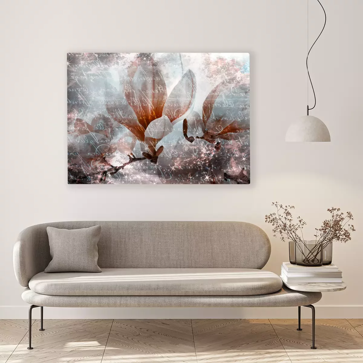 Magnolienblüten vor dem hintergrund dekorativer inschriften