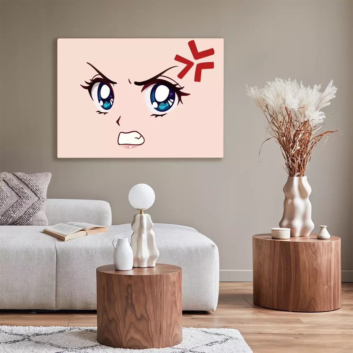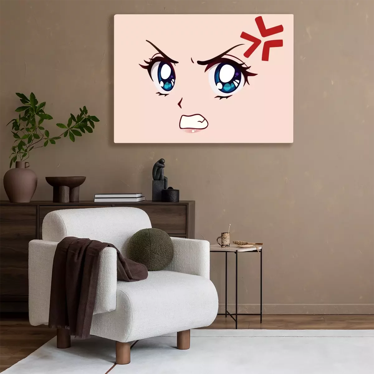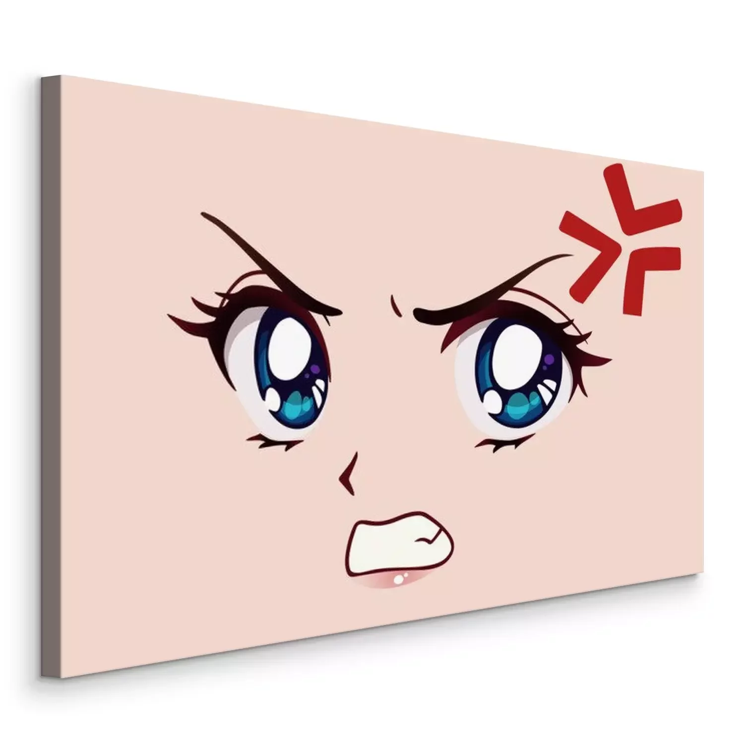 Happy anime face. Manga style big blue eyes, little nose and big kawaii mouth. Yellow sparkles in her eyes.