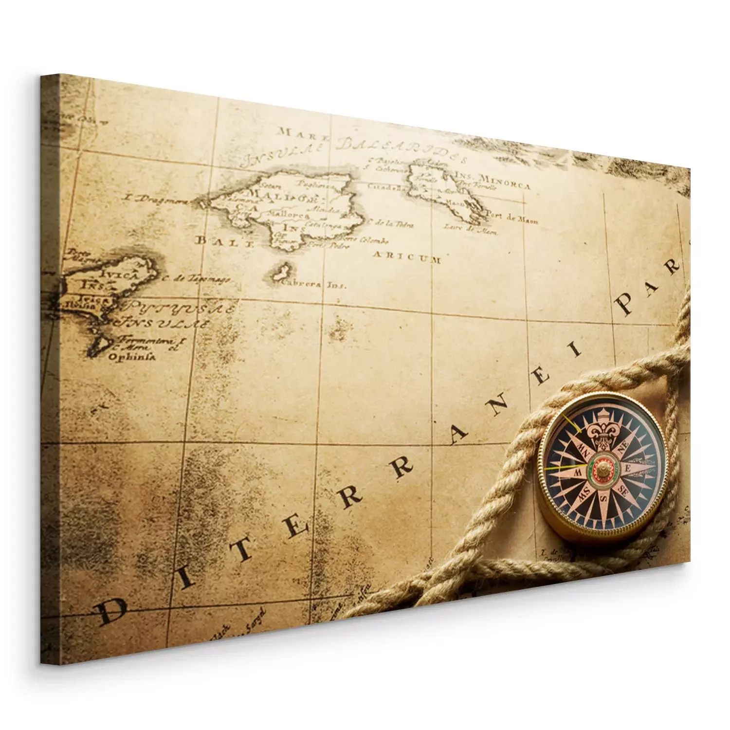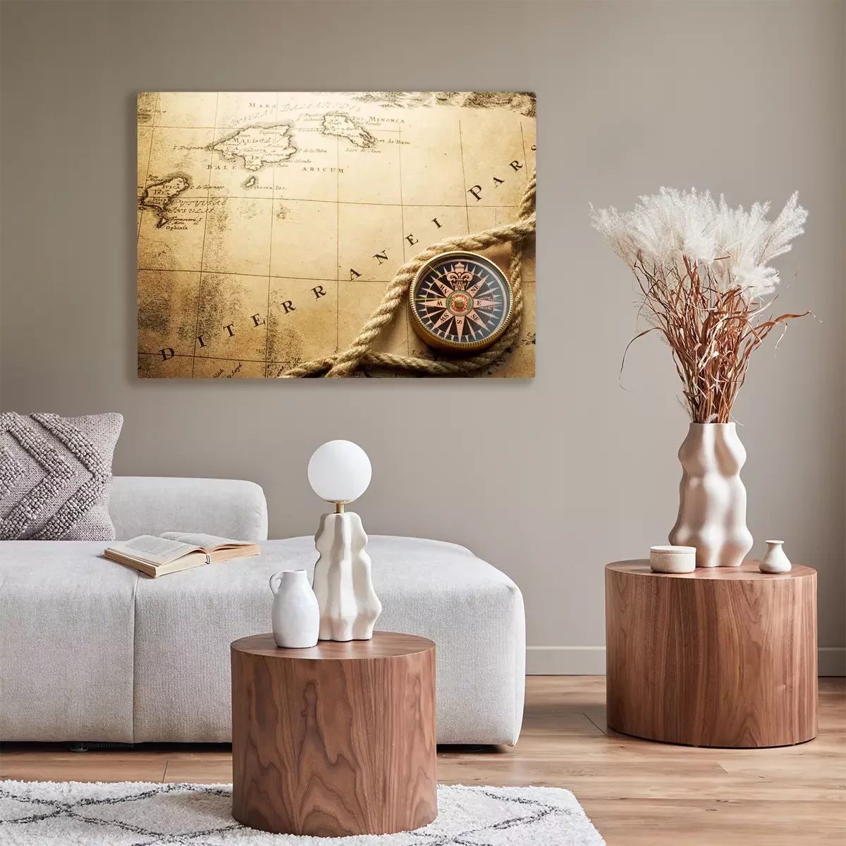 Alter Kompass, Fernglas und Seile auf einer alten Weltkarte