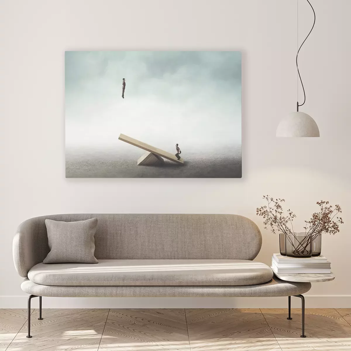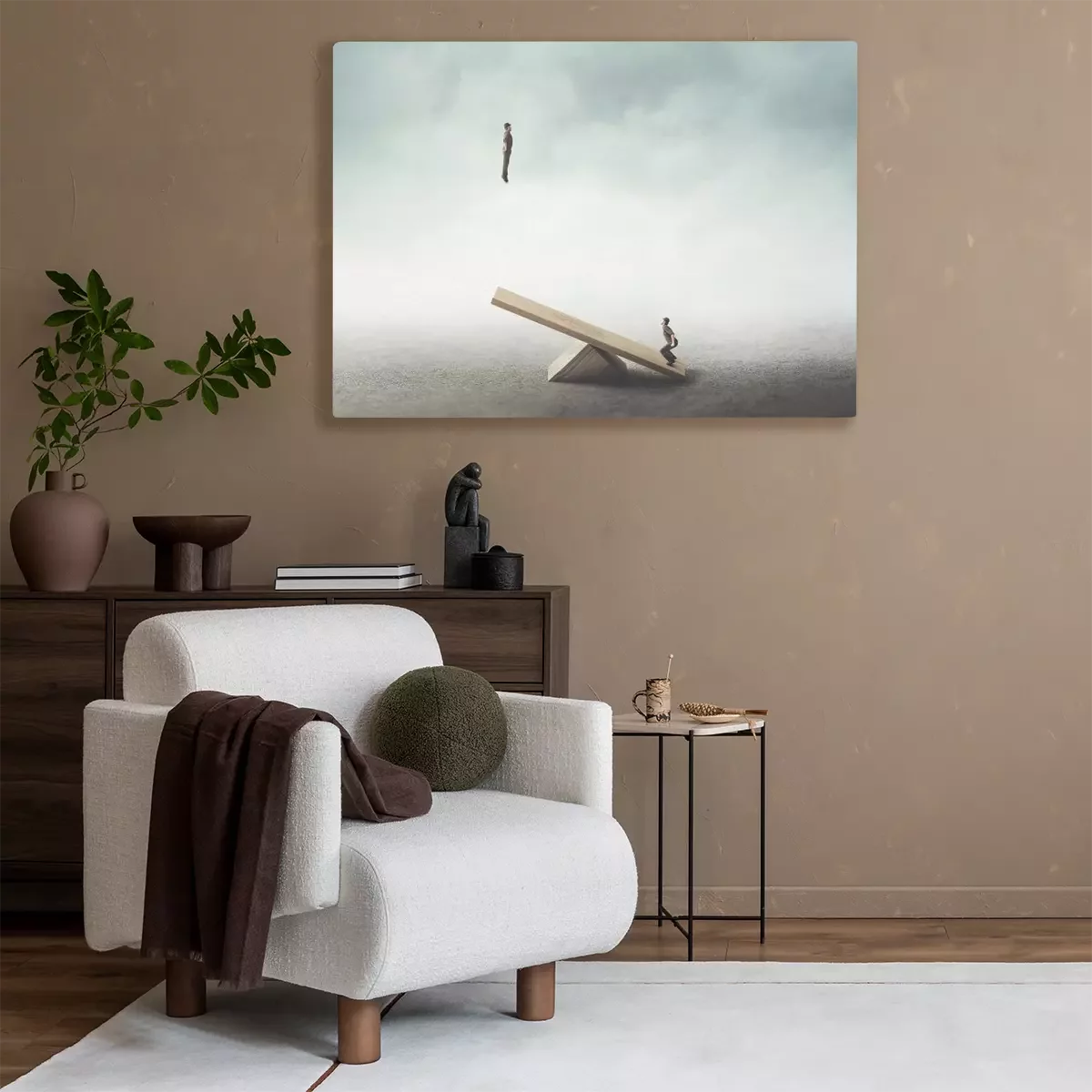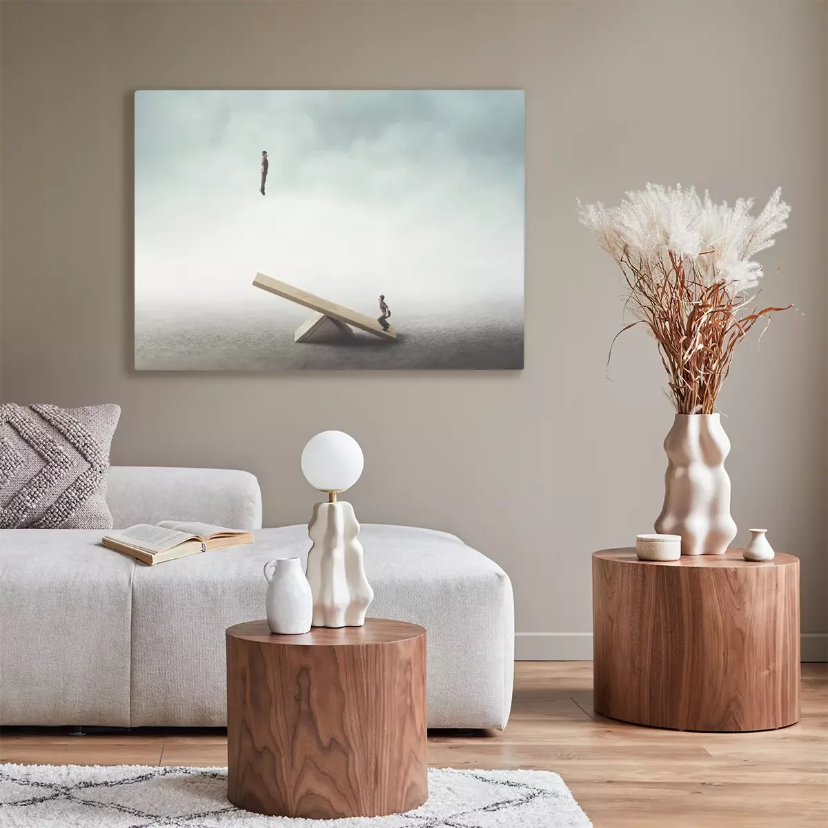 Miniaturfiguren auf einer schaukel in einem leeren raum