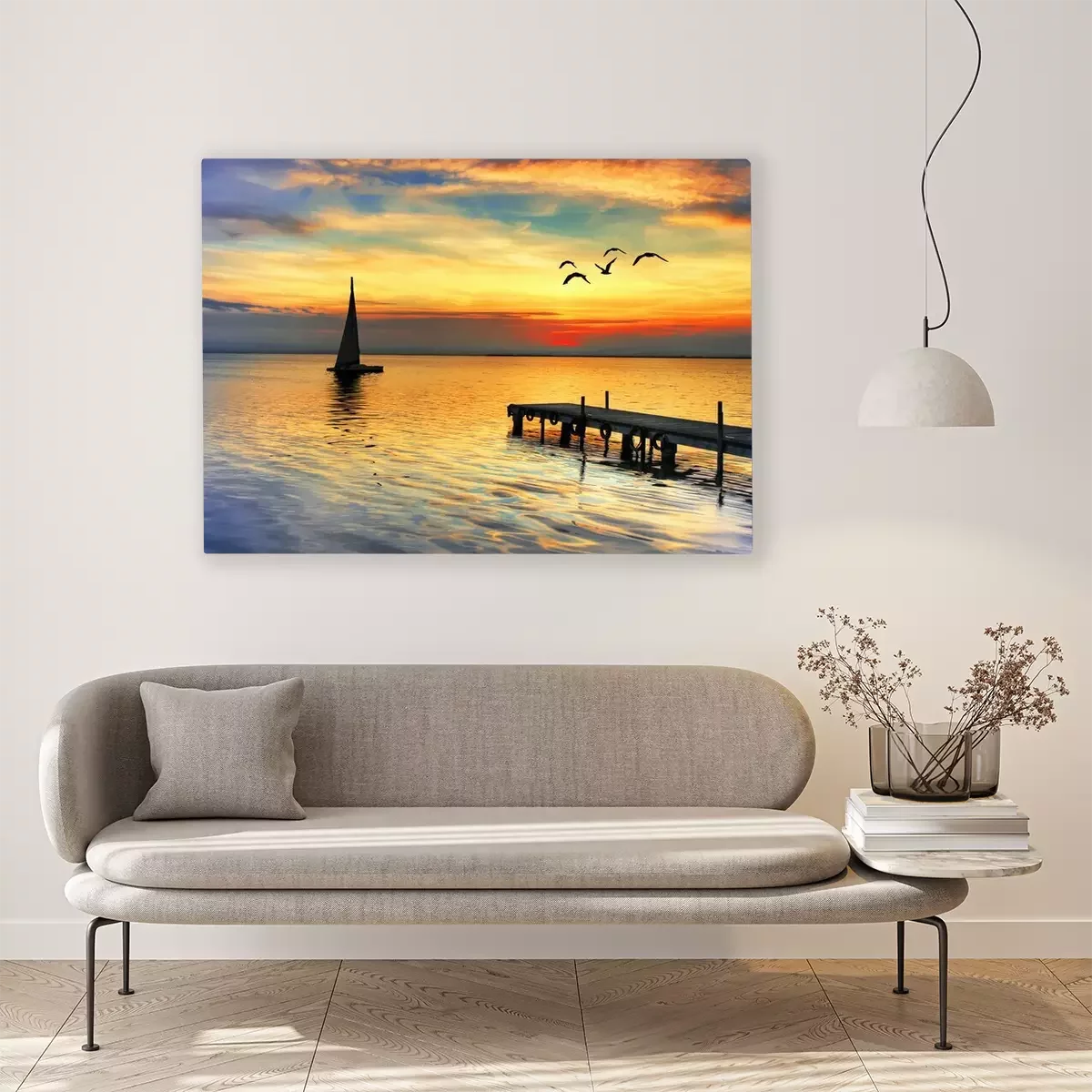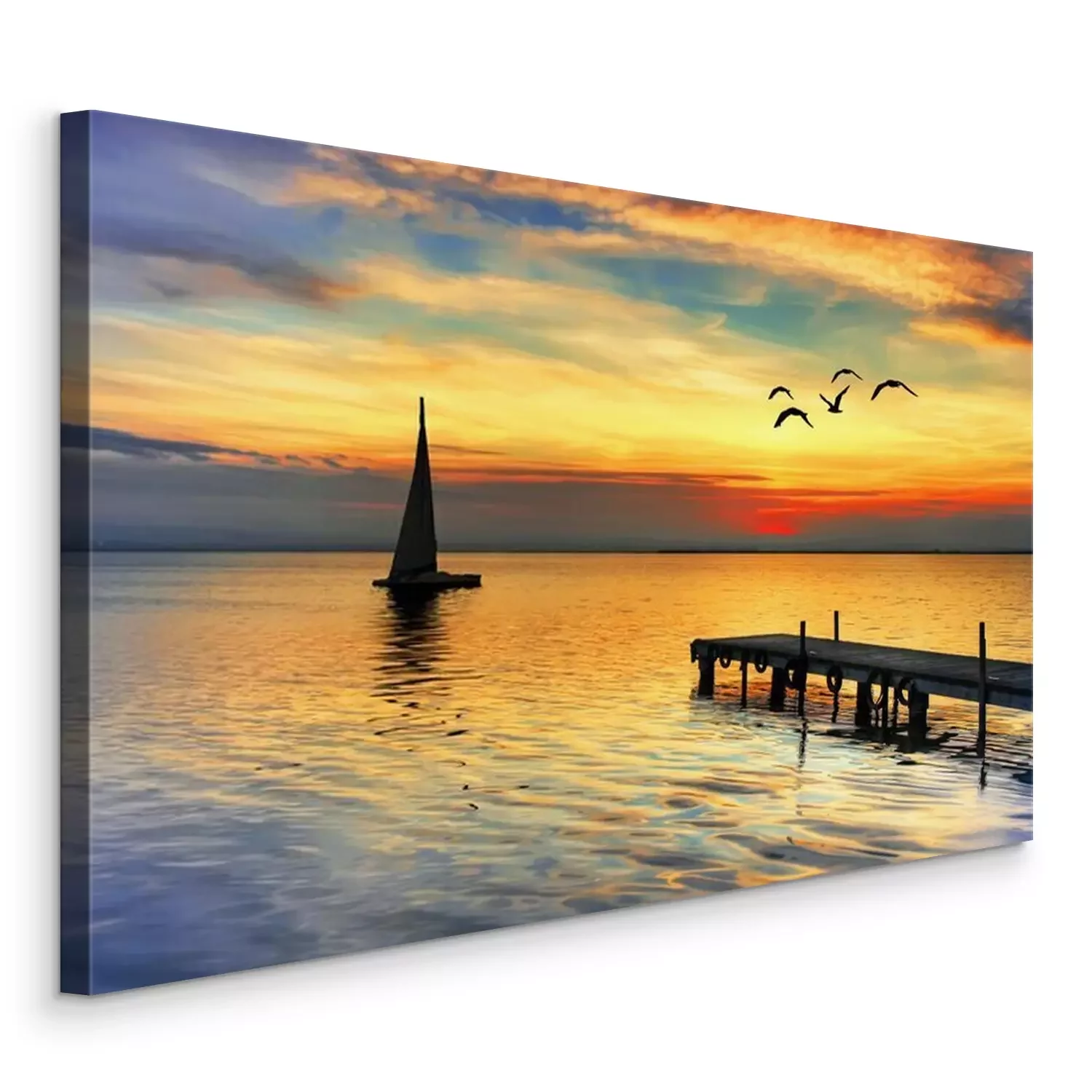Bild Möwen und Segelboot bei Sonnenuntergang