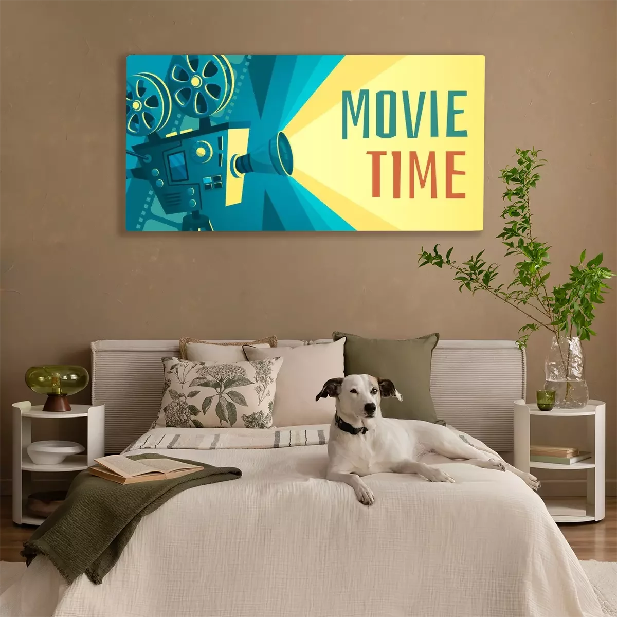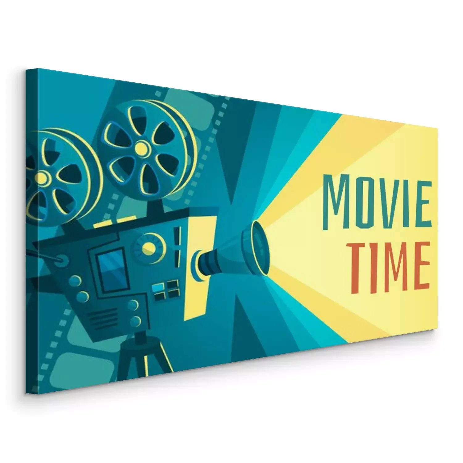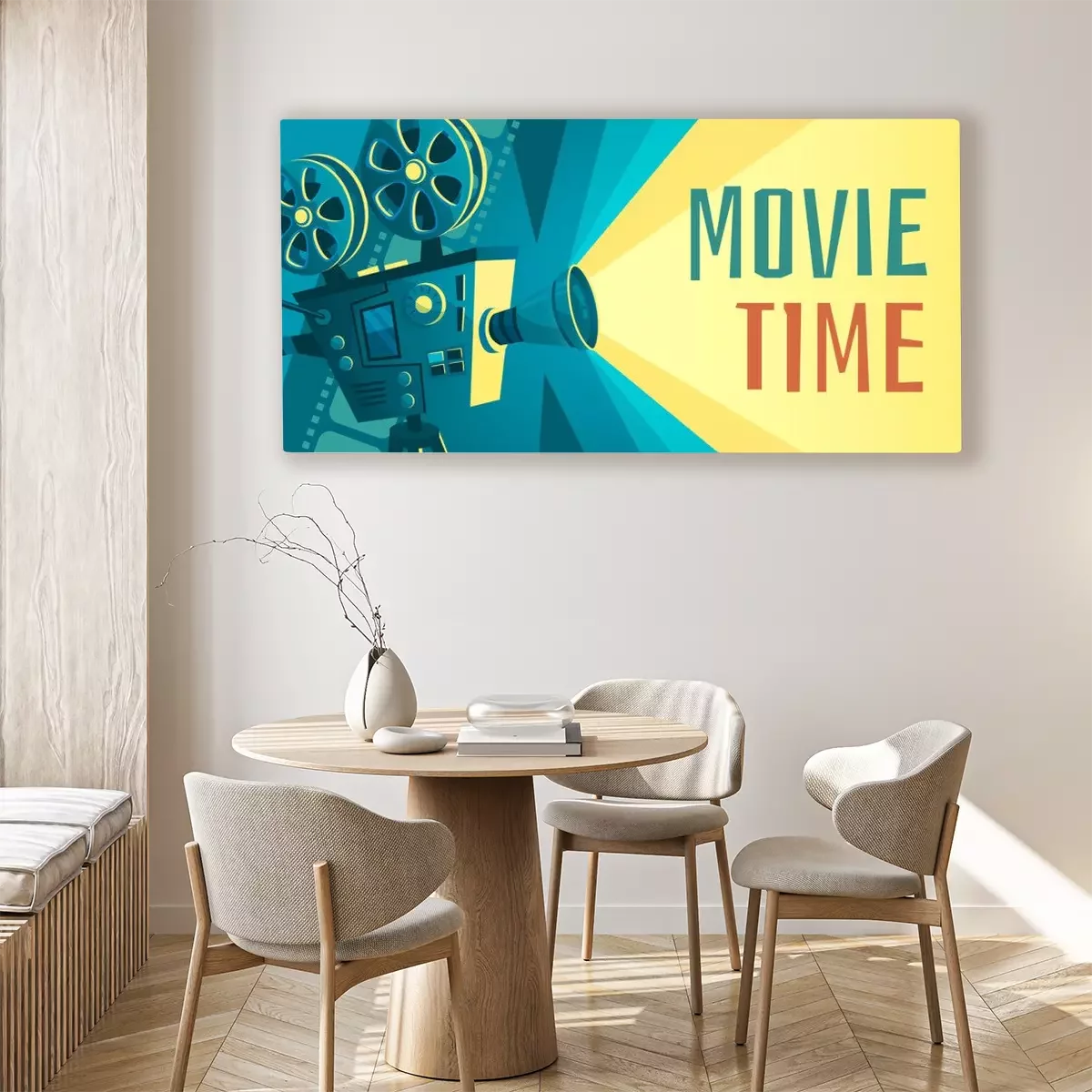 Bild: Movie time poster. Vintage cinema film projector, home movie theater and retro camera. Cinematography entertainment equipment, movies production festival banner vector illustration