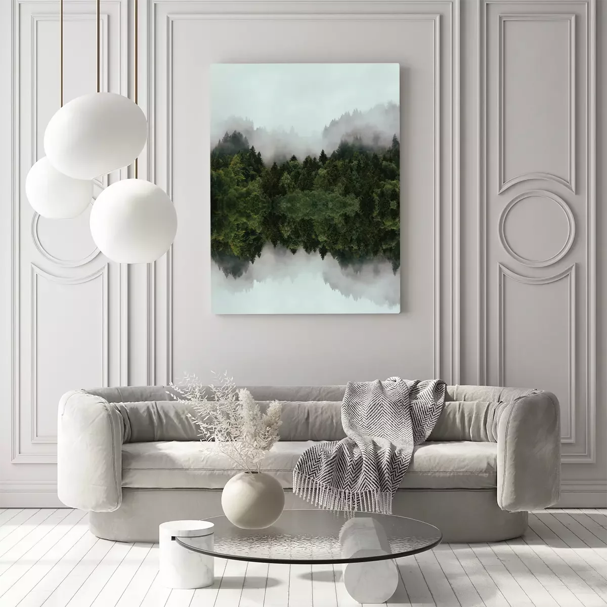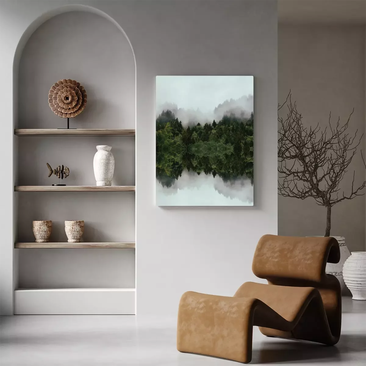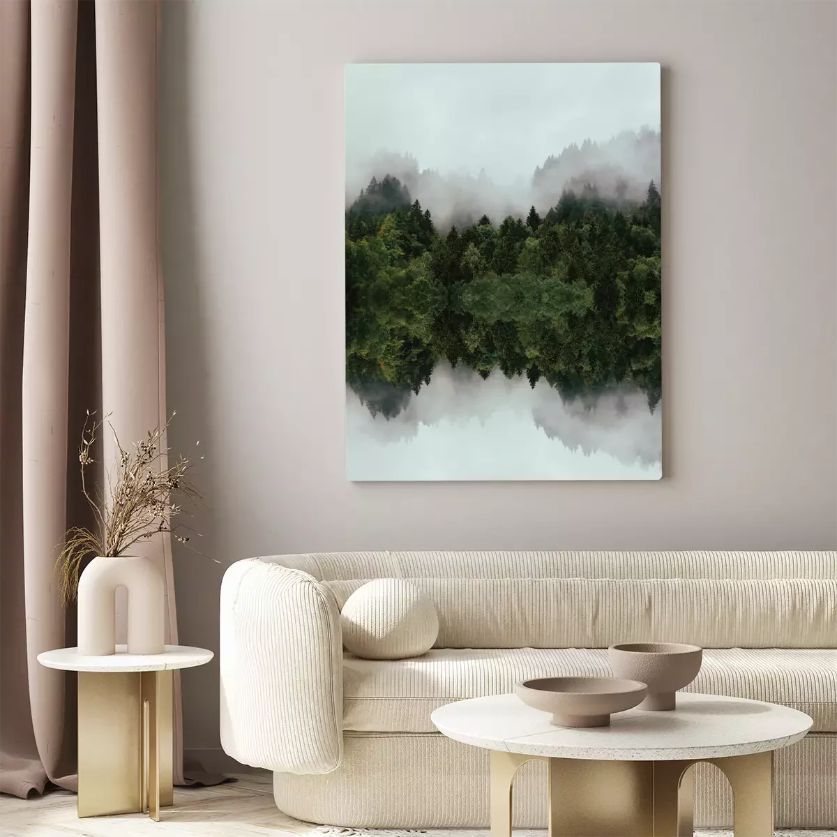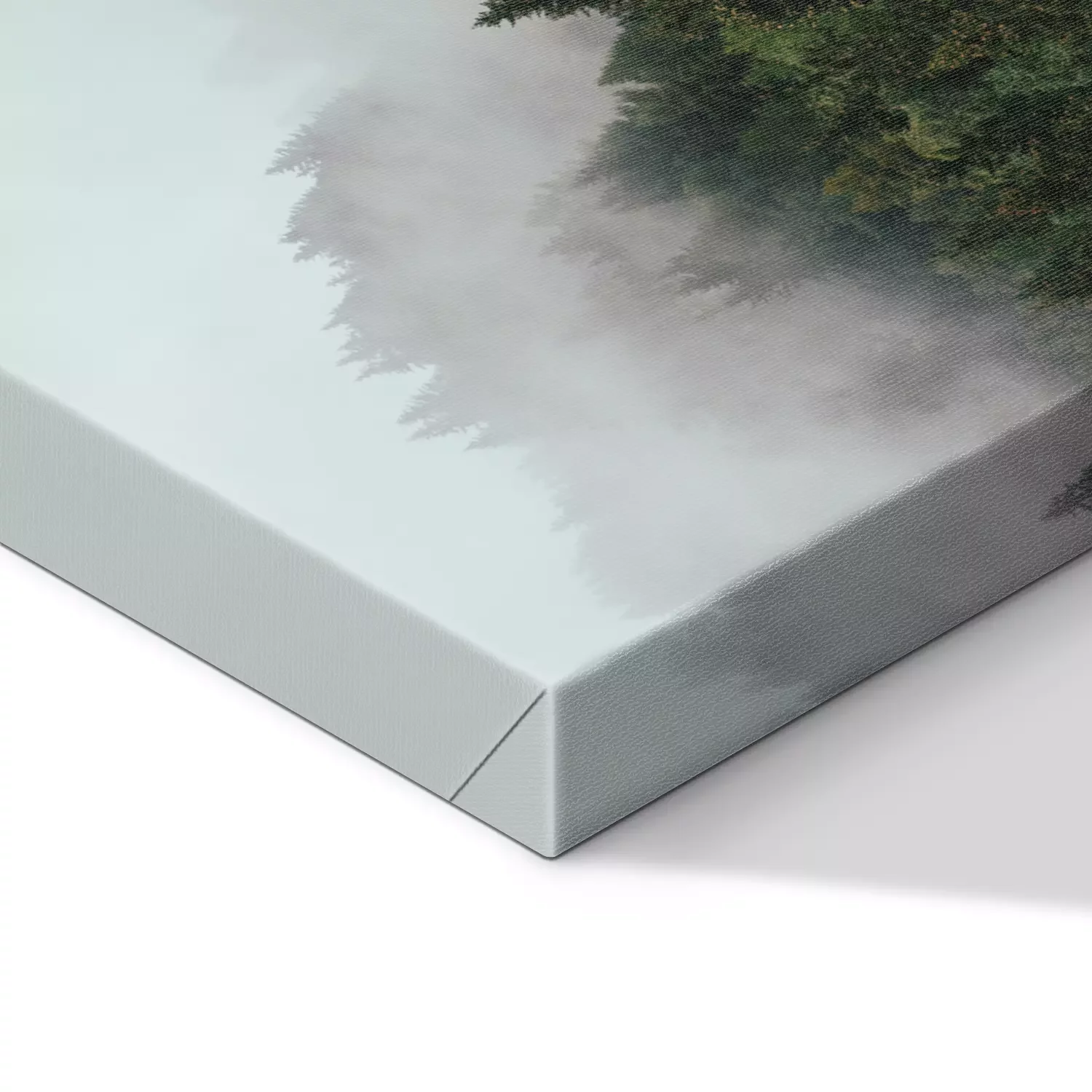 Nadelwald im nebel mit spiegelnder reflexion