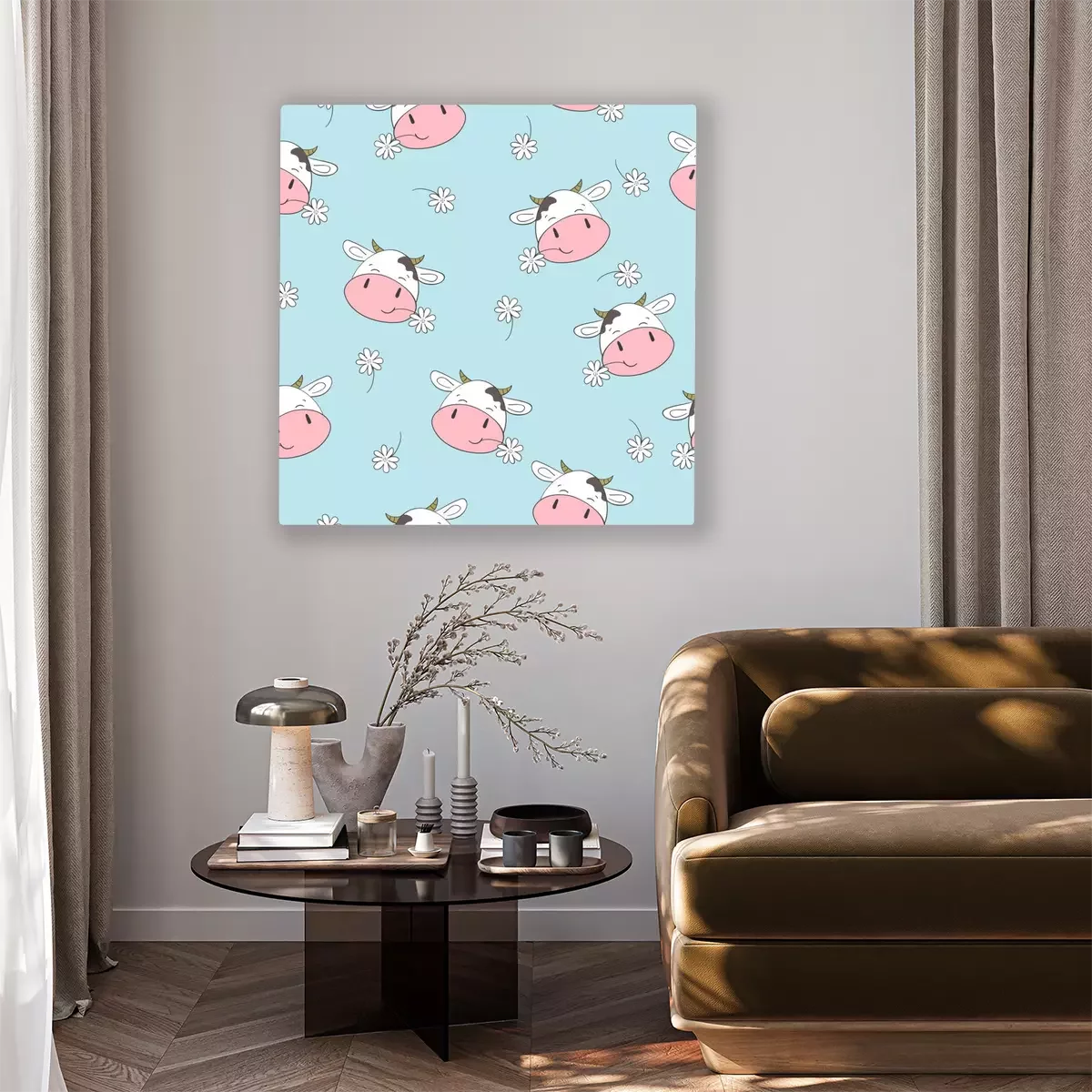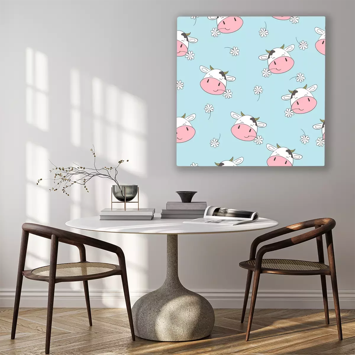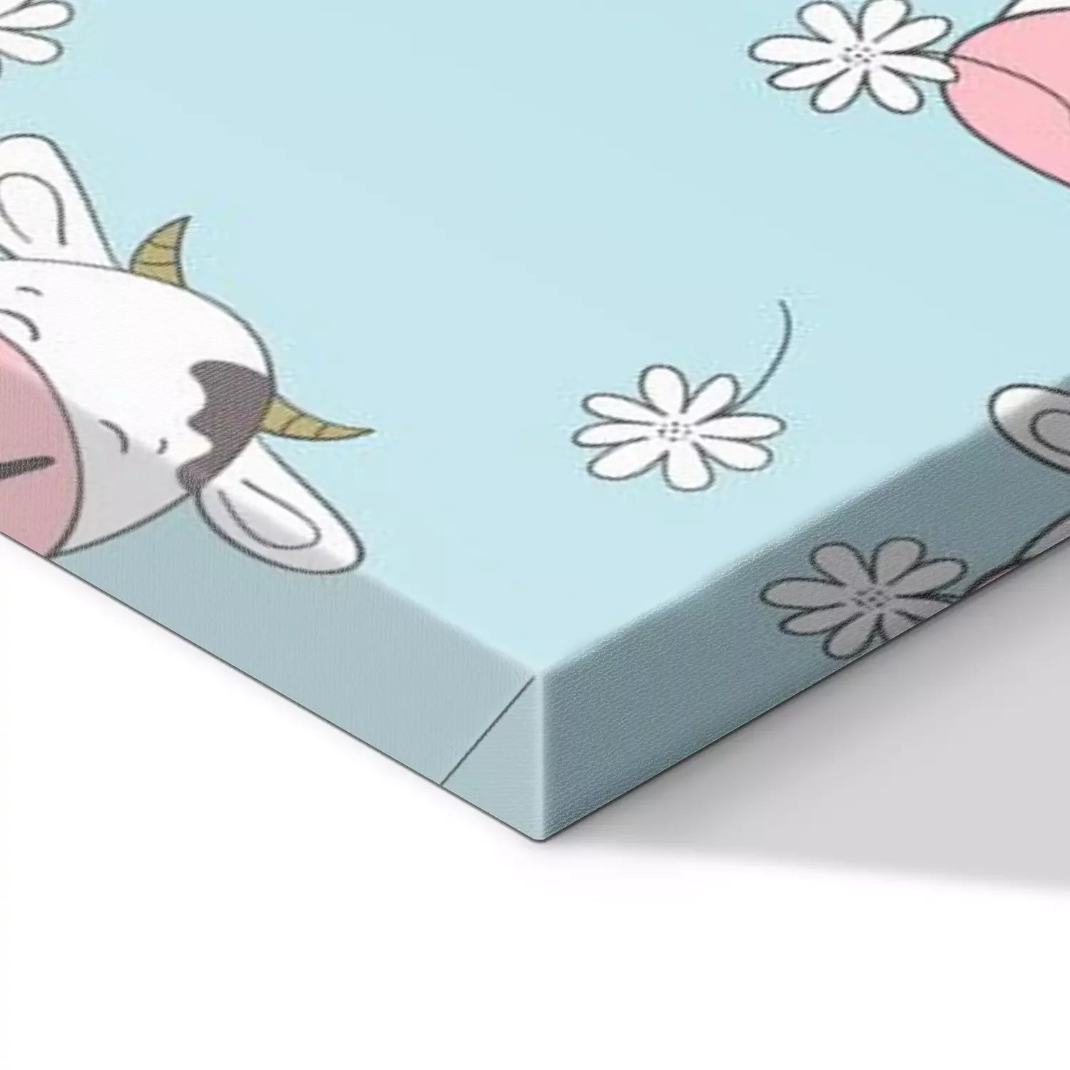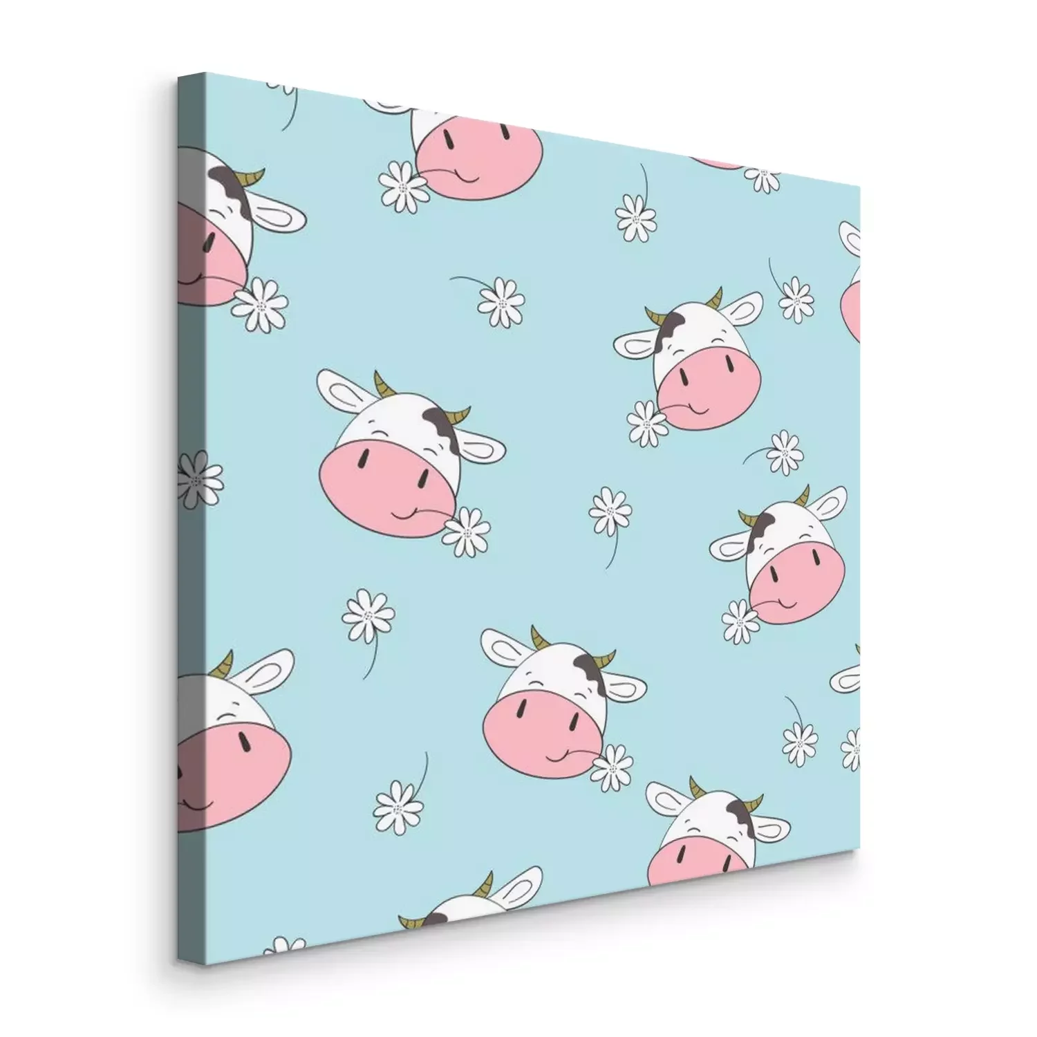 Bild: Niedliche Kühe zwischen Gänseblümchen auf blauem Hintergrund