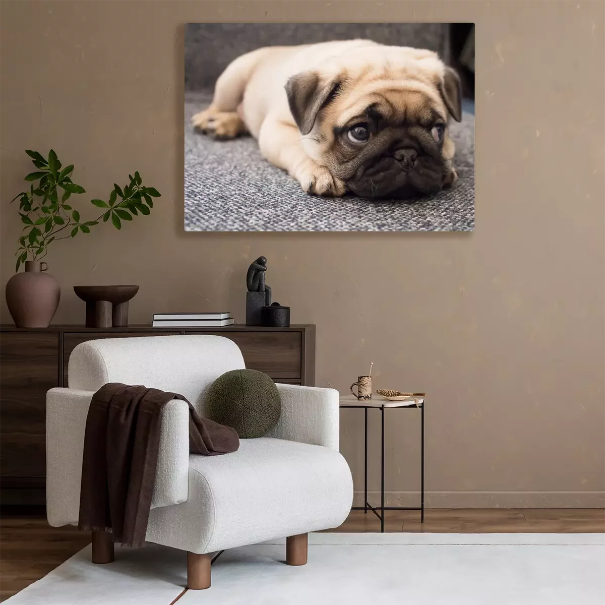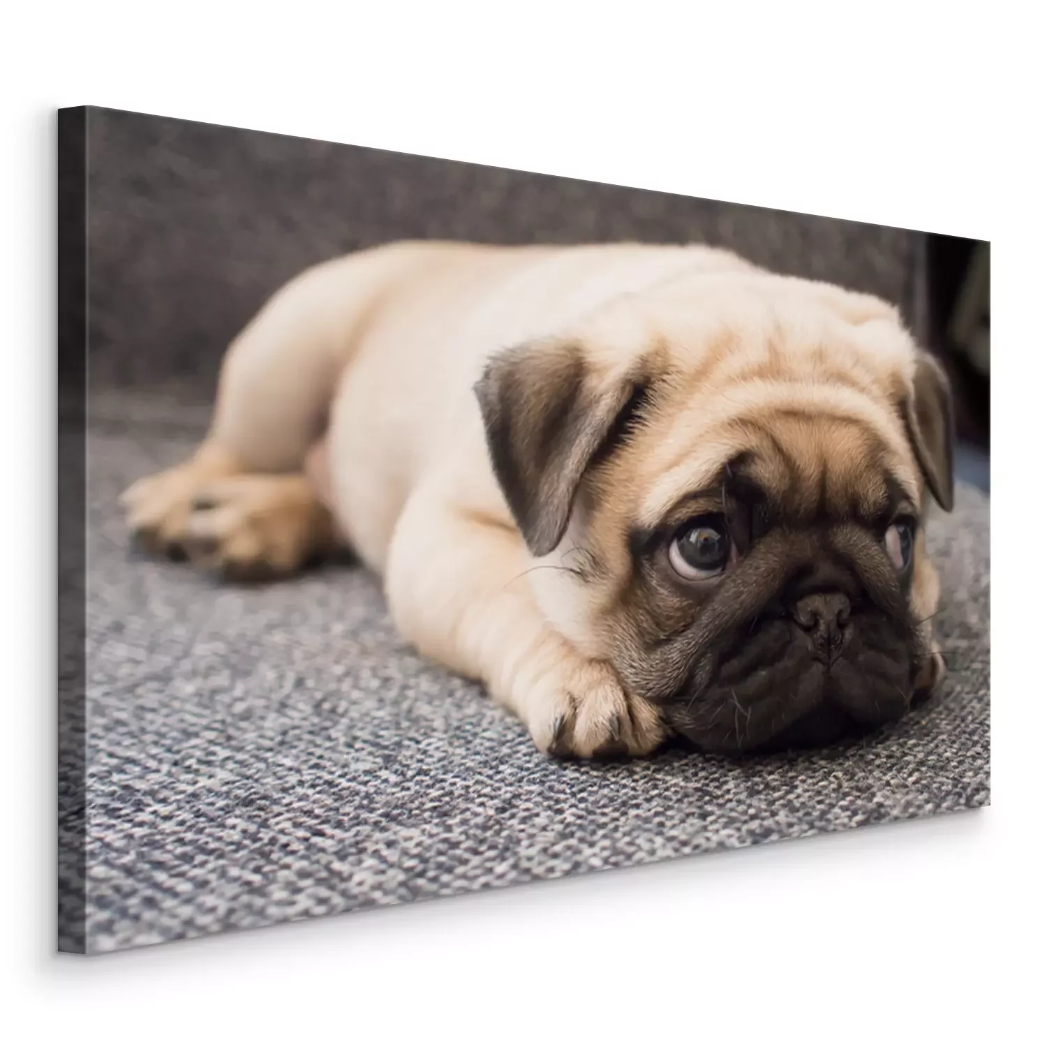 Pfote eines Mops, der auf dem Teppich ruht