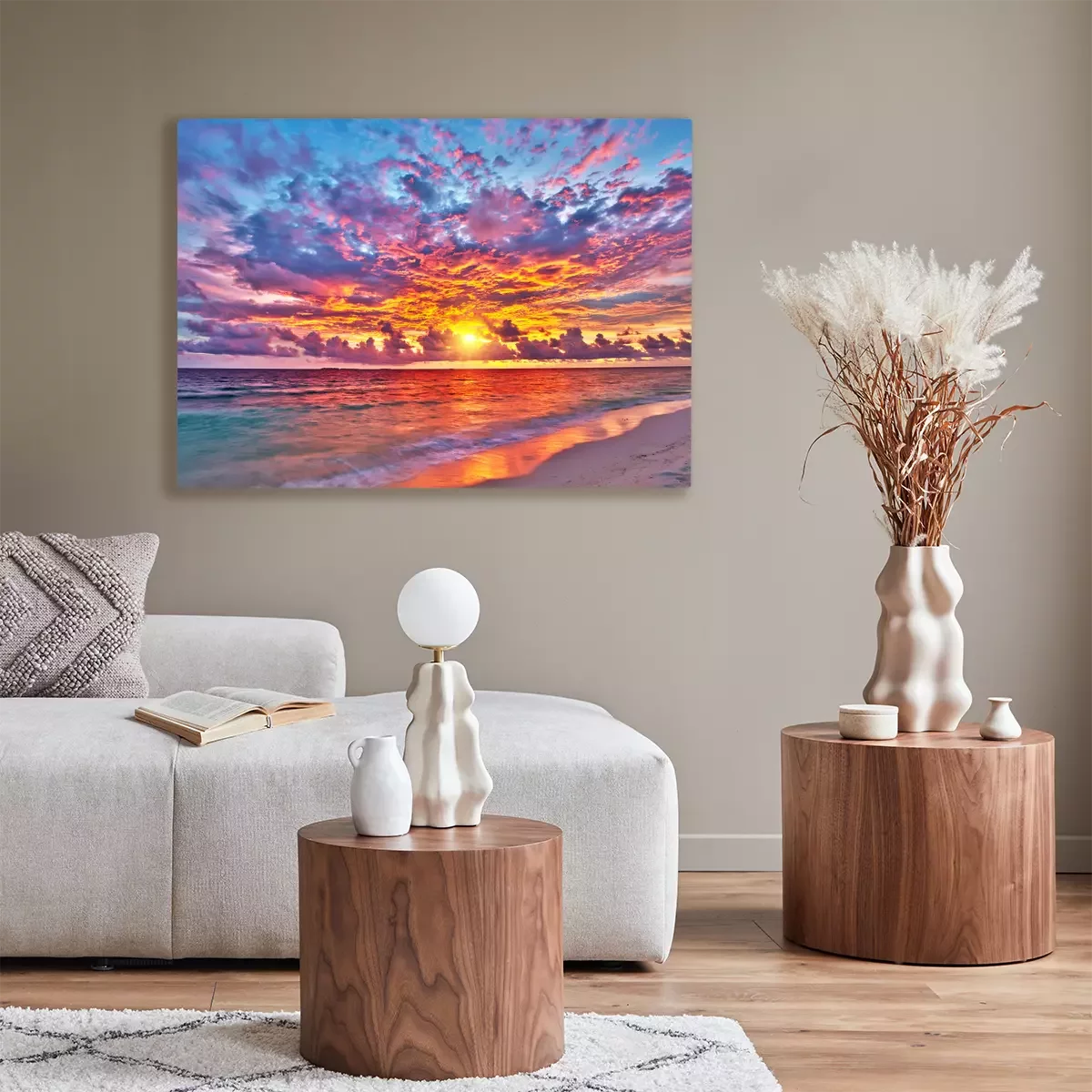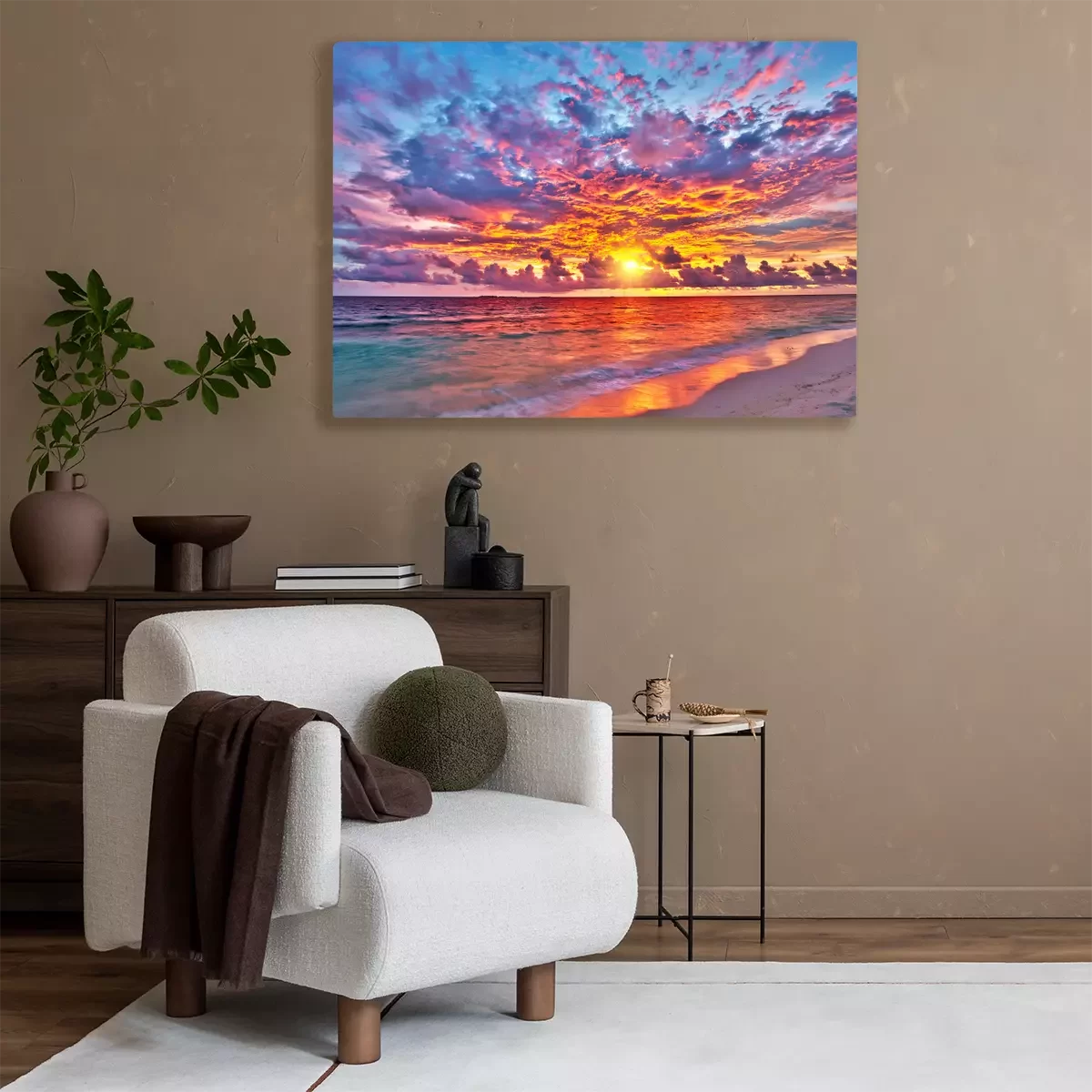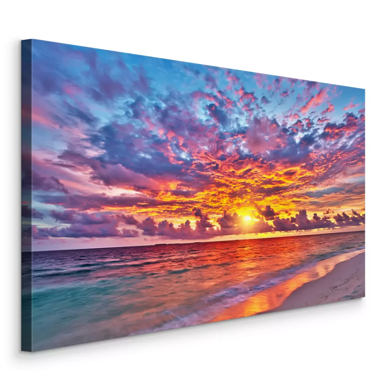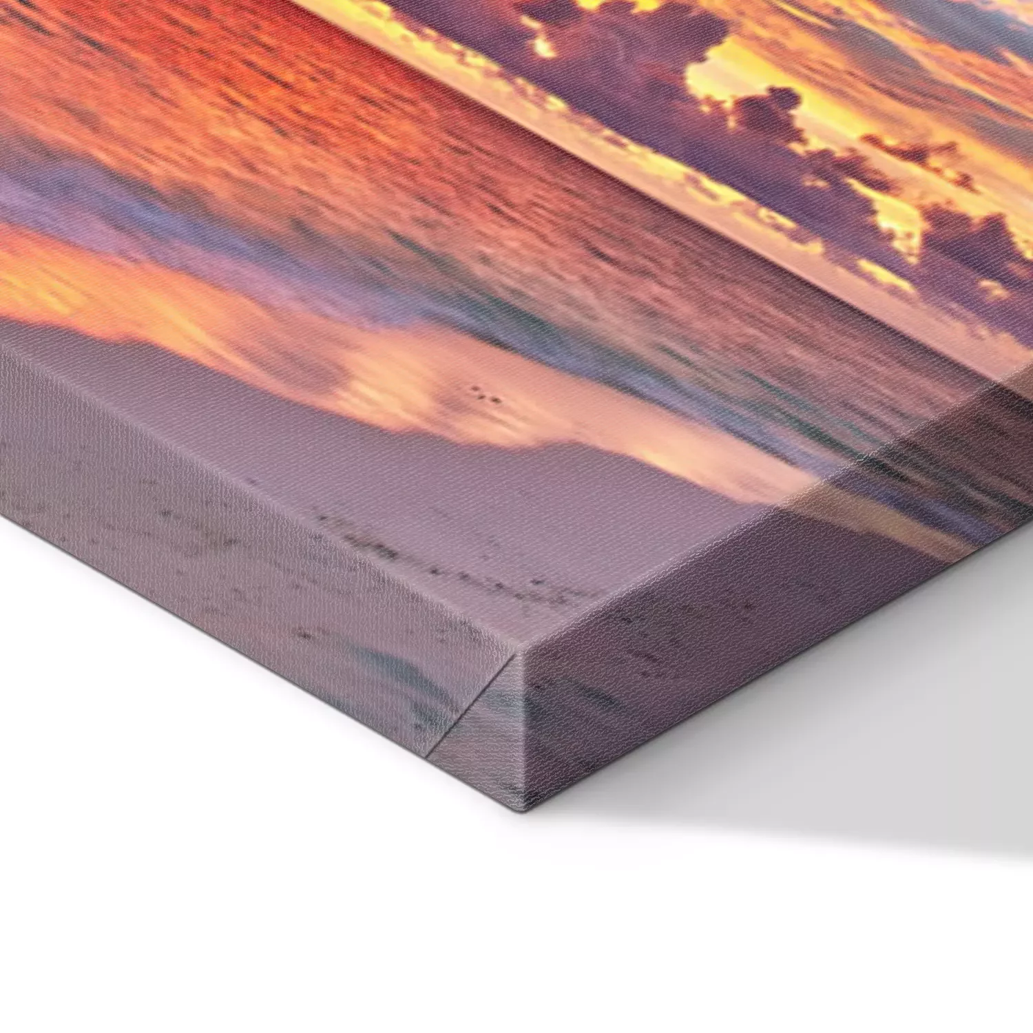 Bringen Sie eine faszinierende Farbenpracht in Ihr Zimmer mit einem malerischen Bild. Sonnenuntergang über dem Meer ermöglicht es Ihnen, unabhängig von Ihrem Wohnort eine spektakuläre Aussicht zu genießen. Hunderte von Kilometern mögen Sie von der Küste trennen, und doch ist die bezaubernde Landschaft Teil Ihres Alltags. Was sofort ins Auge fällt, ist die wunderschöne Farbpalette. Der Himmel leuchtet in allen Farben, und die von der Sonne beleuchteten Wolken haben einen goldenen Glanz. Wenn Sie nach einem dekorativen Akzent suchen, der seinesgleichen sucht, ist eine hervorragende Wahl das hier präsentierte Bild. Meer funktioniert nicht nur in einer maritimen Einrichtung. Landschaften sind universell und zeitlos. Wenn Sie also die Küste lieben, können Sie nach einem solchen Muster greifen. Unser Tipp: Entscheiden Sie sich für ein großformatiges Bild. Strand, der sich bis zum Horizont erstreckt und mit einem märchenhaften Himmel versehen ist, sieht auf einem großen Foto großartig aus. Der richtige Abbildungsmaßstab ermöglicht es, die wahre Majestät des Meeres einzufangen. Ein romantisch eingerichtetes Schlafzimmer mit pastellfarbenen Textilien und Rattanakzenten ist der perfekte Ort, um das Bild aufzuhängen. Auf diese Weise können Sie eine unbeschwerte Urlaubsatmosphäre schaffen, die der Entspannung und Ruhe förderlich ist. Auch im Wohnzimmer präsentiert sich hervorragend dieses malerische Bild. Sonnenuntergang wird durch die intensive Farbenpracht zu einer starken Dominante der Einrichtung, wodurch ein Raum, der bisher ausdruckslos war, Charakter gewinnt. Da unsere Wanddekorationen aus hochwertigen Materialien hergestellt werden, spricht nichts dagegen, ein solches Motiv auch im Badezimmer zu platzieren. Ein Bild Meer wird so zu einer schönen Kulisse für entspannende Bäder und verwandelt eine gewöhnliche Einrichtung in ein Home Spa. Die Natur beruhigt nicht nur die Sinne, sondern besticht auch durch ihr Aussehen, daher setzen Sie bei der Suche nach einer schönen und zeitlosen Innendekoration auf ein solches Bild. Strand mit einem spektakulären Sonnenuntergang lässt Sie die Majestät des Meeres genießen, wo auch immer Sie wohnen!