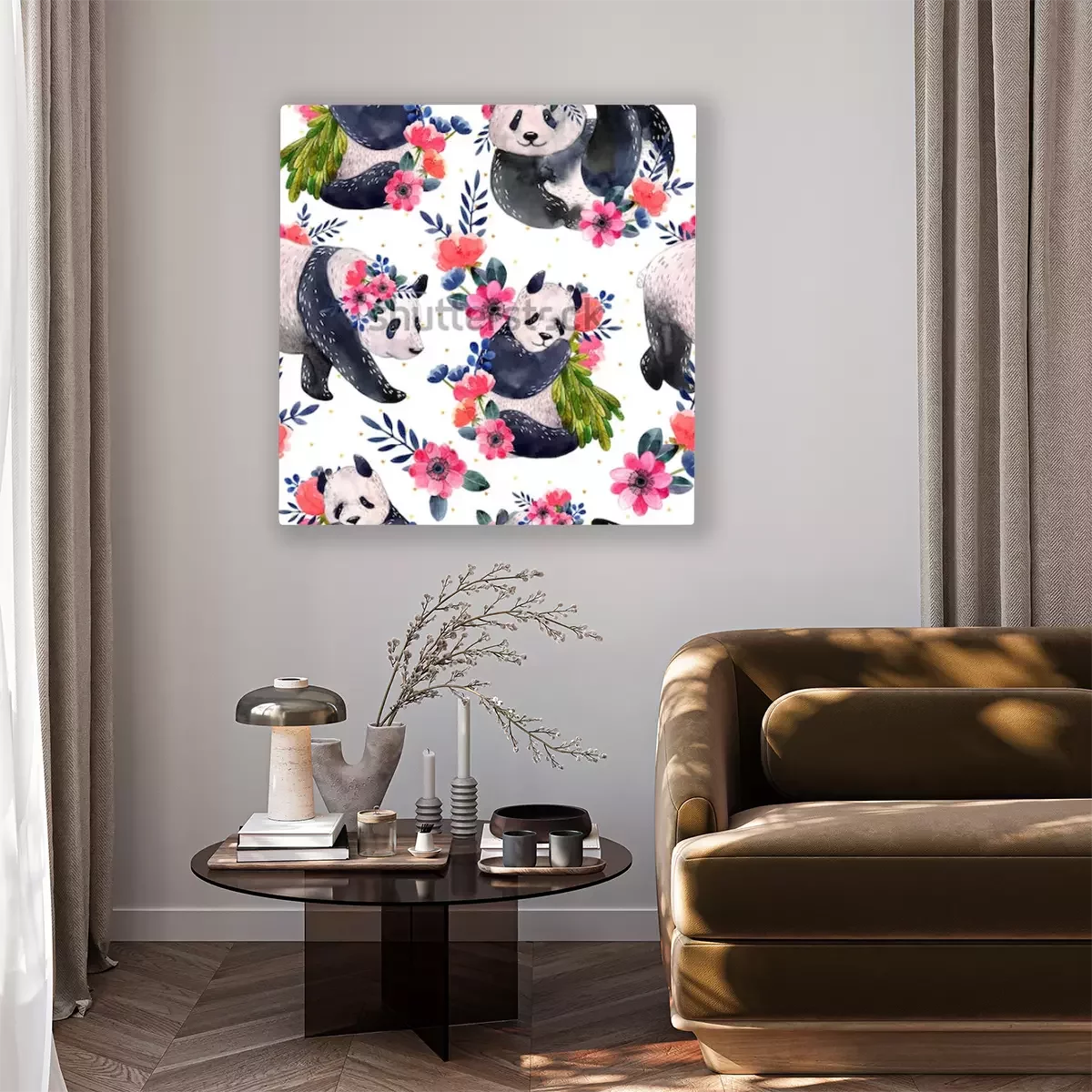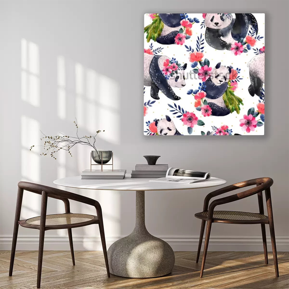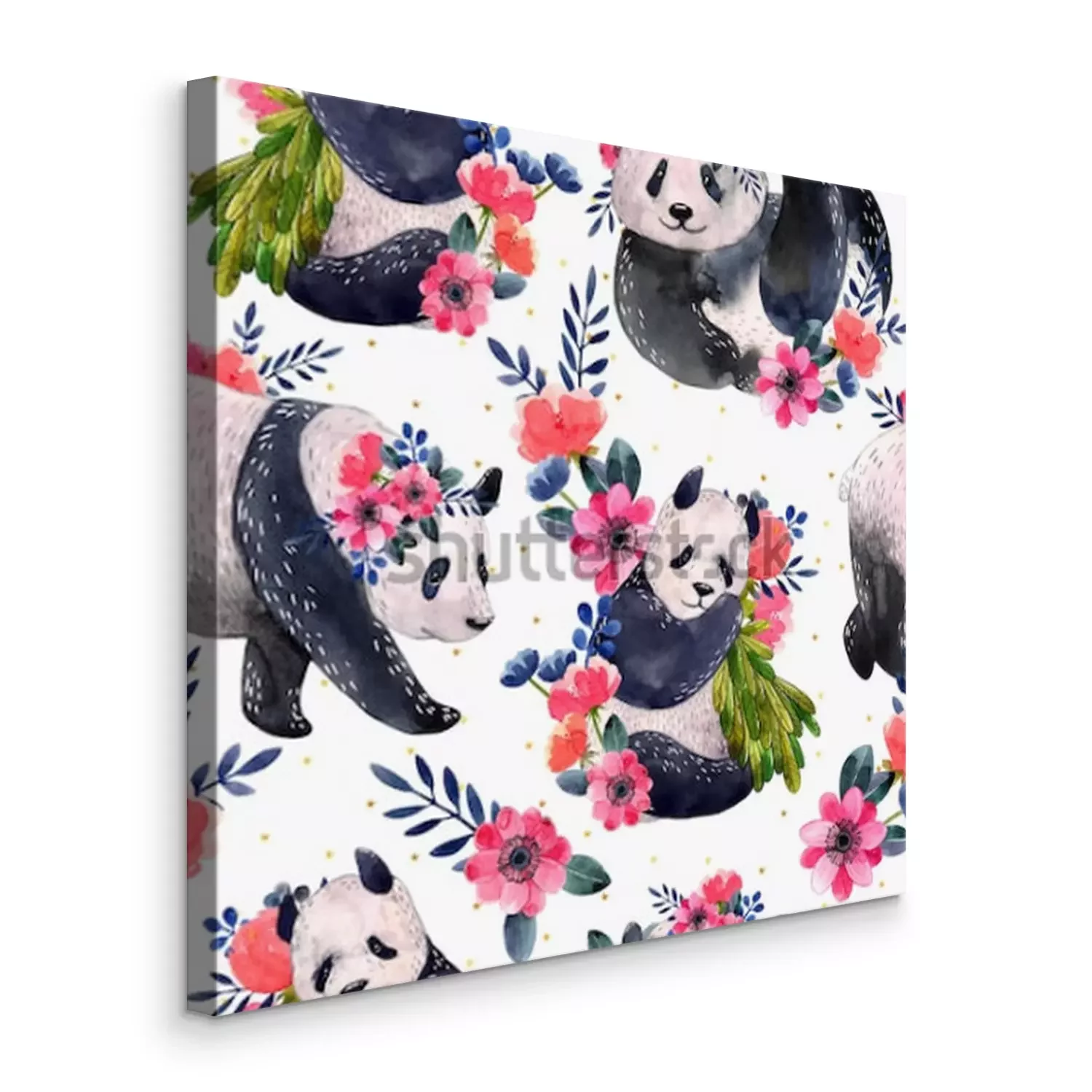 Bild: Pandas in verschiedenen Posen mit Blumen geschmückt