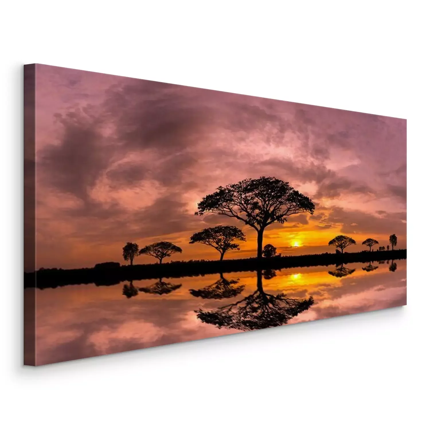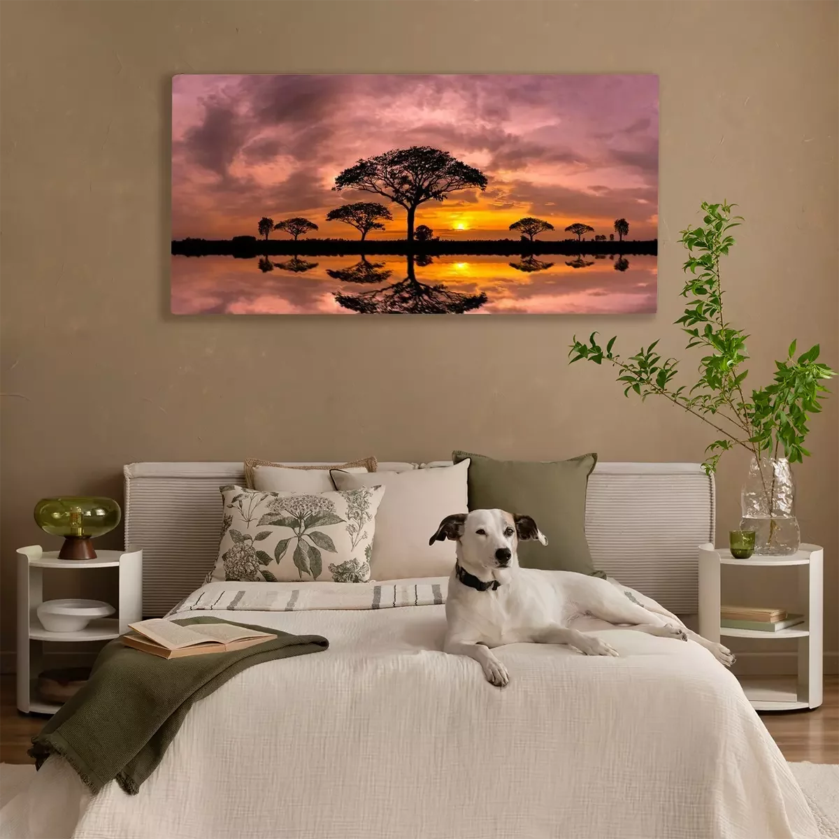 Bild Panorama silhouette tree and Mountain with sunset.Tree silhouetted against a setting sun reflection on water.Typical african sunset with acacia trees in Masai Mara, Kenya.
