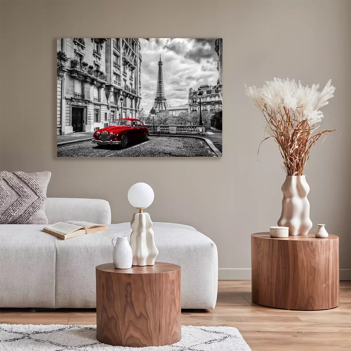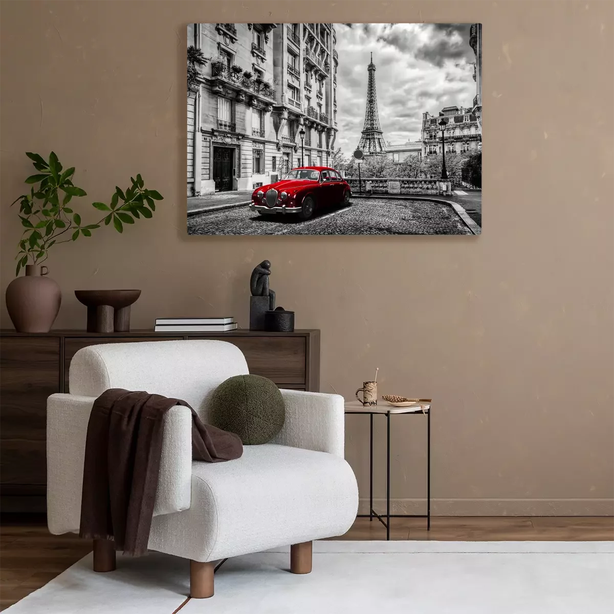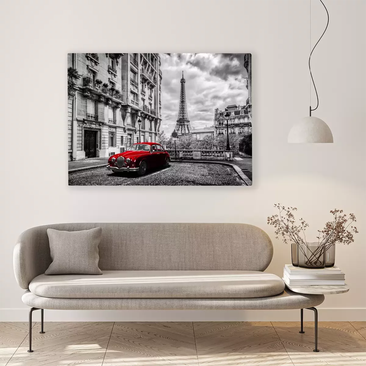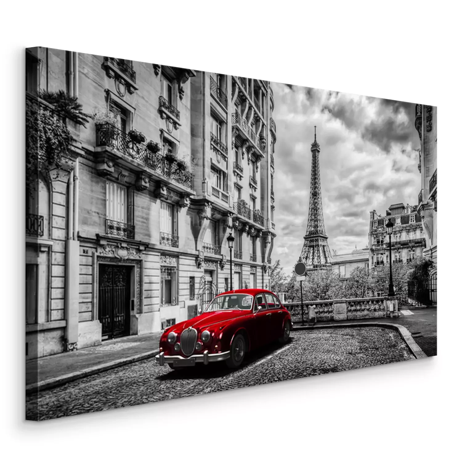 Schwarz-weißer Eiffelturm und rotes Auto