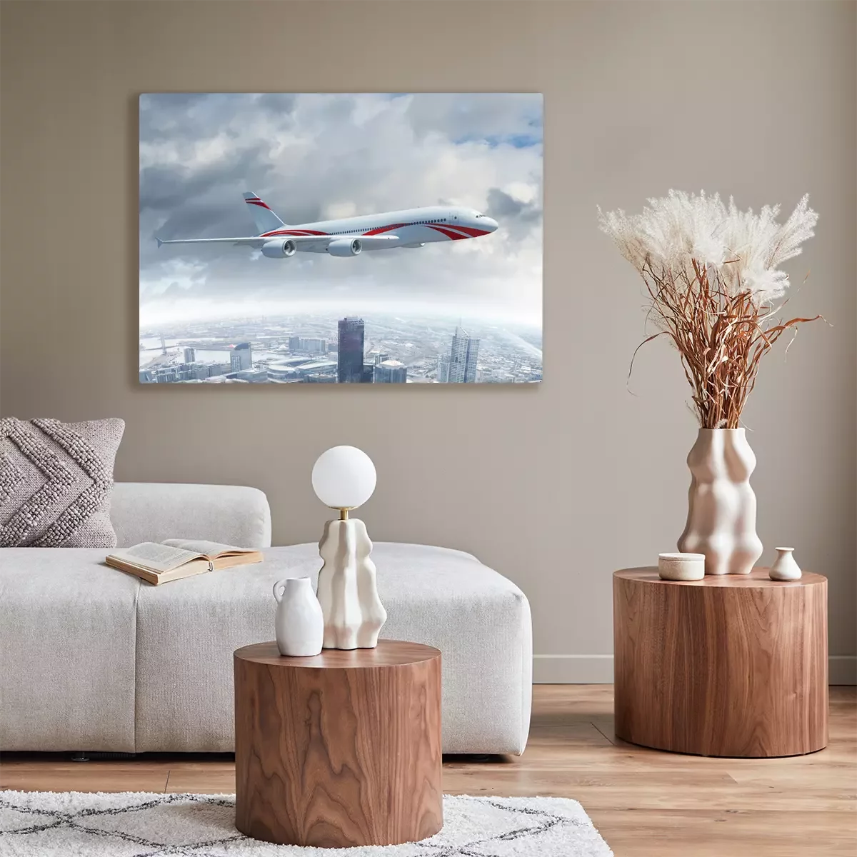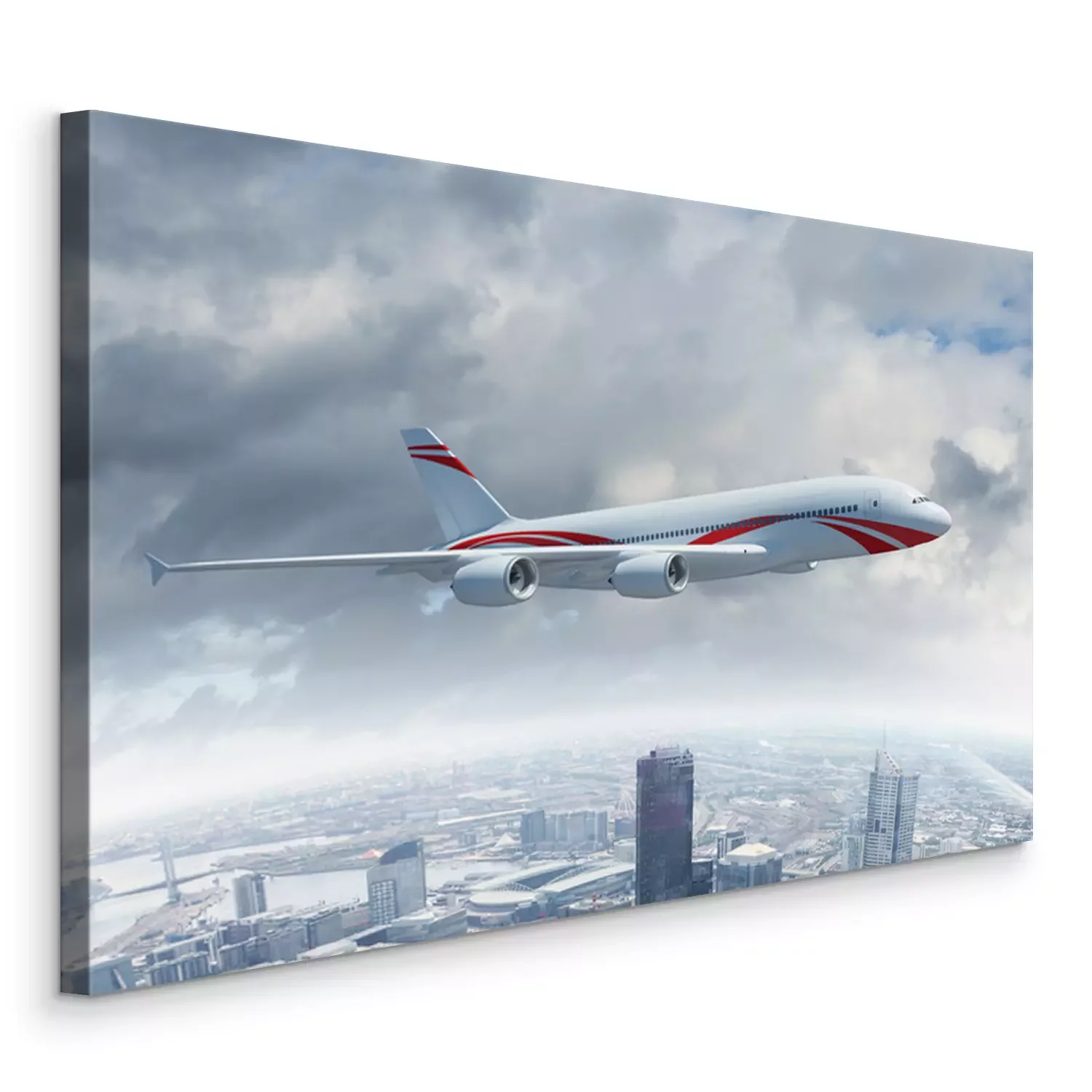Bild: Passagierflugzeug über einer Stadt fliegend