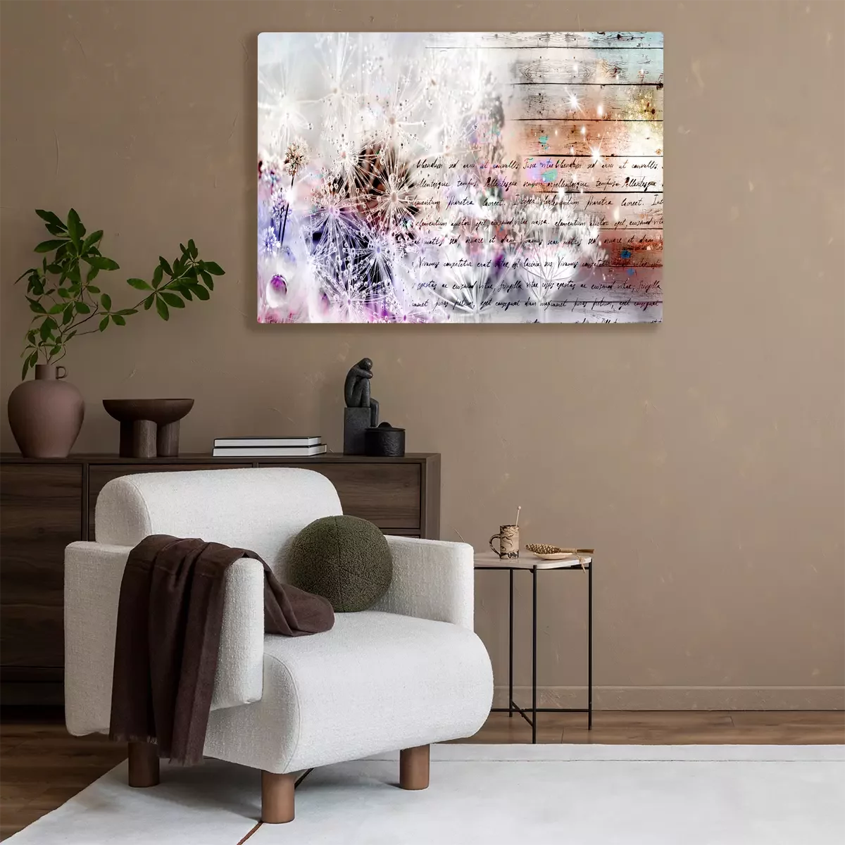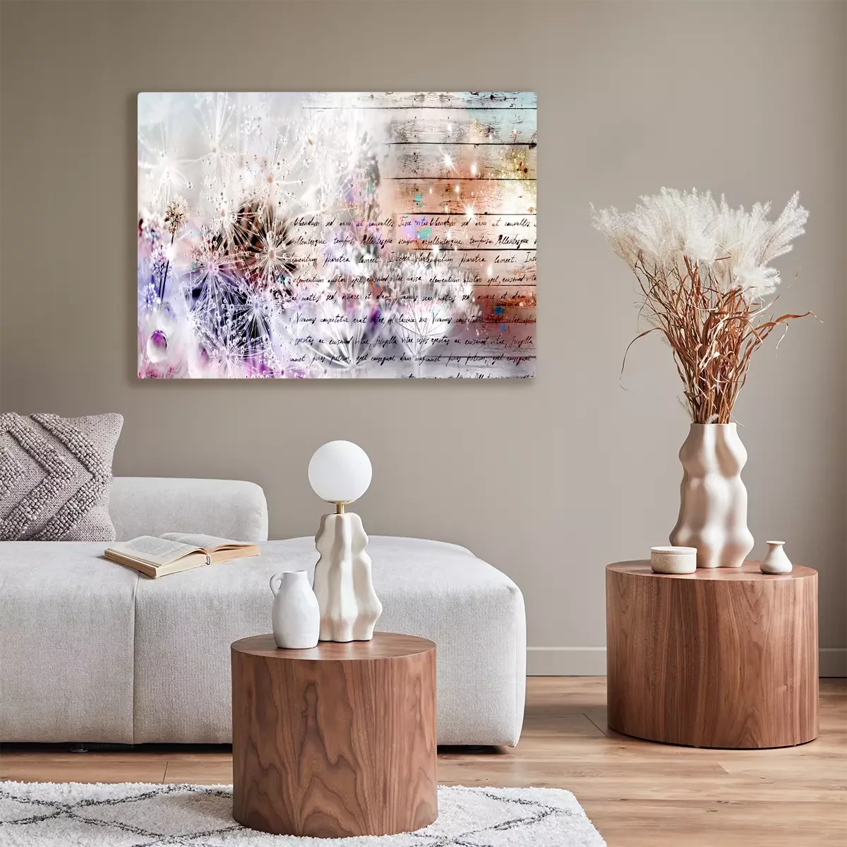 Pastellfarbene löwenzahnblüten mit text auf holzgrund