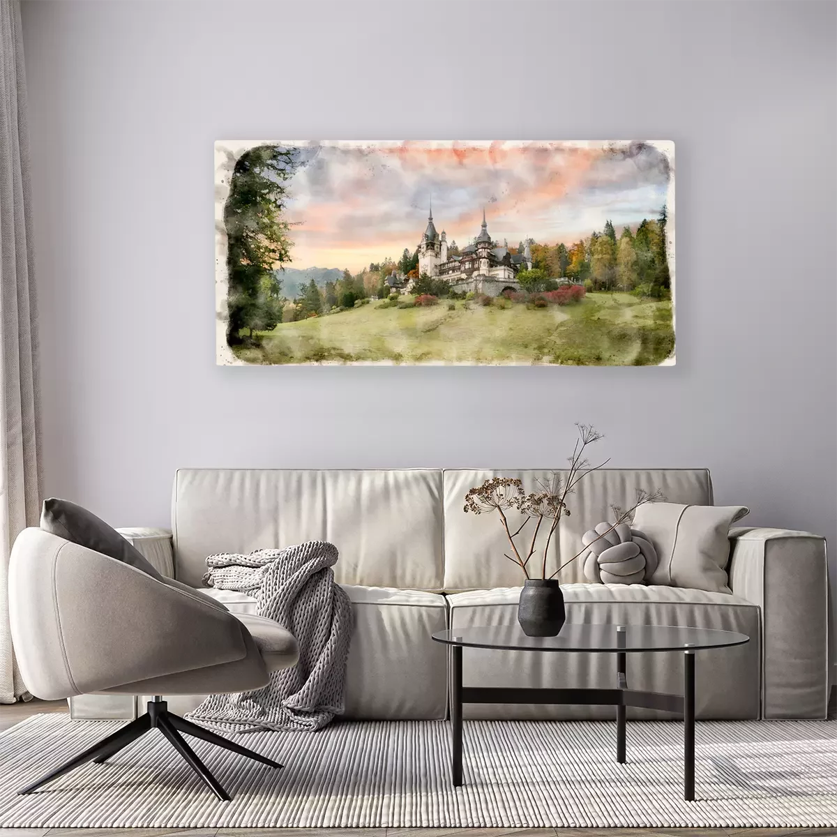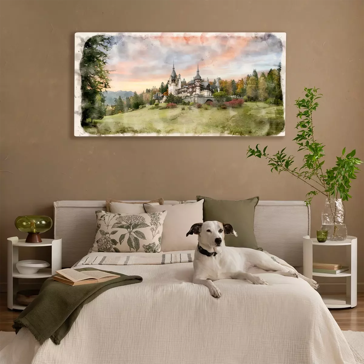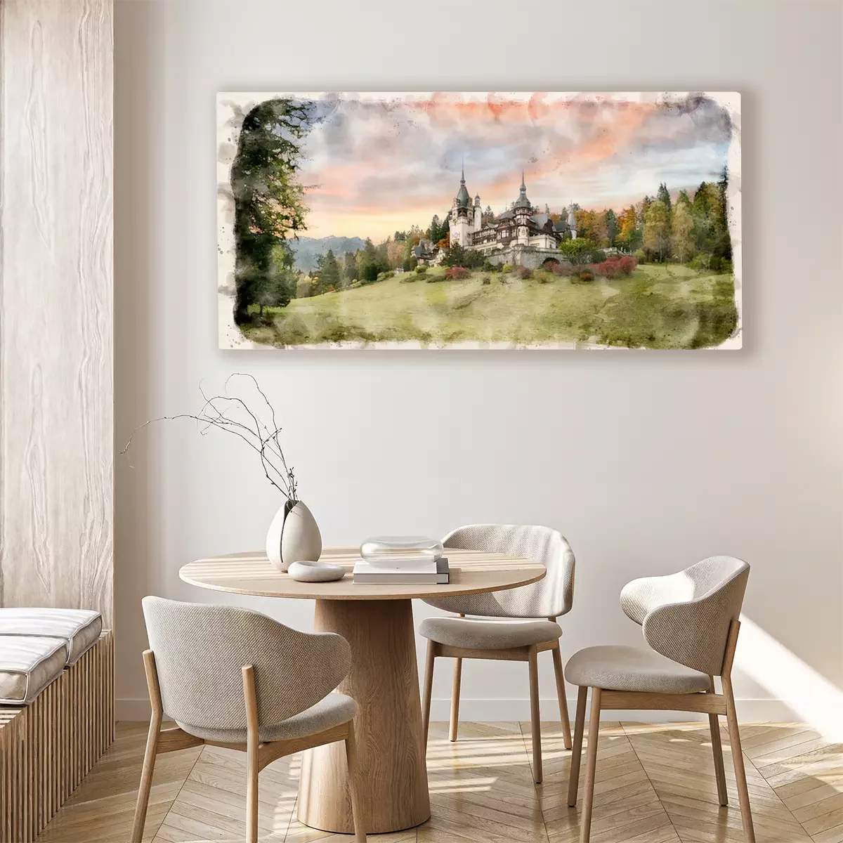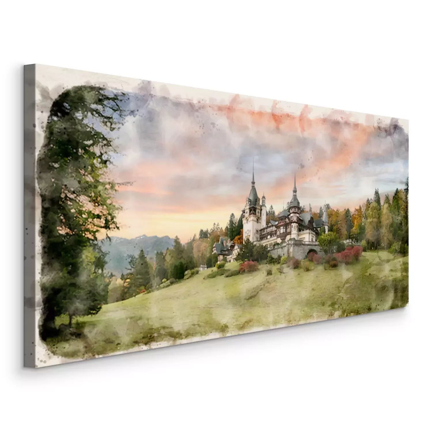 Bild Peles Castle in Sinaia, Romania in watercolor style illustration. Landmark of Carpathian Mountains in Europe