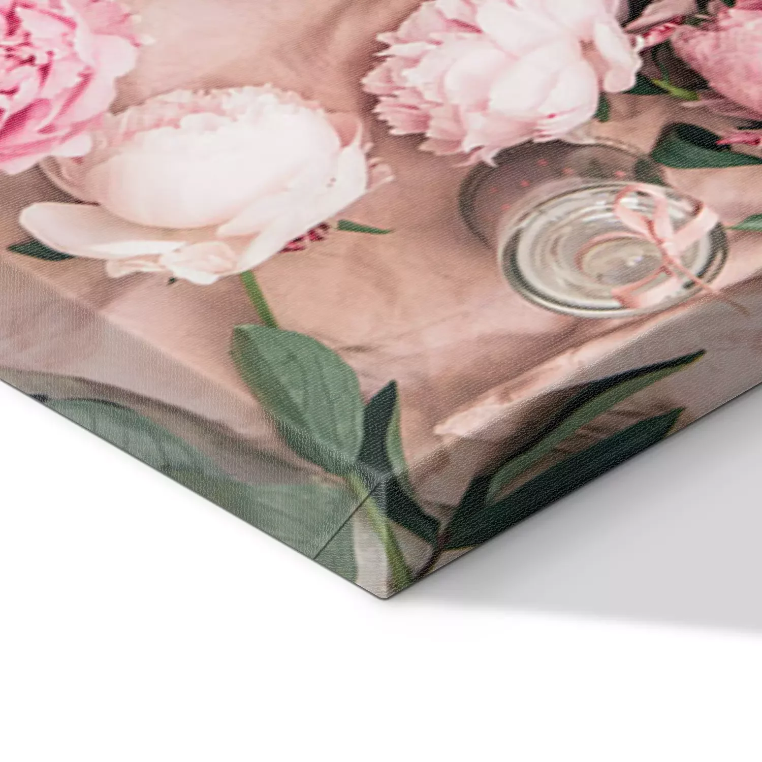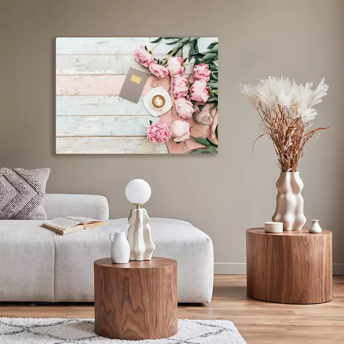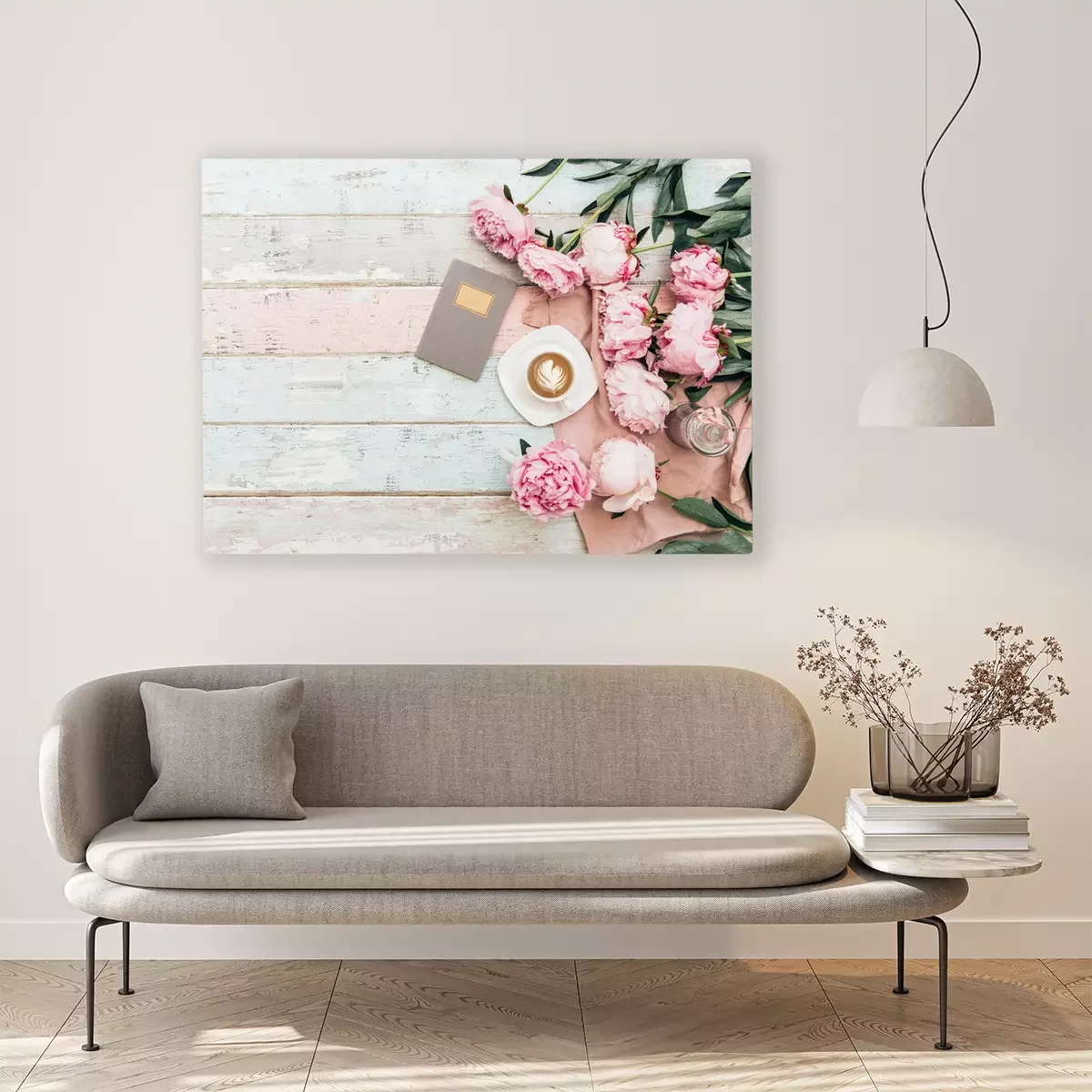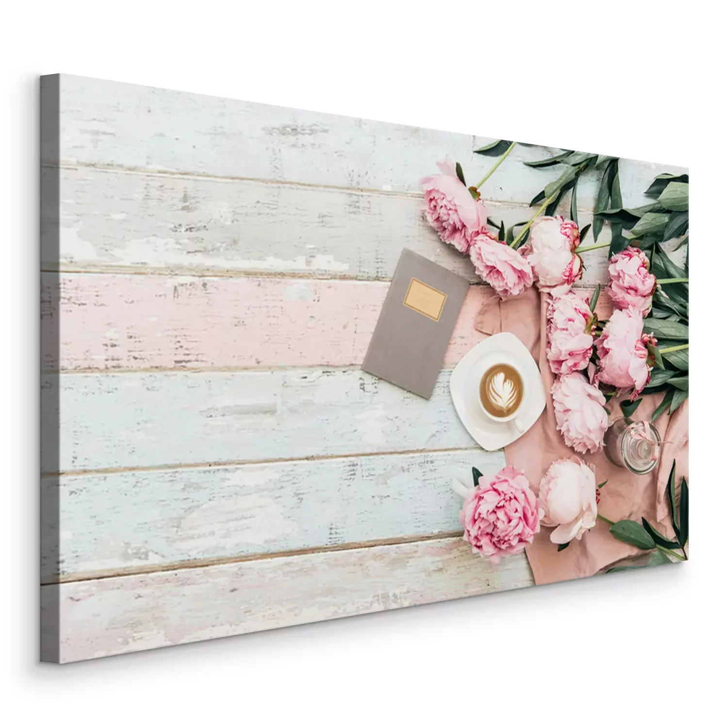 Bild: Pfingstrosen und Kaffee auf Brettern