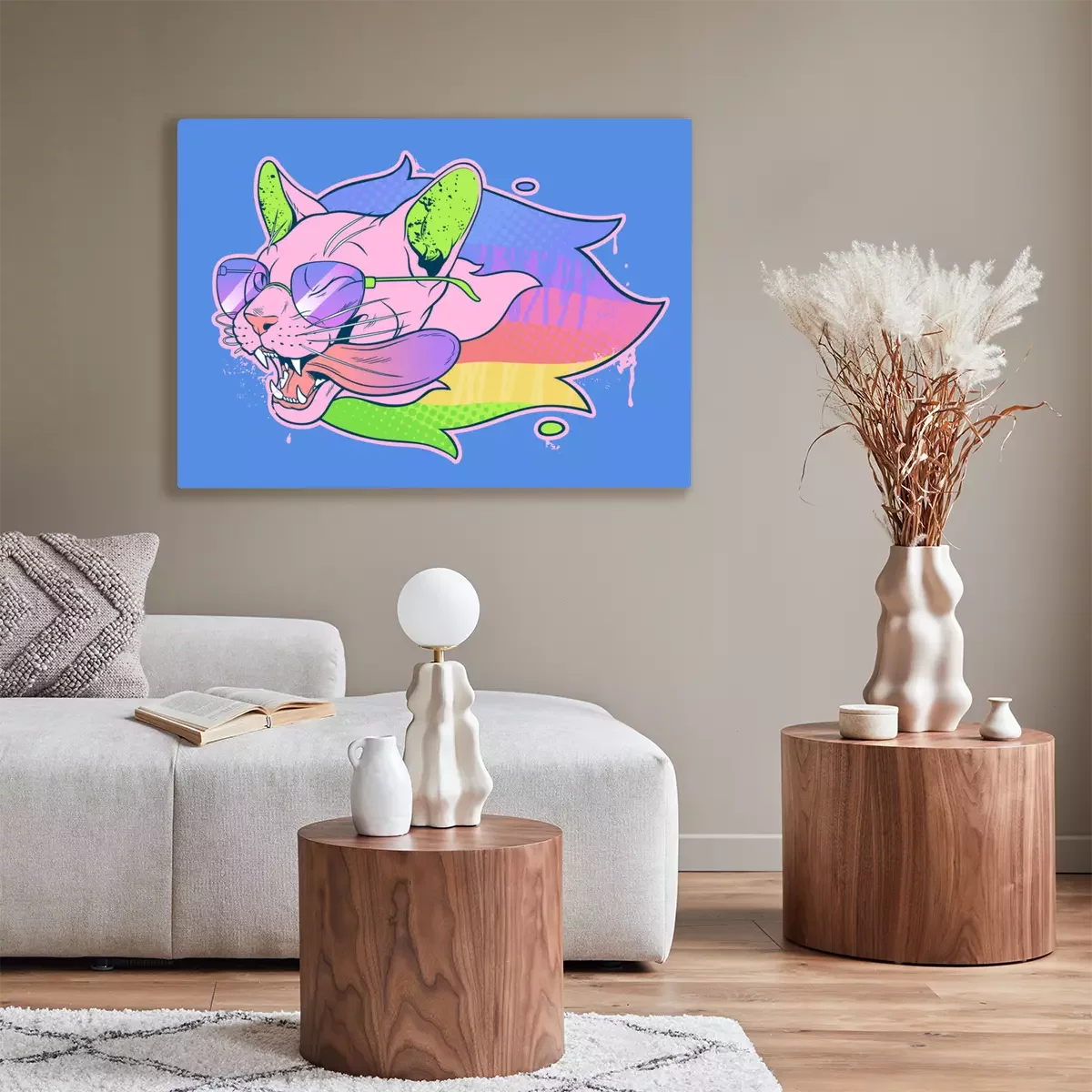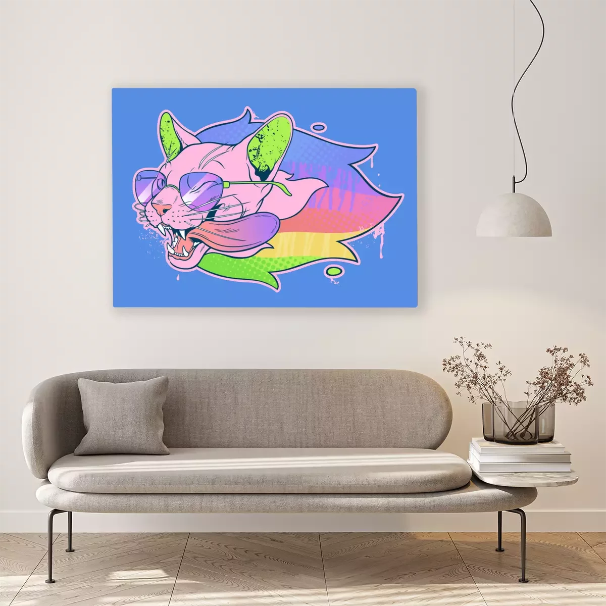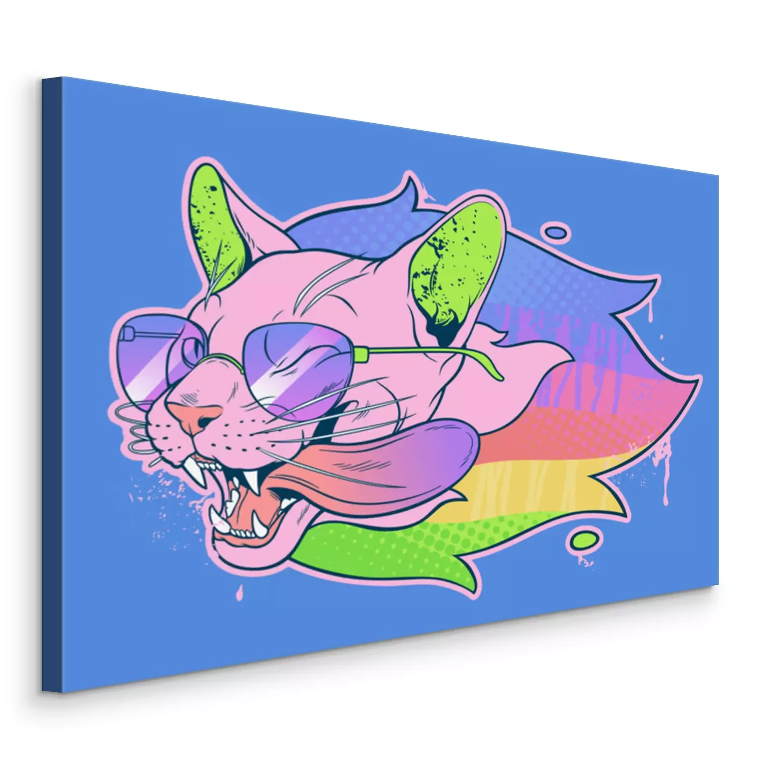Bild Pink cat head with glasses and rainbow. Can be use as T shirt print. Vector illustration.