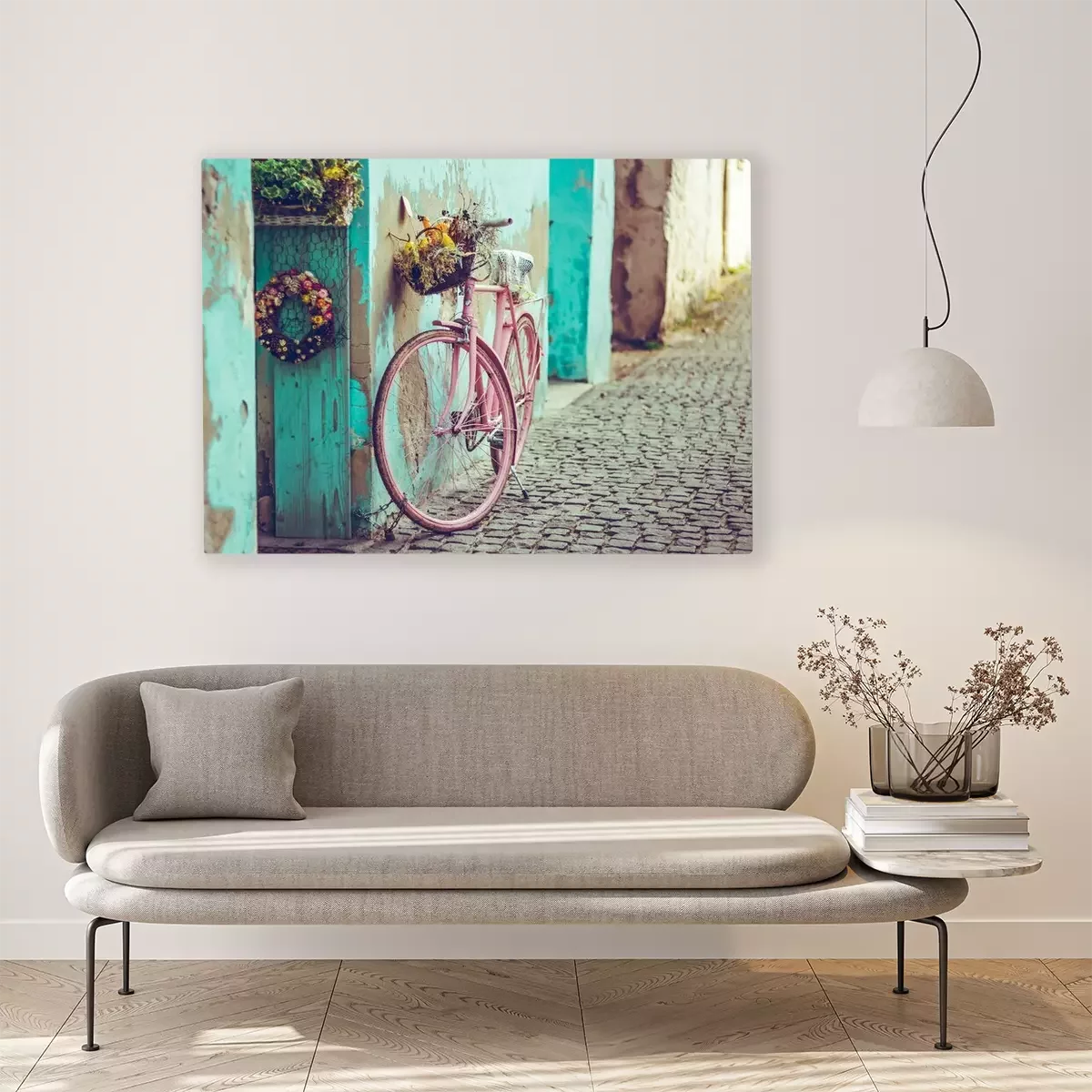 Bild: Pink vintage bike with basket full of flowers next to an old cyan building in Spain