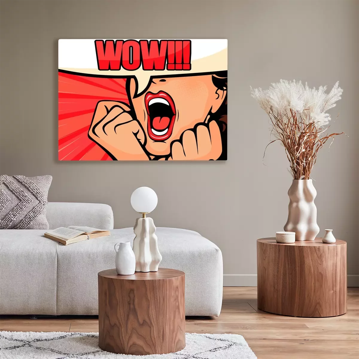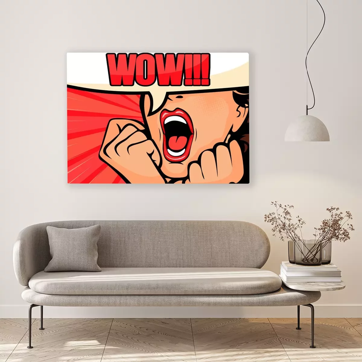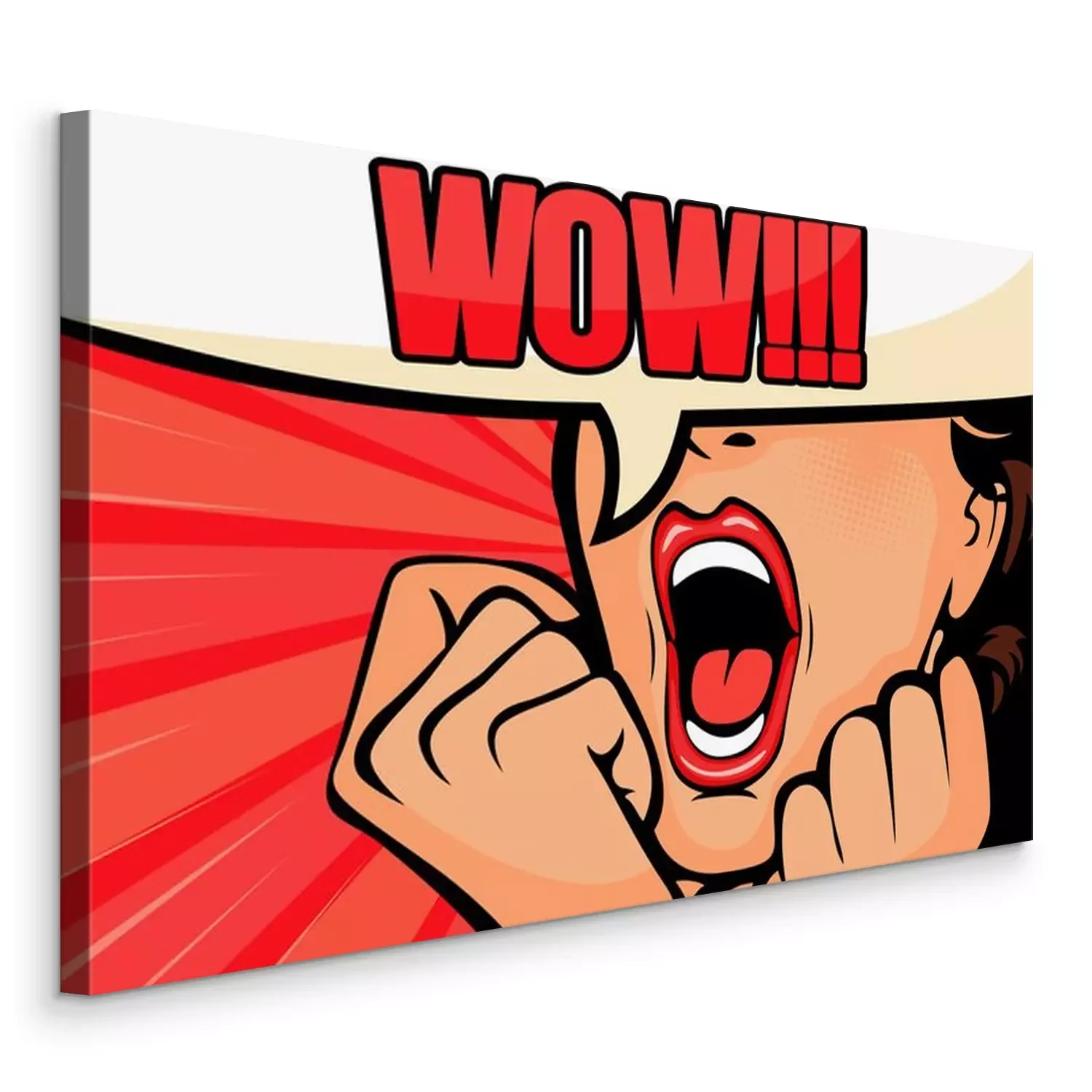Bild Pop art surprised brunette woman face with open mouth. Comic woman with speech bubble illustration.