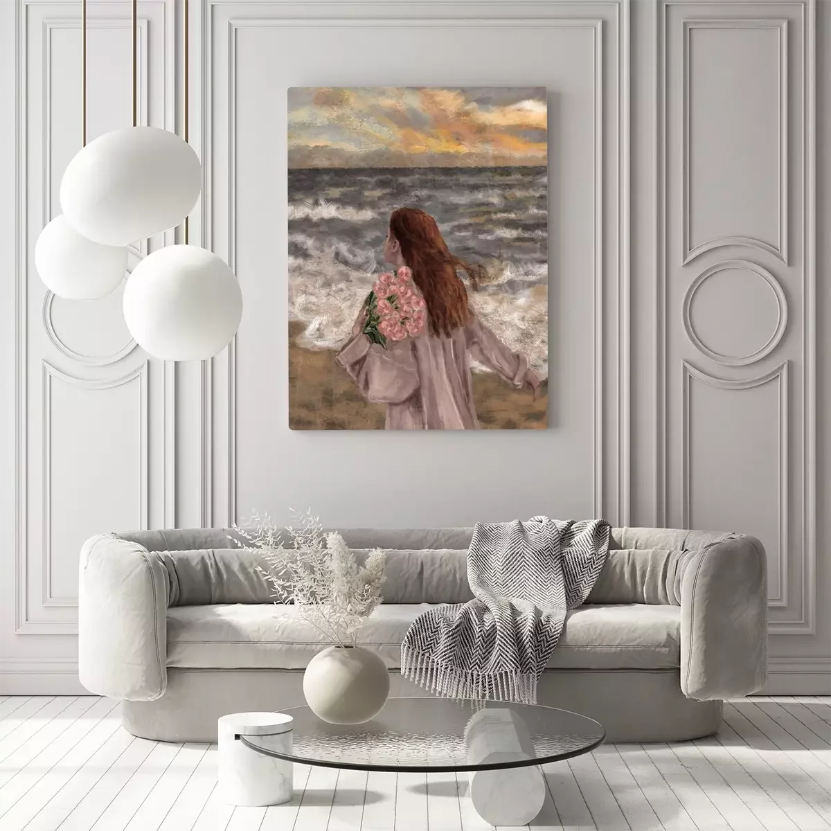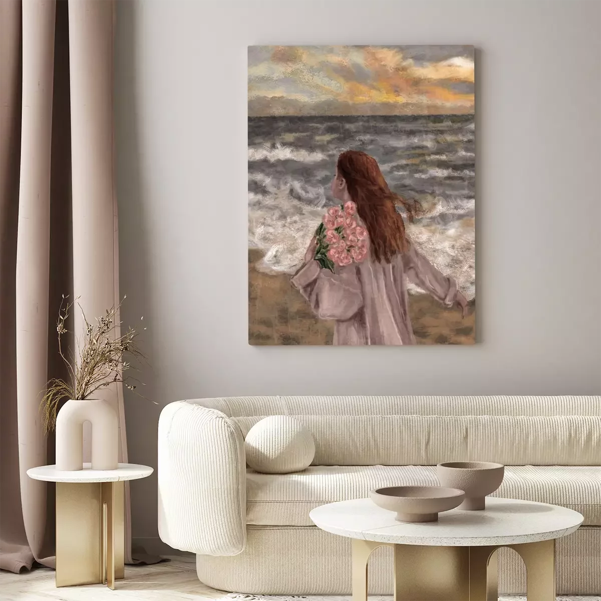 Porträt einer frau mit einem blumenstrauß vor meereshintergrund