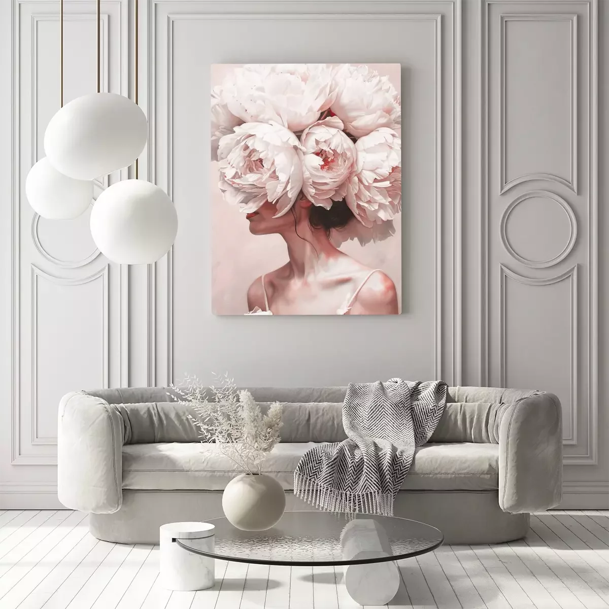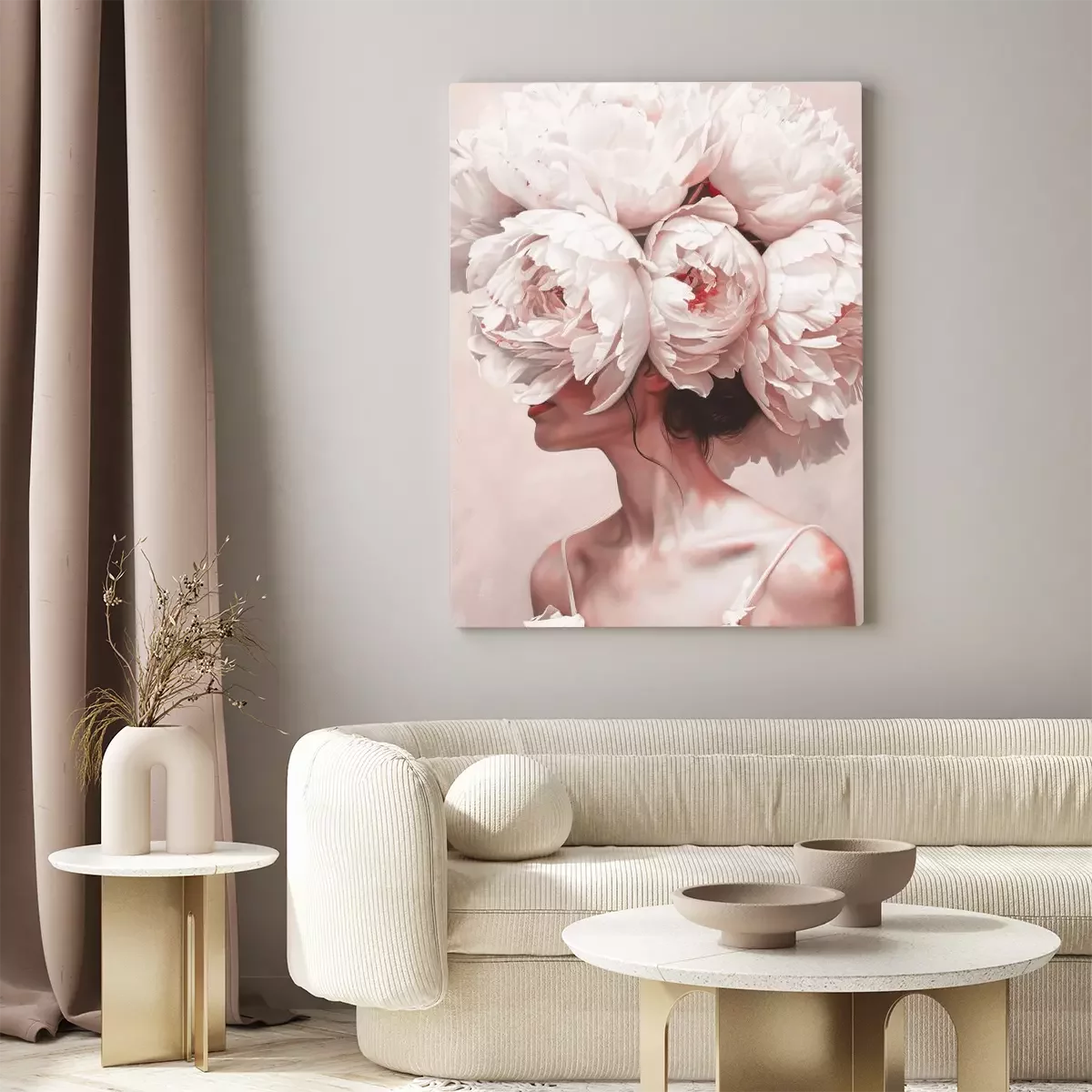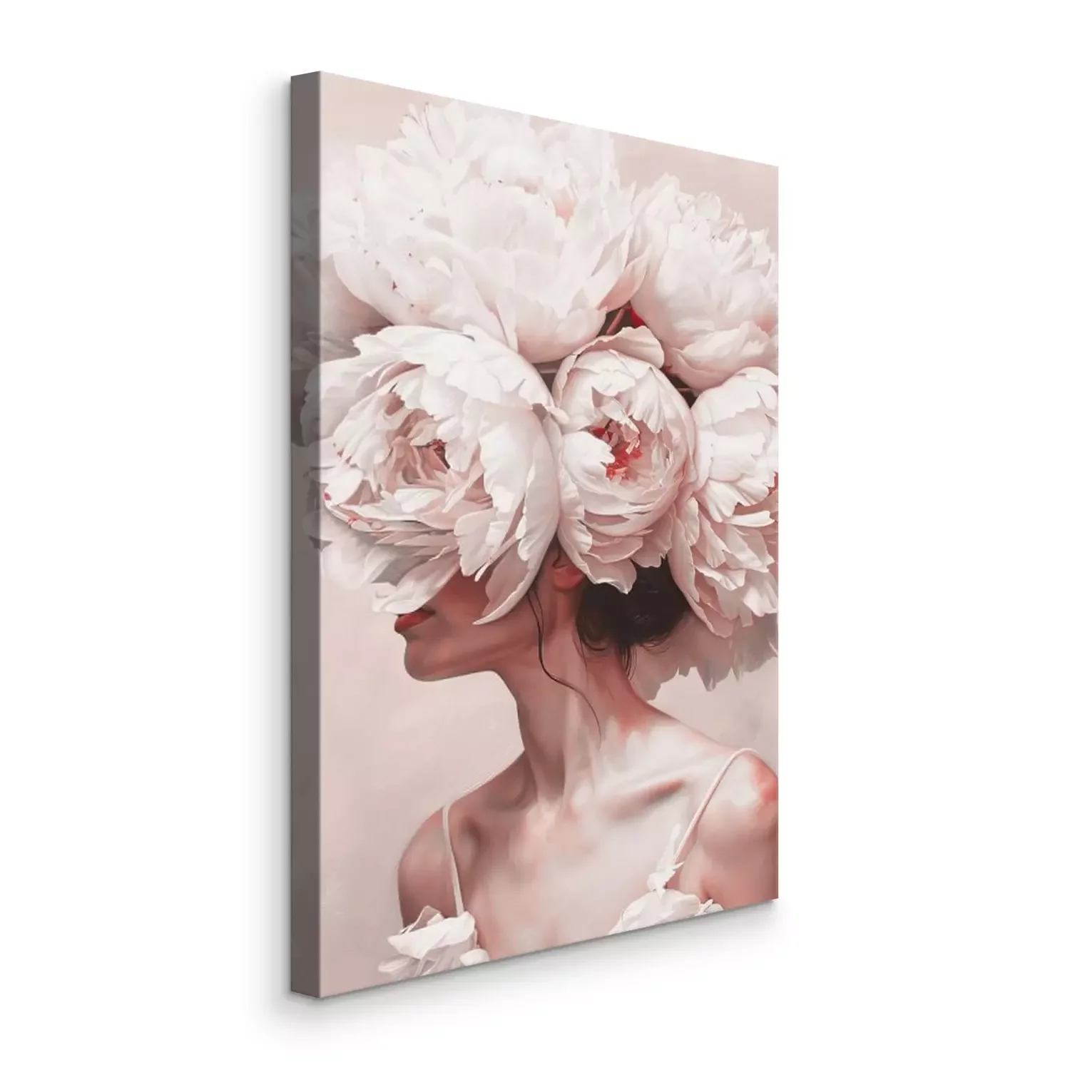 Porträt einer frau mit einem pfingstrosenkranz auf dem kopf