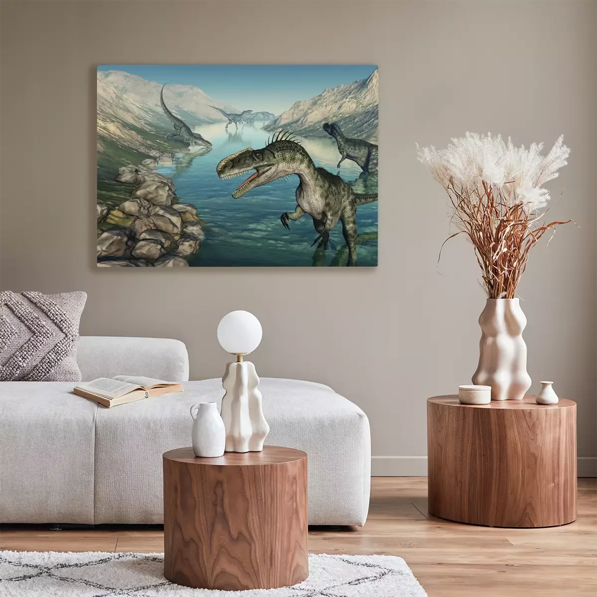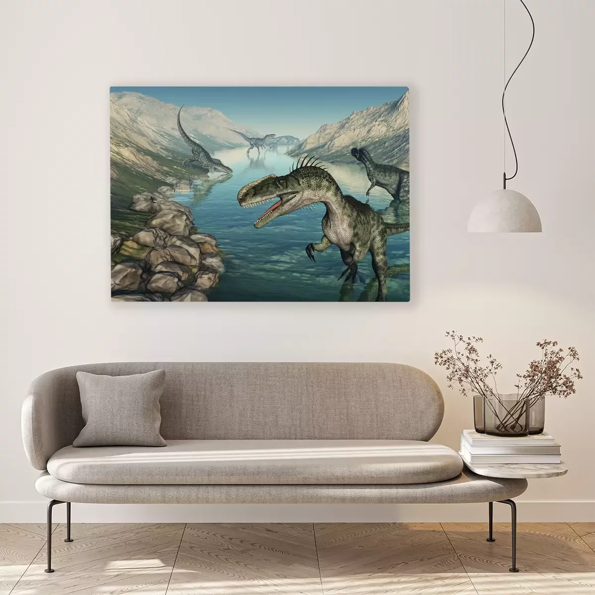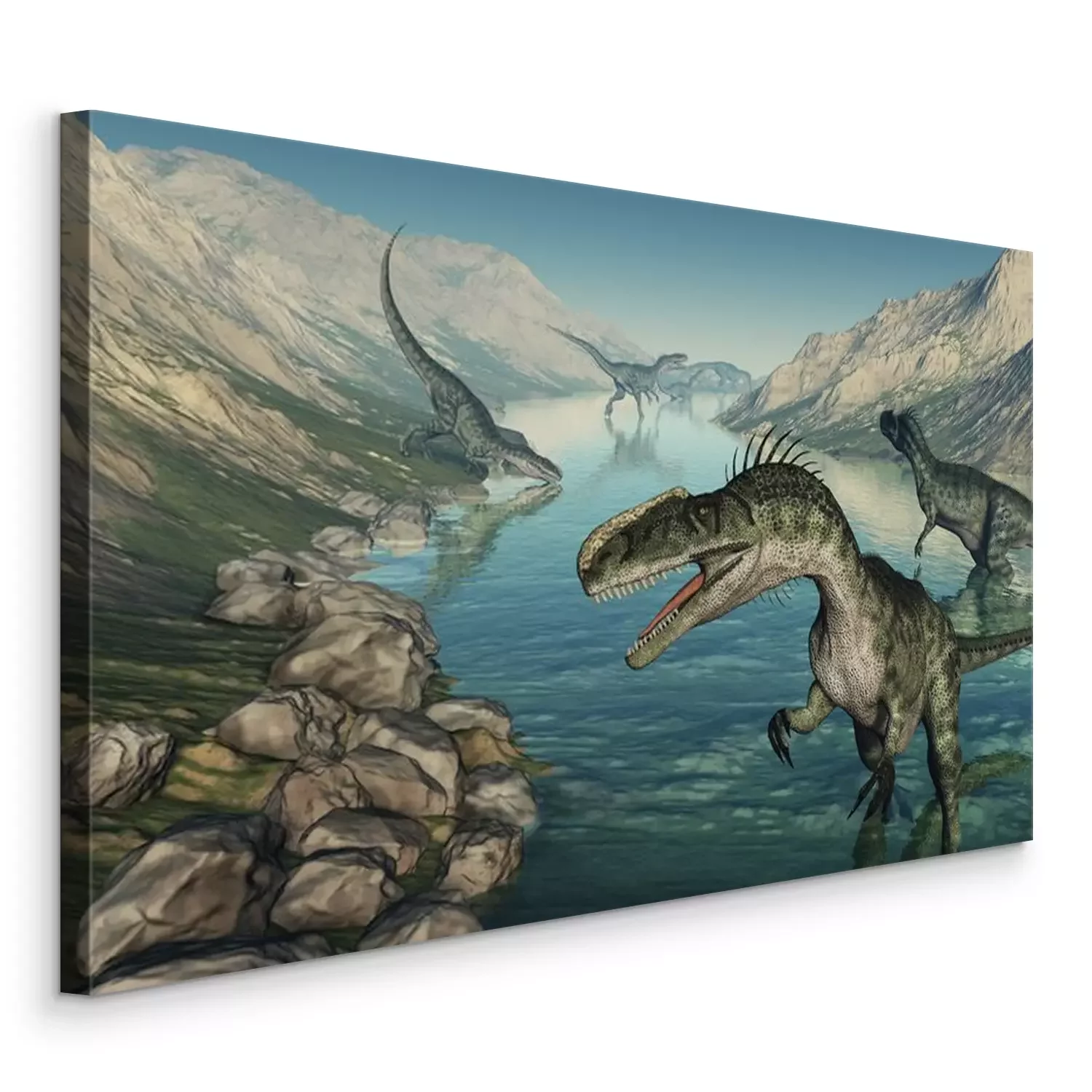 Pflanzenfressende Dinosaurier im Fluss bei Sonnenuntergang